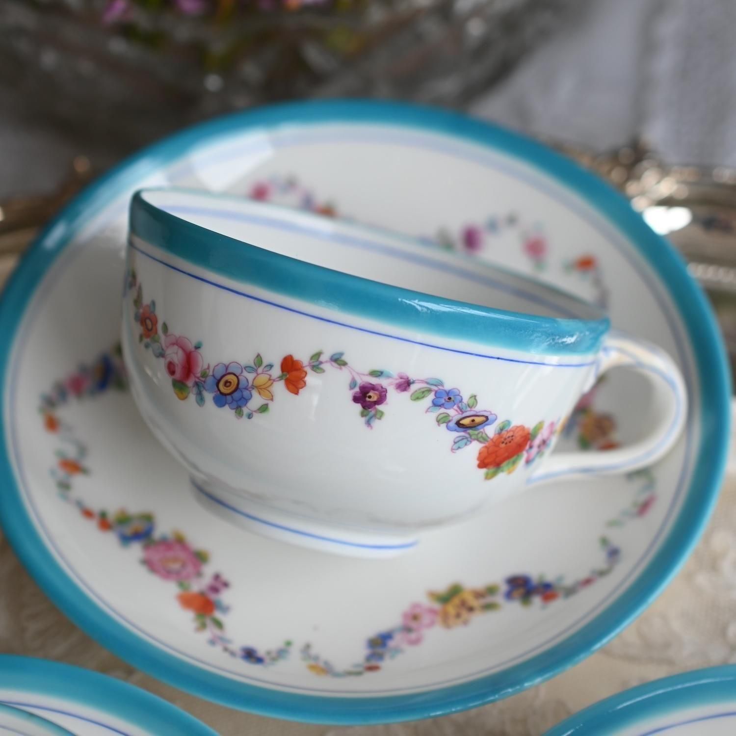 1900年初期 エインズレイ・ターコイズブルー模様とバラの絵柄のエレガントで可愛らしいティーカップ4点セット 単品 (送料込)