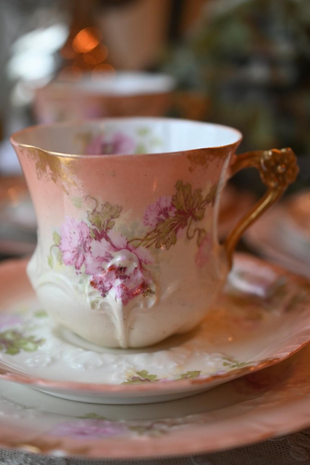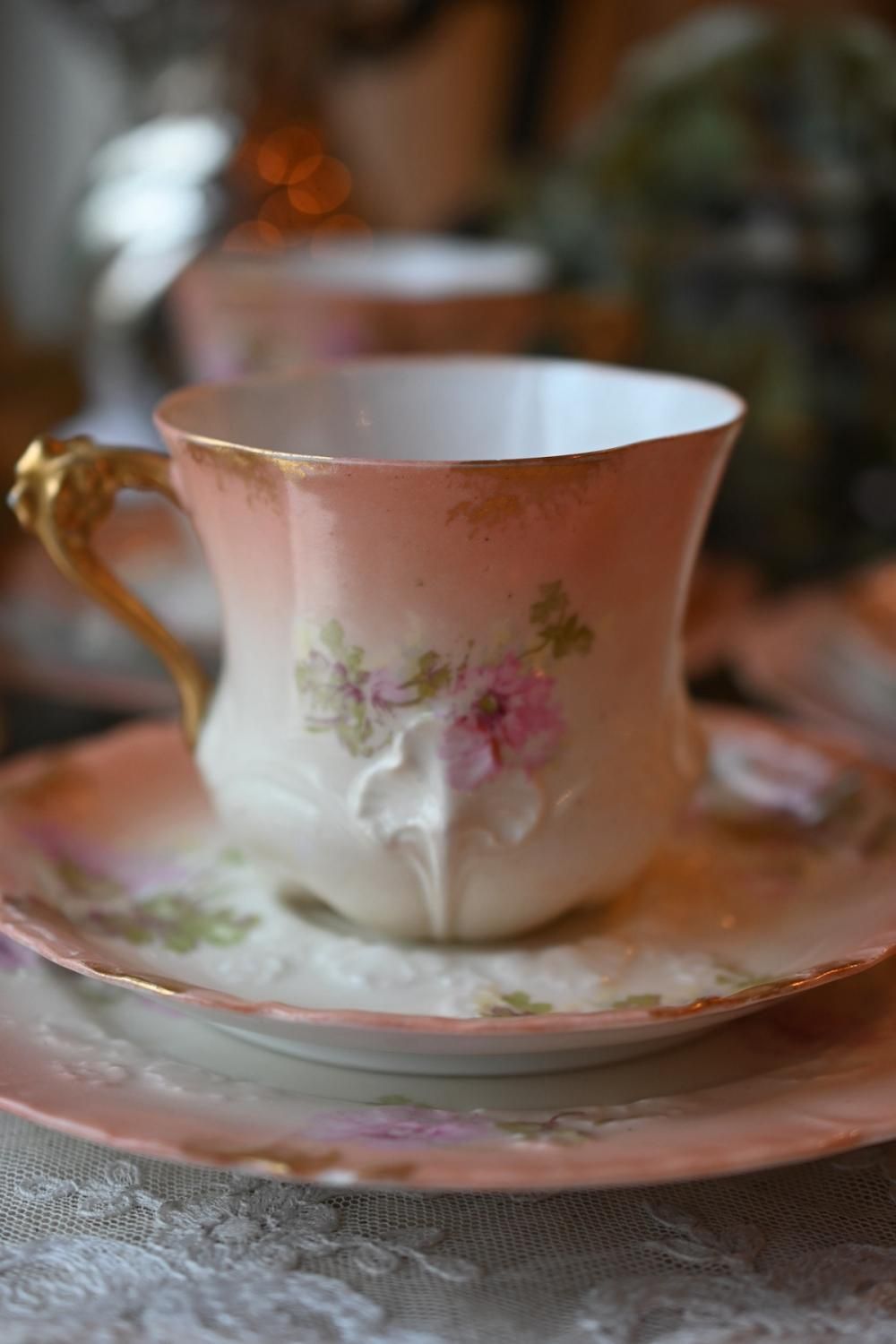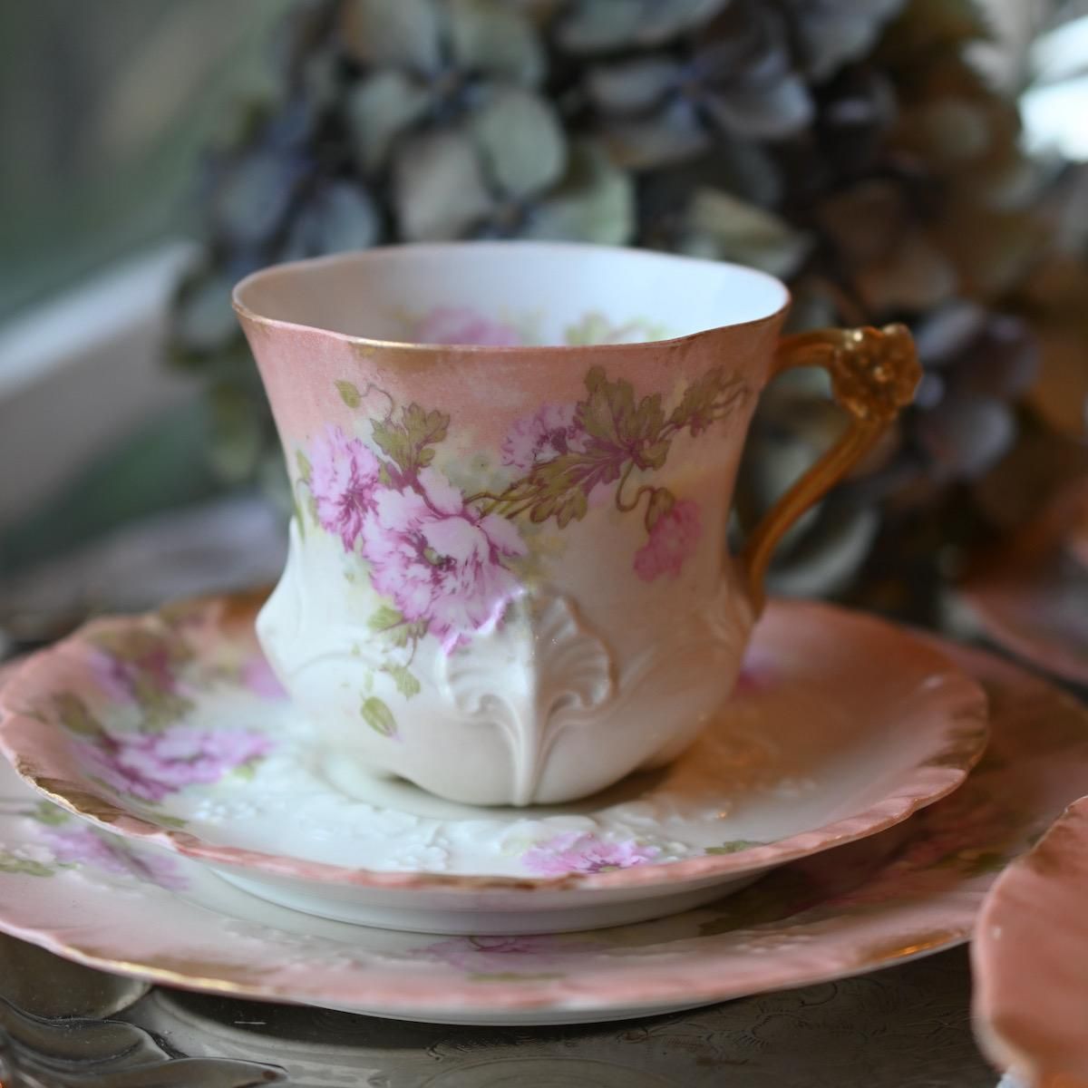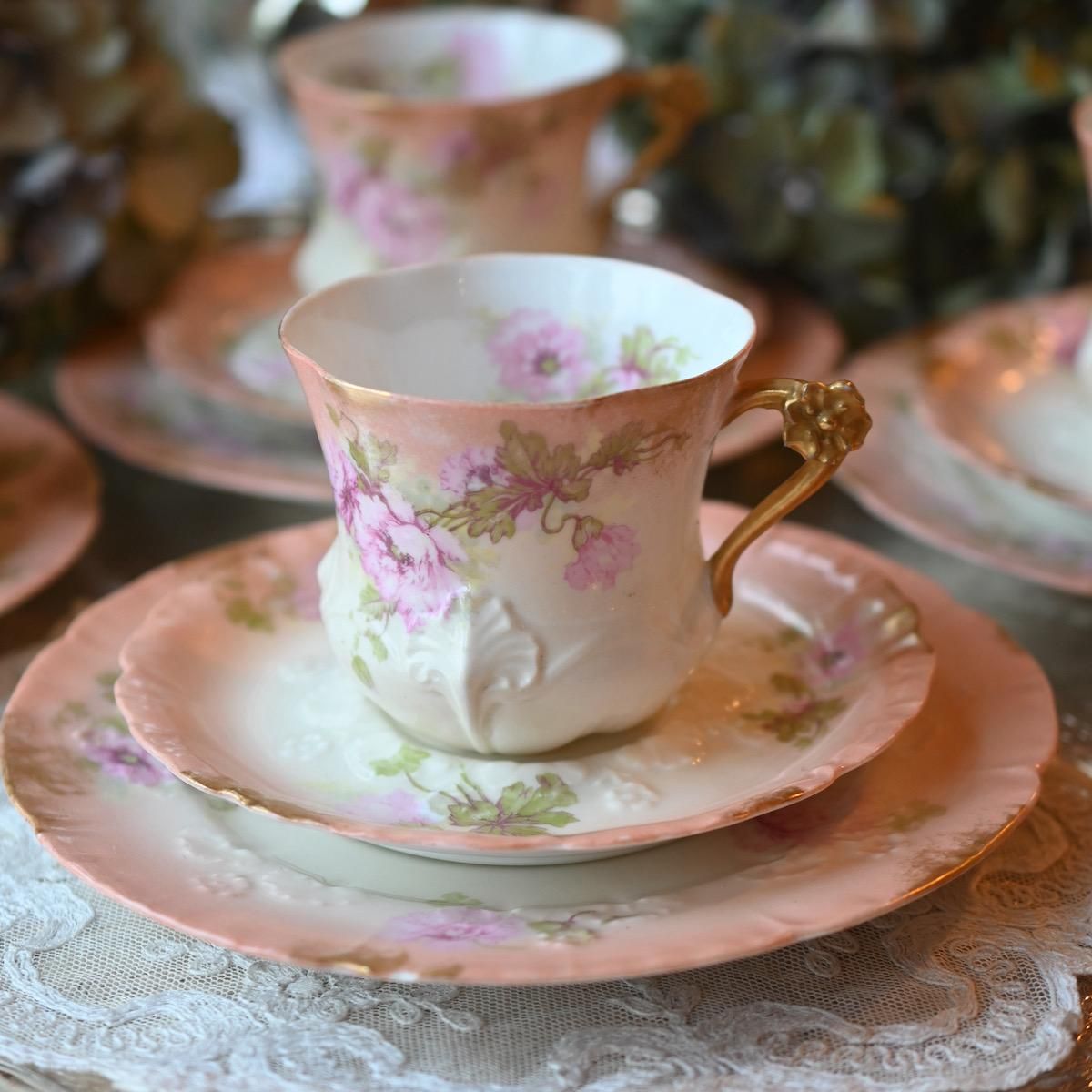 1910年代に作られたリモージュのブラッシュアイボリー・花柄のハンドルのついたティーカップトリオです。