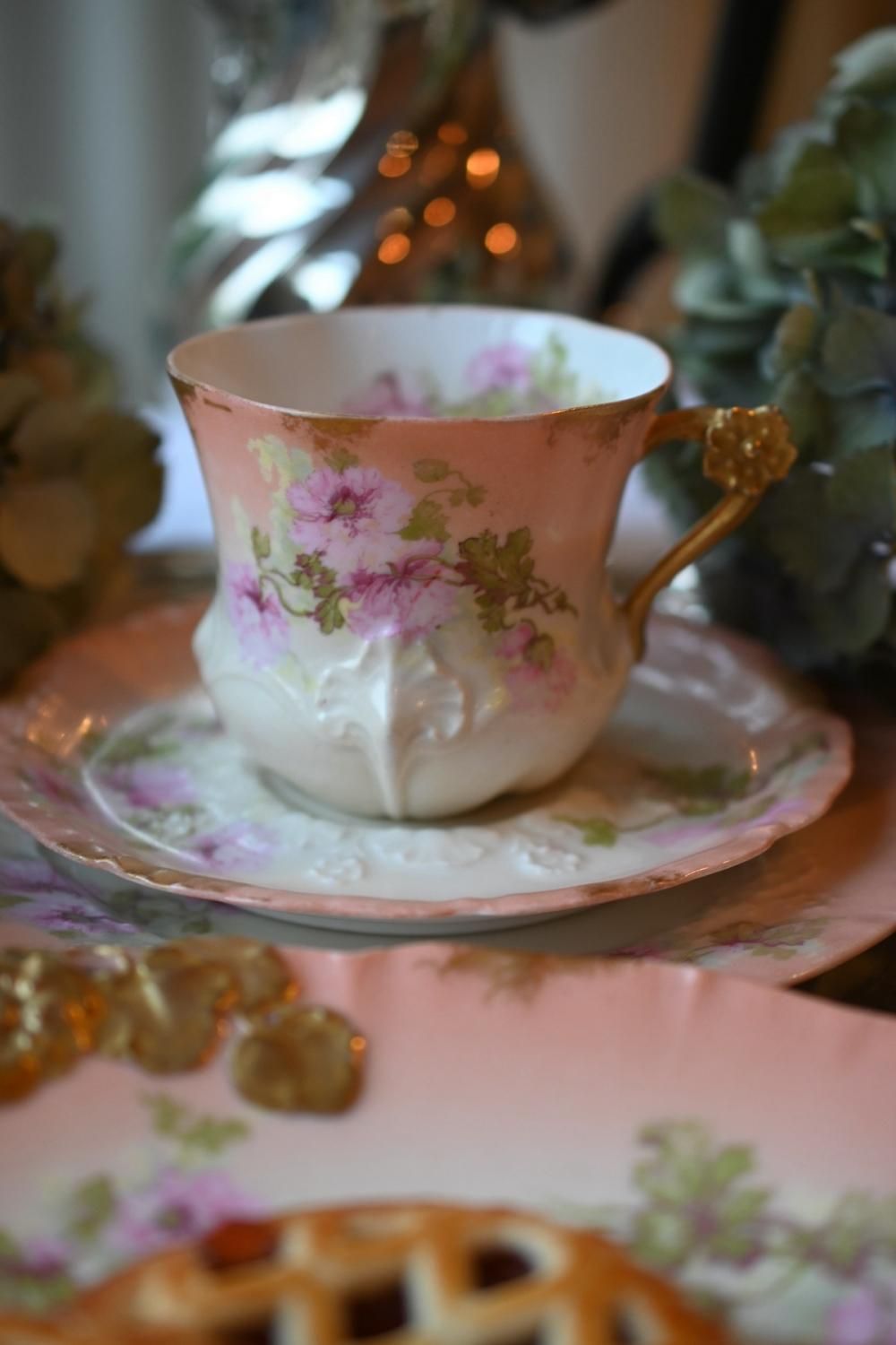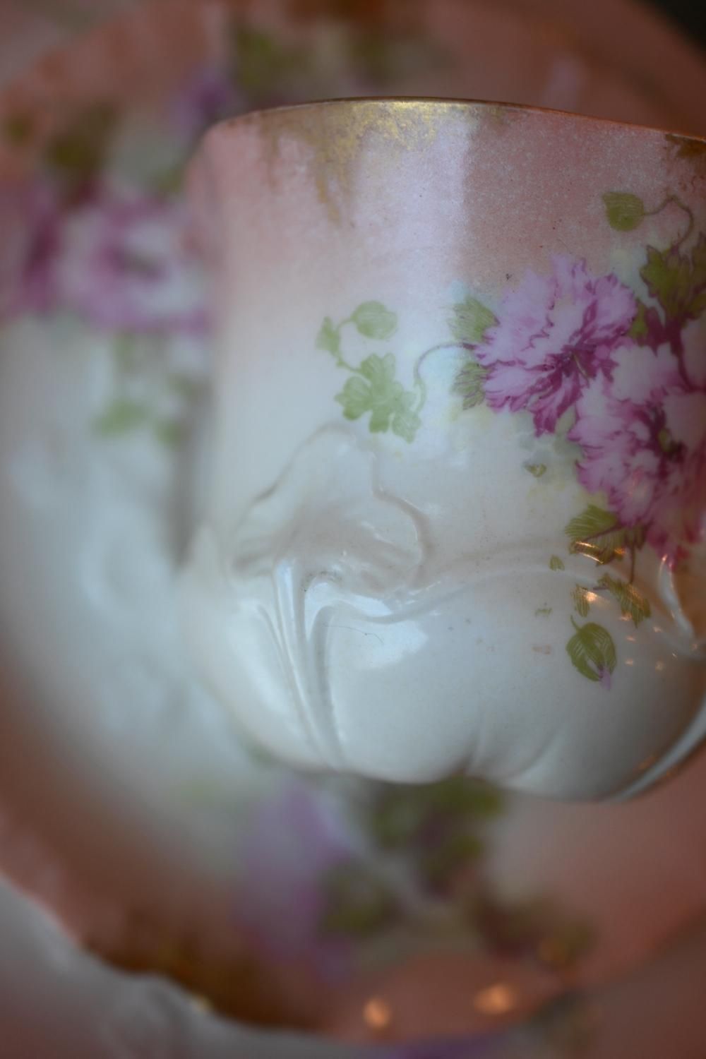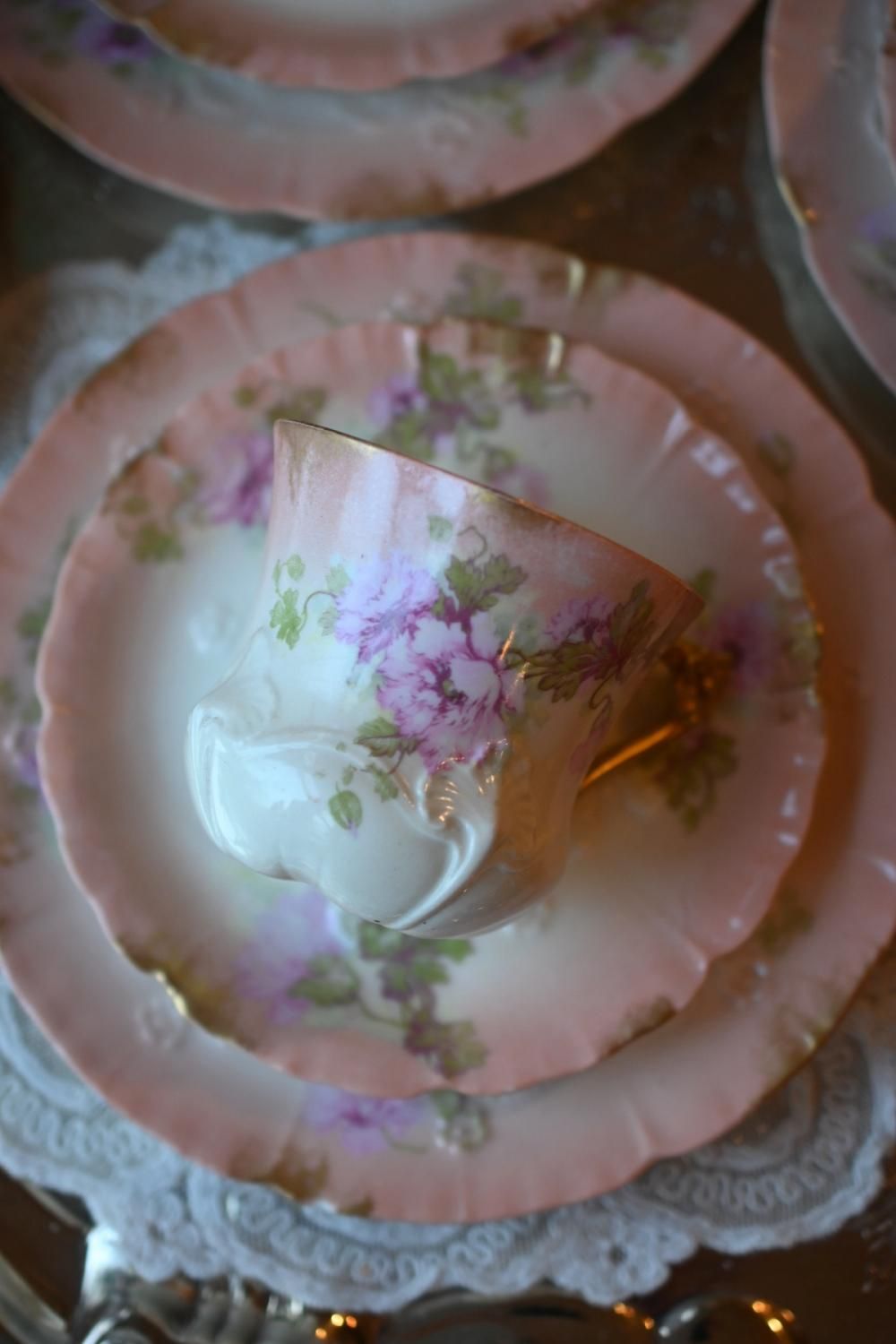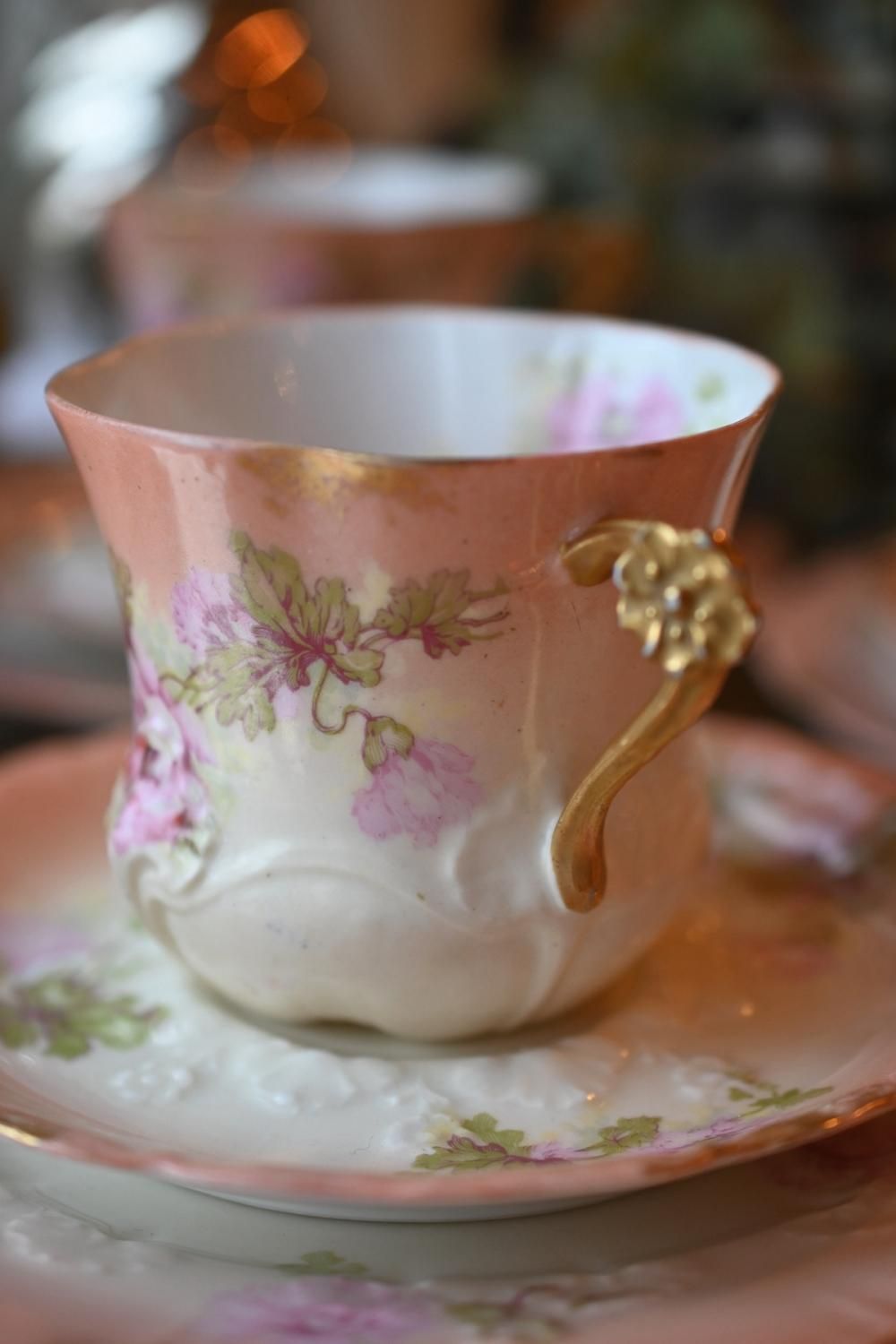 1910年代に作られたリモージュのブラッシュアイボリー・花柄のハンドルのついたティーカップトリオです。