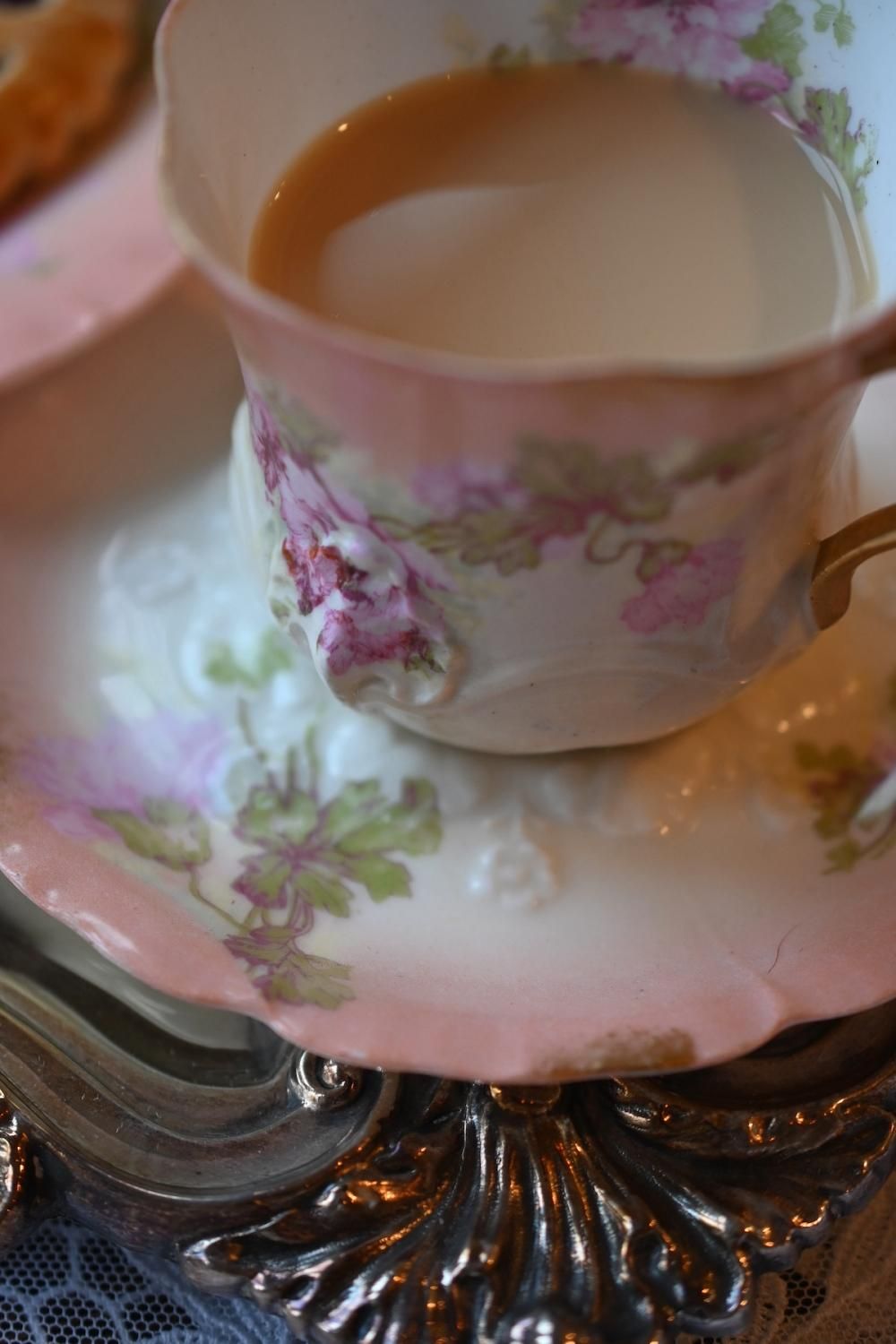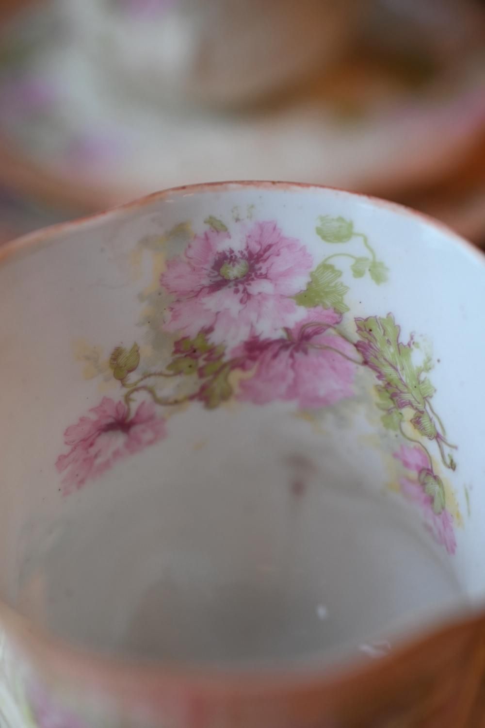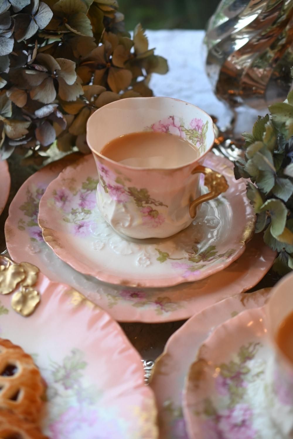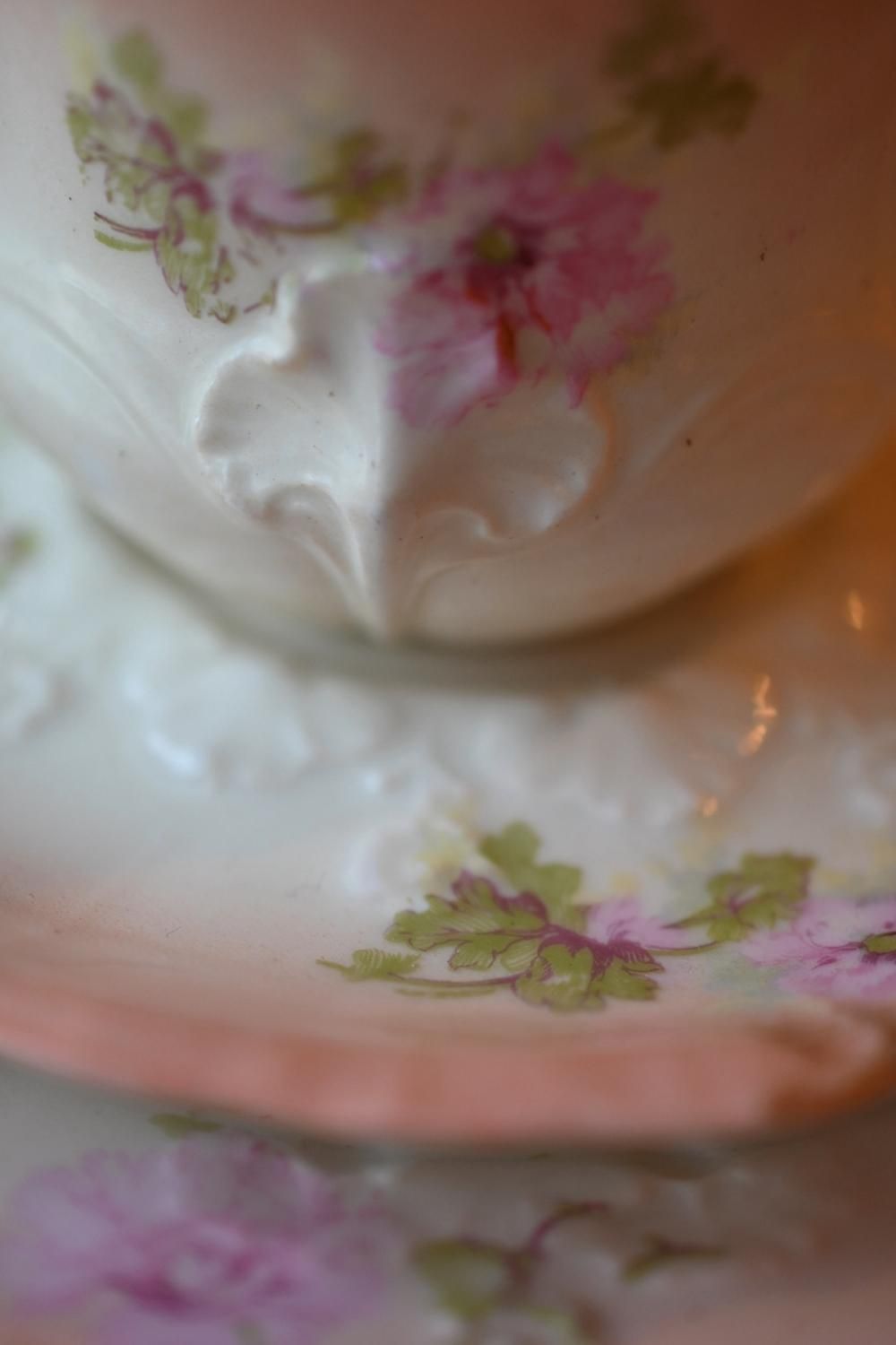 1910年代に作られたリモージュのブラッシュアイボリー・花柄のハンドルのついたティーカップトリオです。