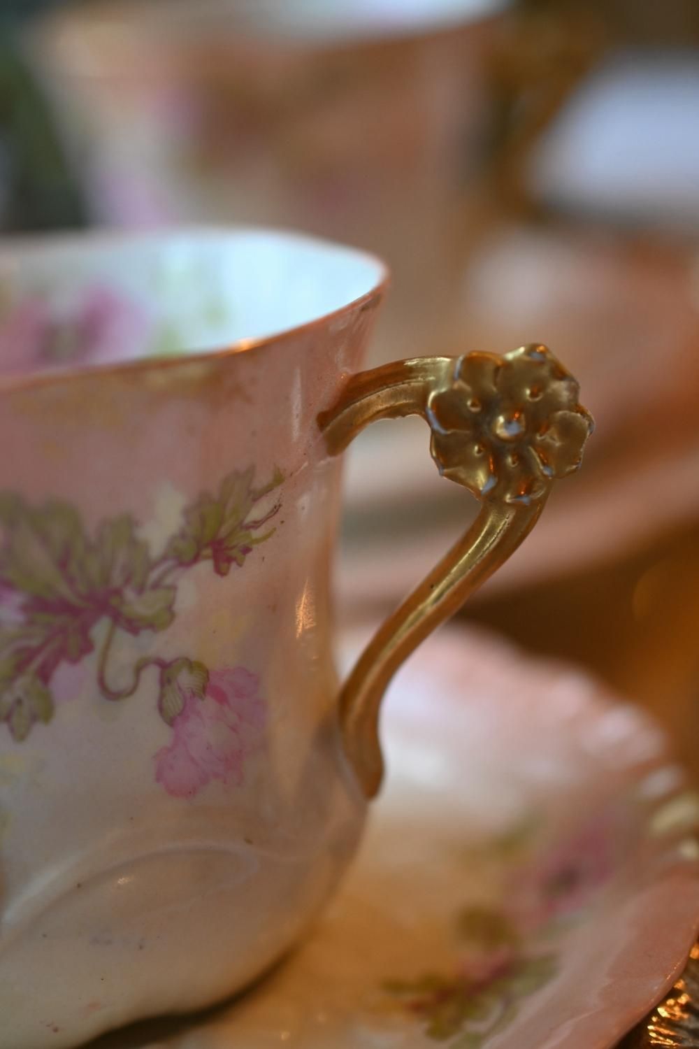 淡いアイボリー色に優しいピンク色がほんのりと付けられたお品です。金彩で塗られたハンドルはお花の模様で象られていてとても可愛らしいです。カップの形もまるでチューリップのような形をしています。