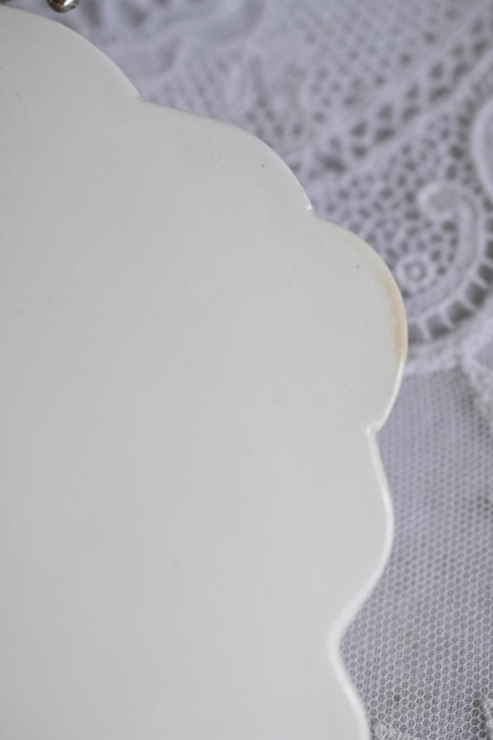 状態 ☆☆☆☆ ハンドル近くの縁に一部茶色い部分がありますが釉薬の下にあたります。ブルーの塗料の付着跡が小さく一箇所あります。縁の金彩に多少のスレがございますが、全体的に状態の良いお品です