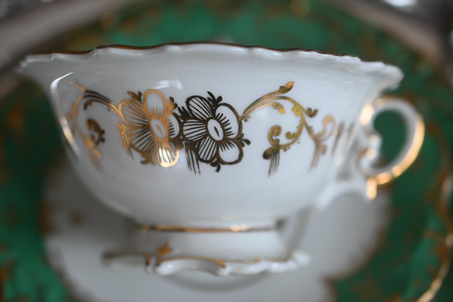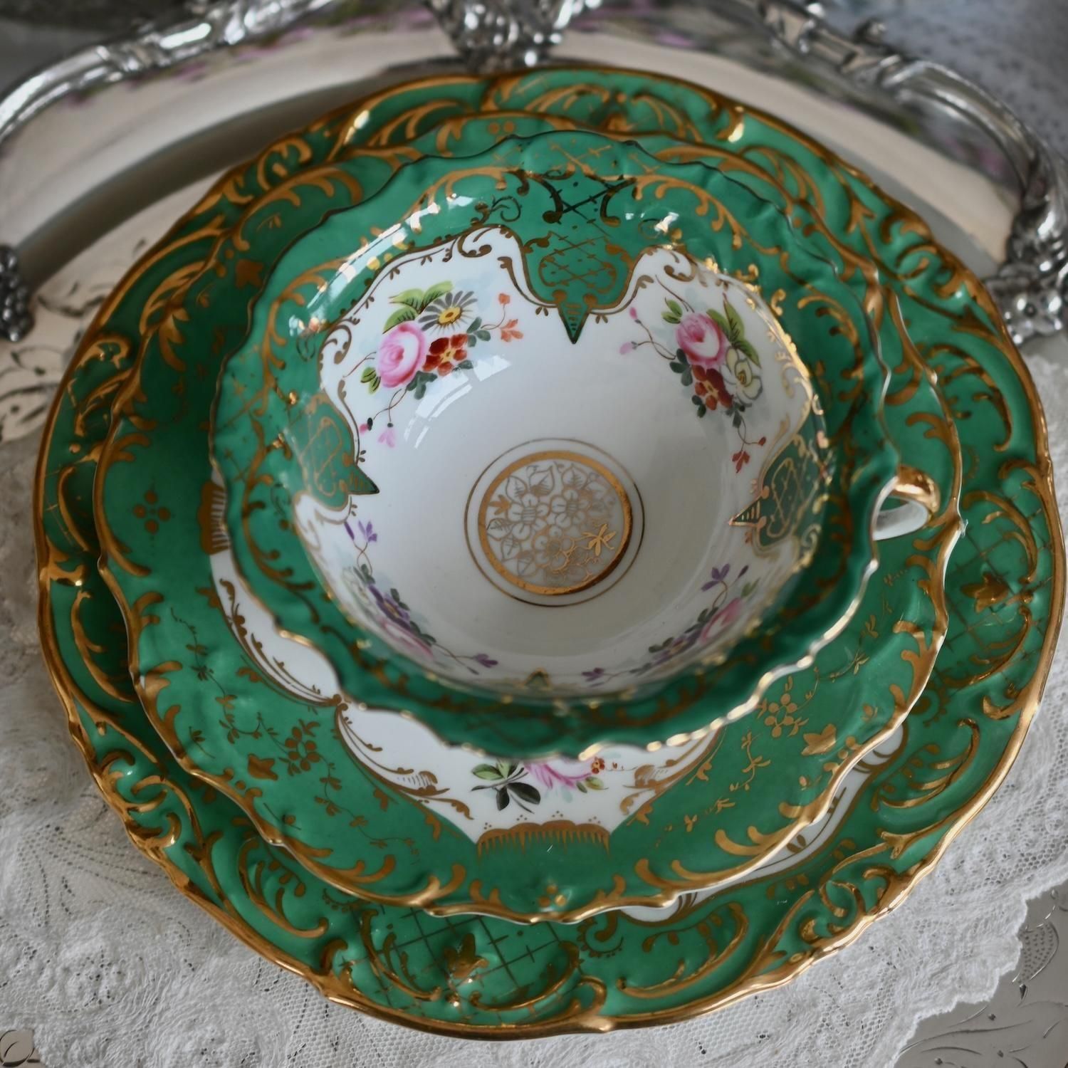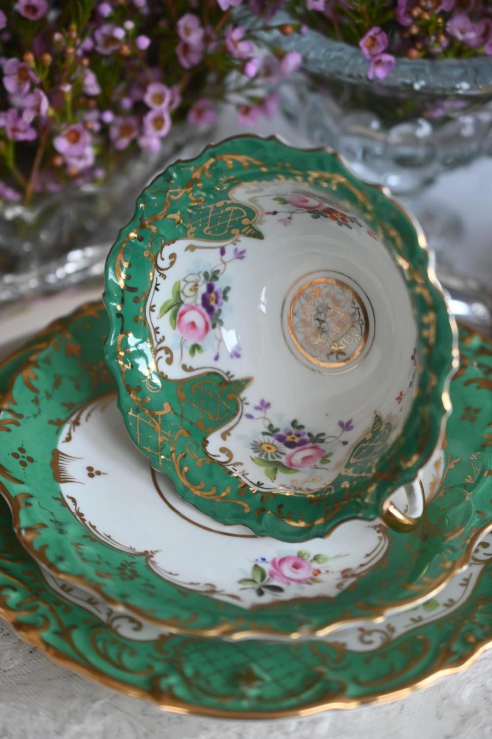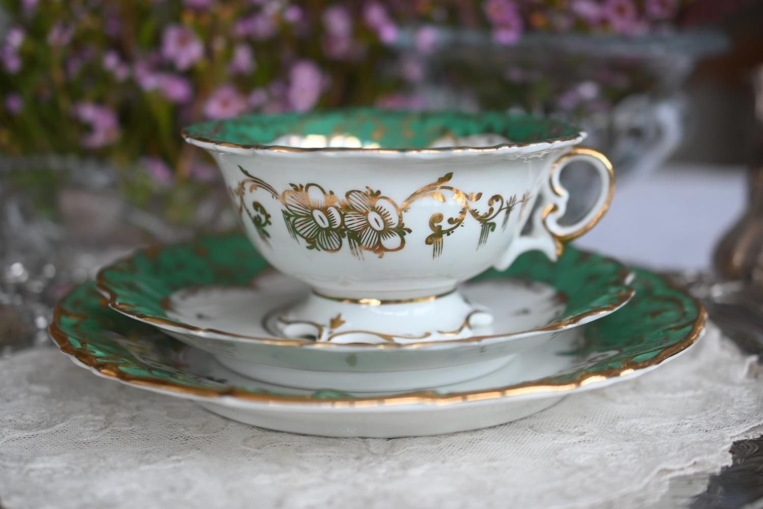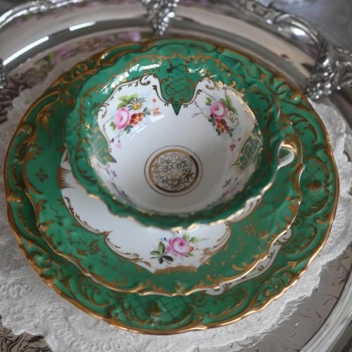 コールポートのバットウィングに似た金彩がたっぷり使われたゴージャスなティーカップトリオになります。