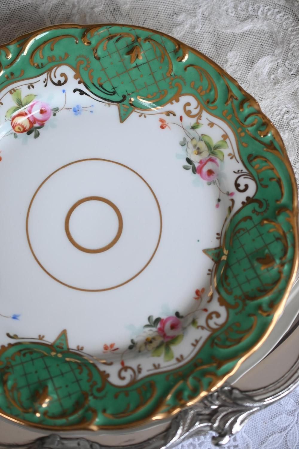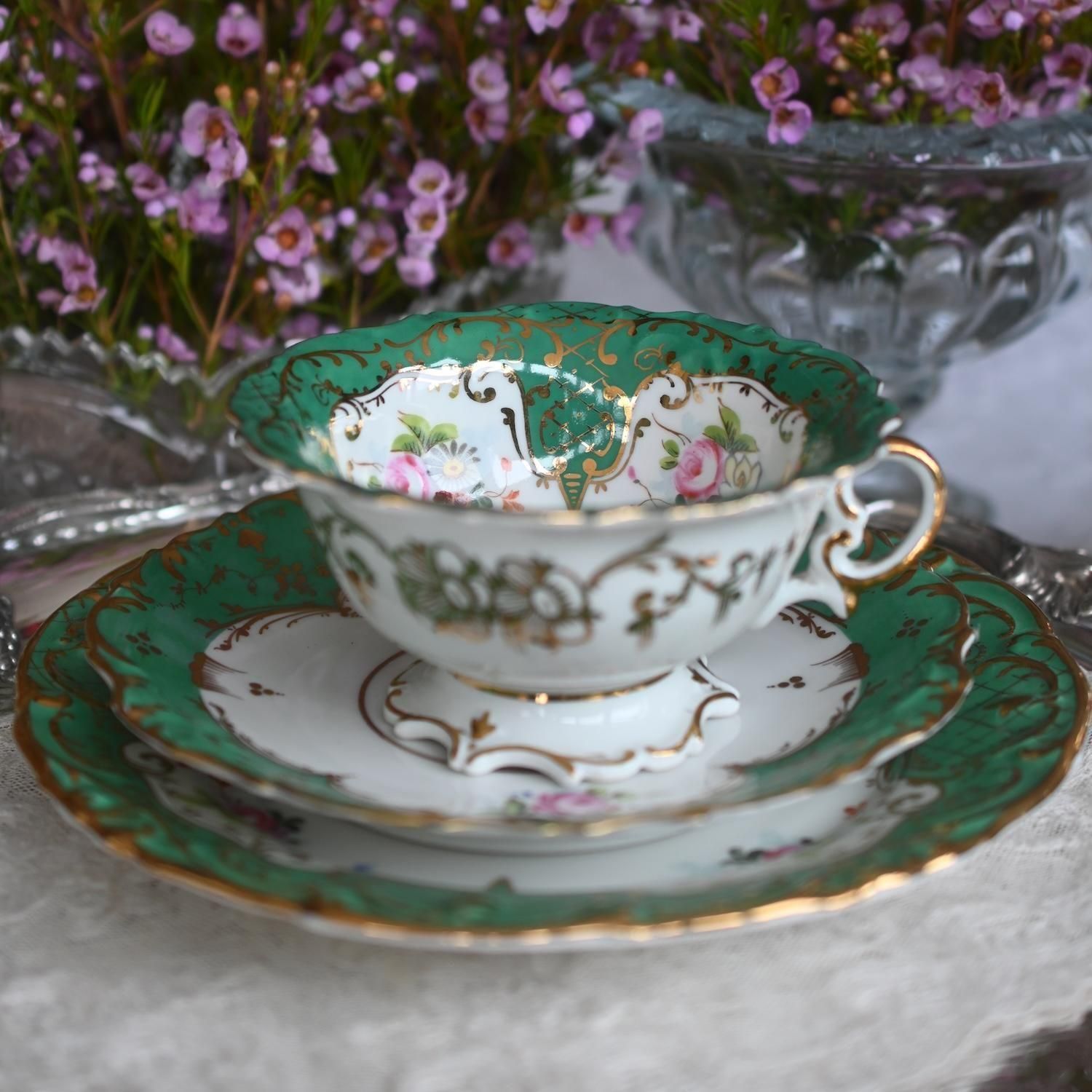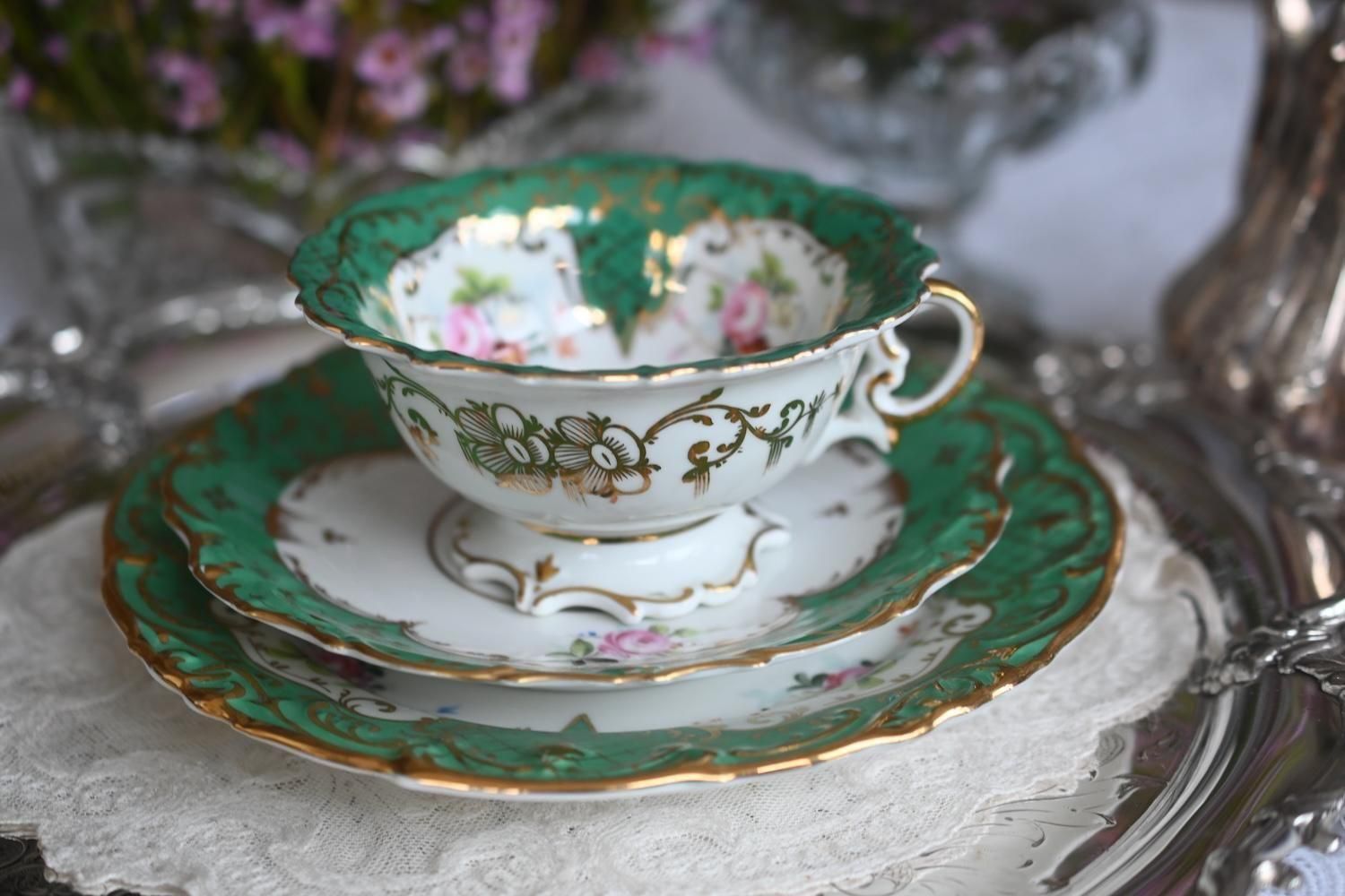 ポルトガルで1824年に創立したヴィスタ・アレグレのティーカップトリオになります。ほとんど見分けるのが難しいほど似ている絵柄ですが、ソーサーだけ、カップとプレートと違う絵柄になります。