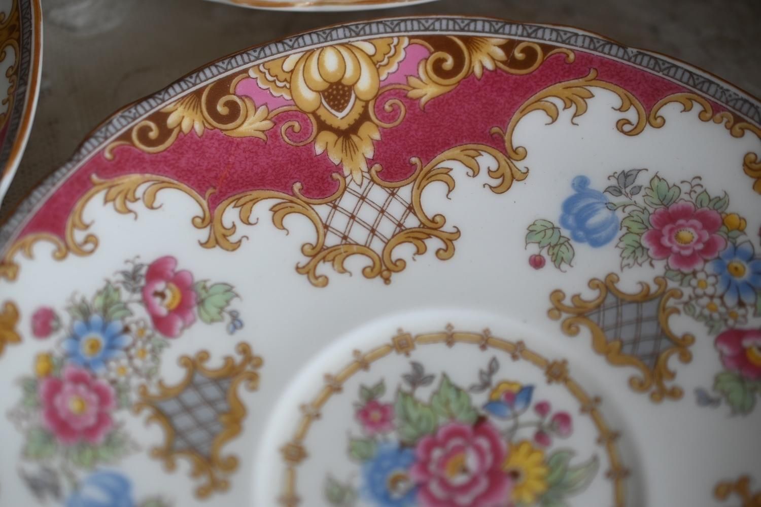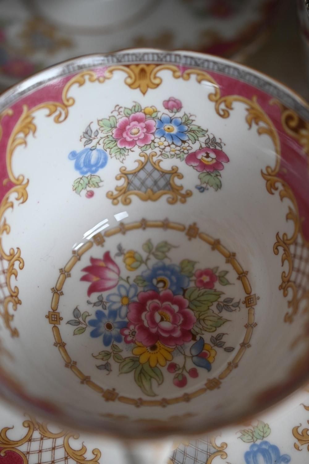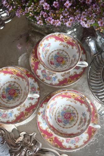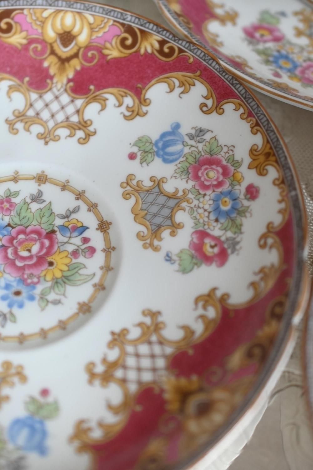 濃いめのピンクの色合いにレースのような模様が描かれ、古典的な優美なスタイルと色彩が美しいセットです。