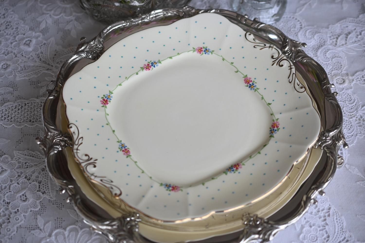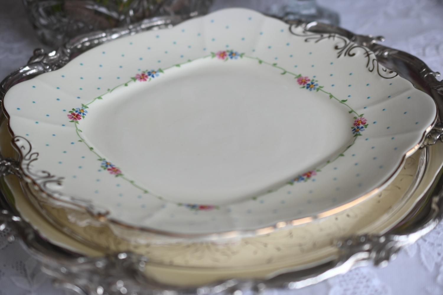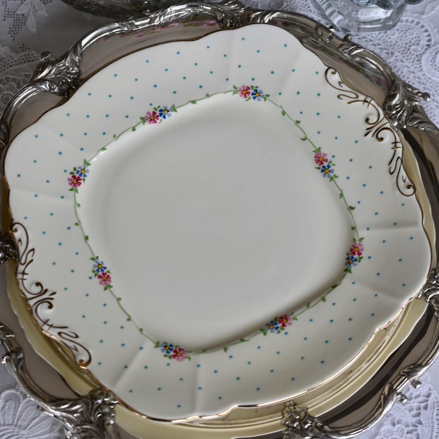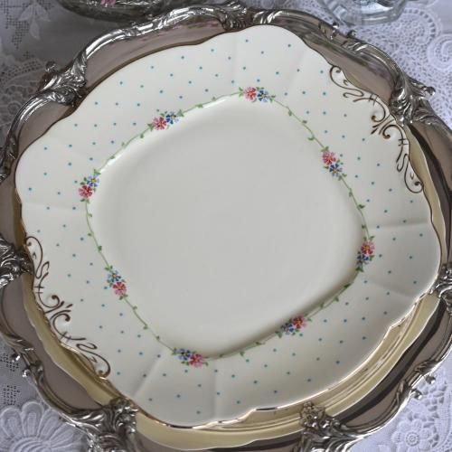 1930年代・パラゴンのアールデコデザイン、イエロー地にターコイズのドットとフラワーバンドが可愛らしいサンドイッチプレートとなります。