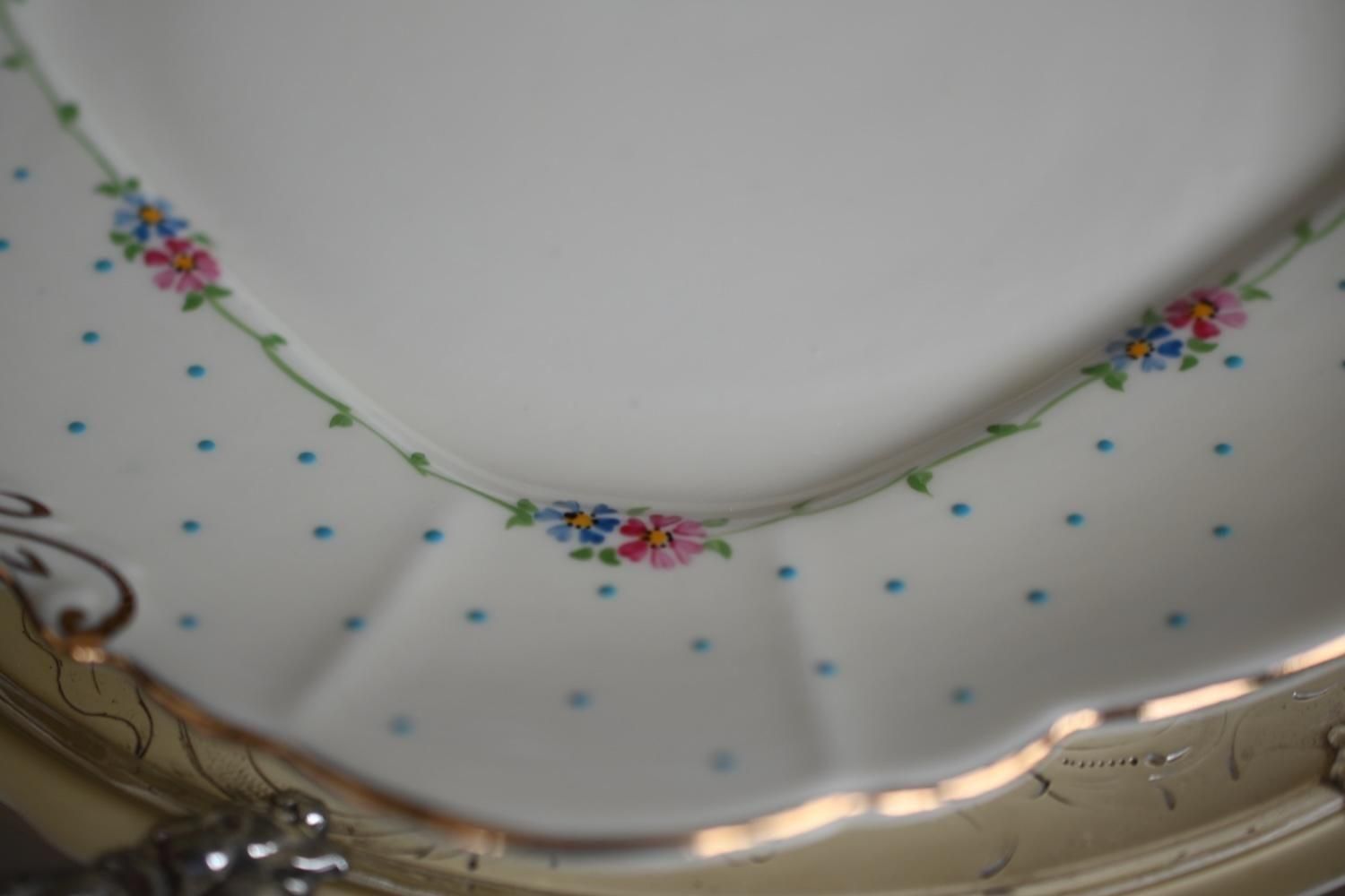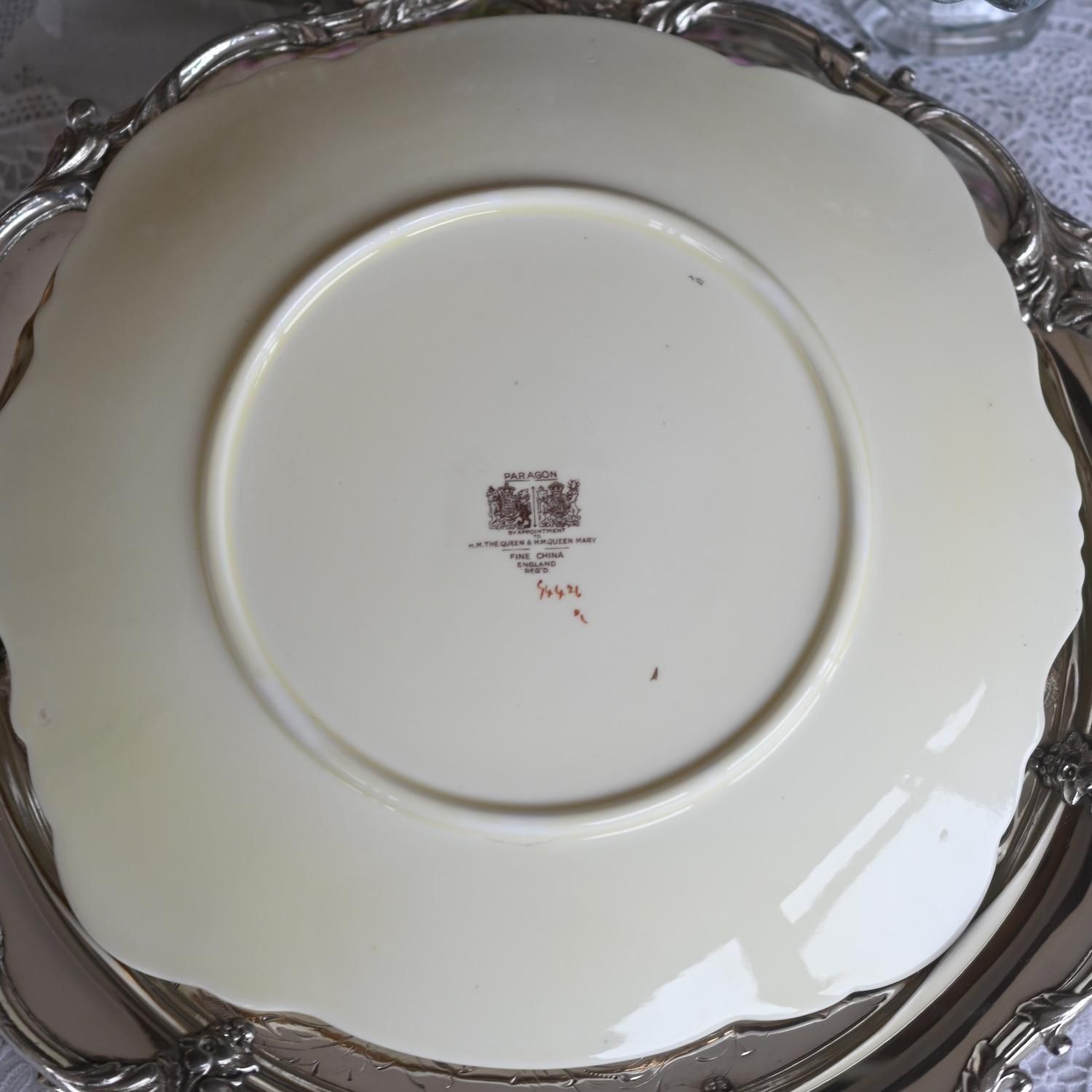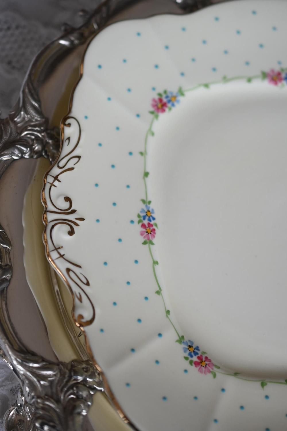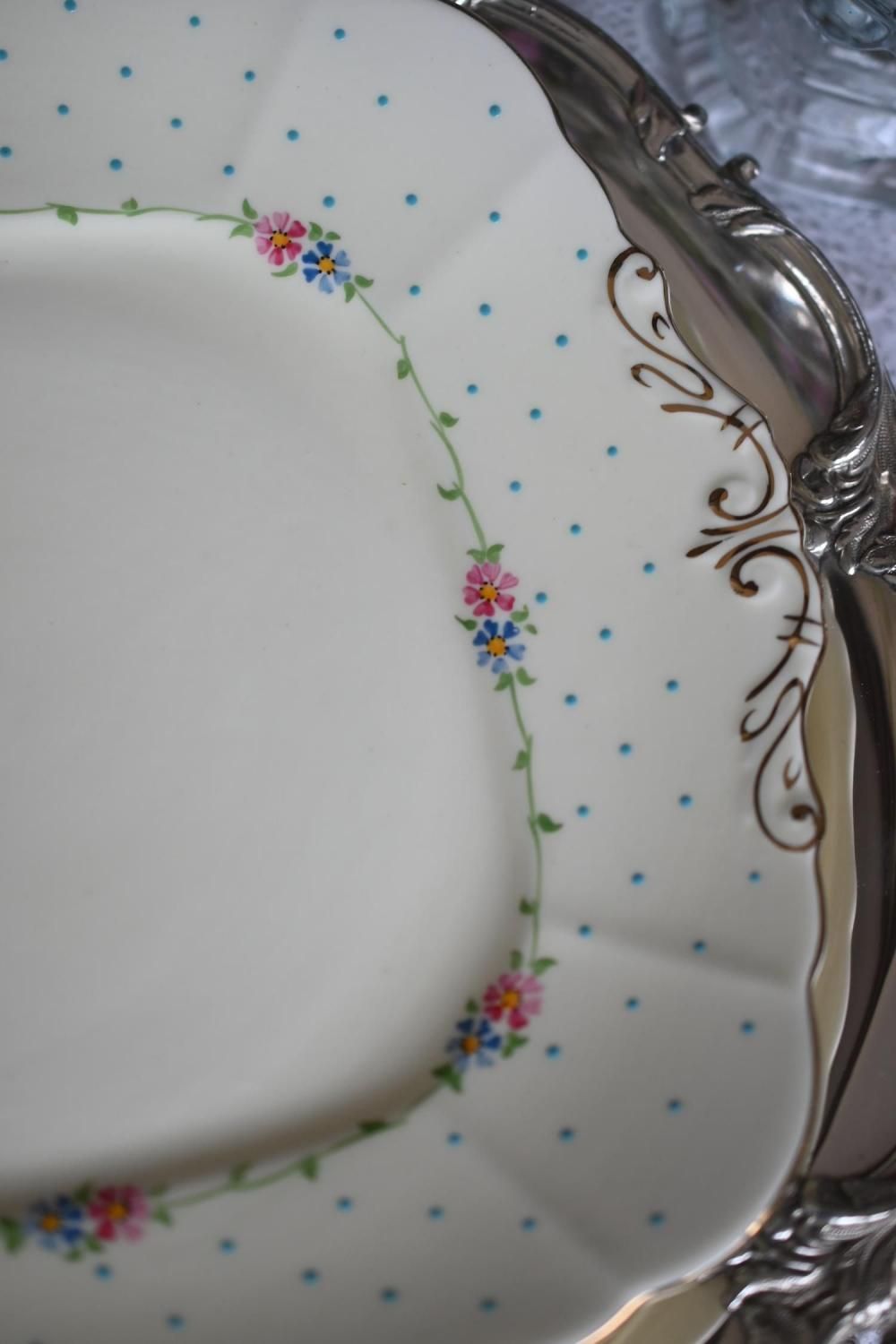 1930年代・パラゴンのアールデコデザイン、イエロー地にターコイズのドットとフラワーバンドが可愛らしいサンドイッチプレートとなります。