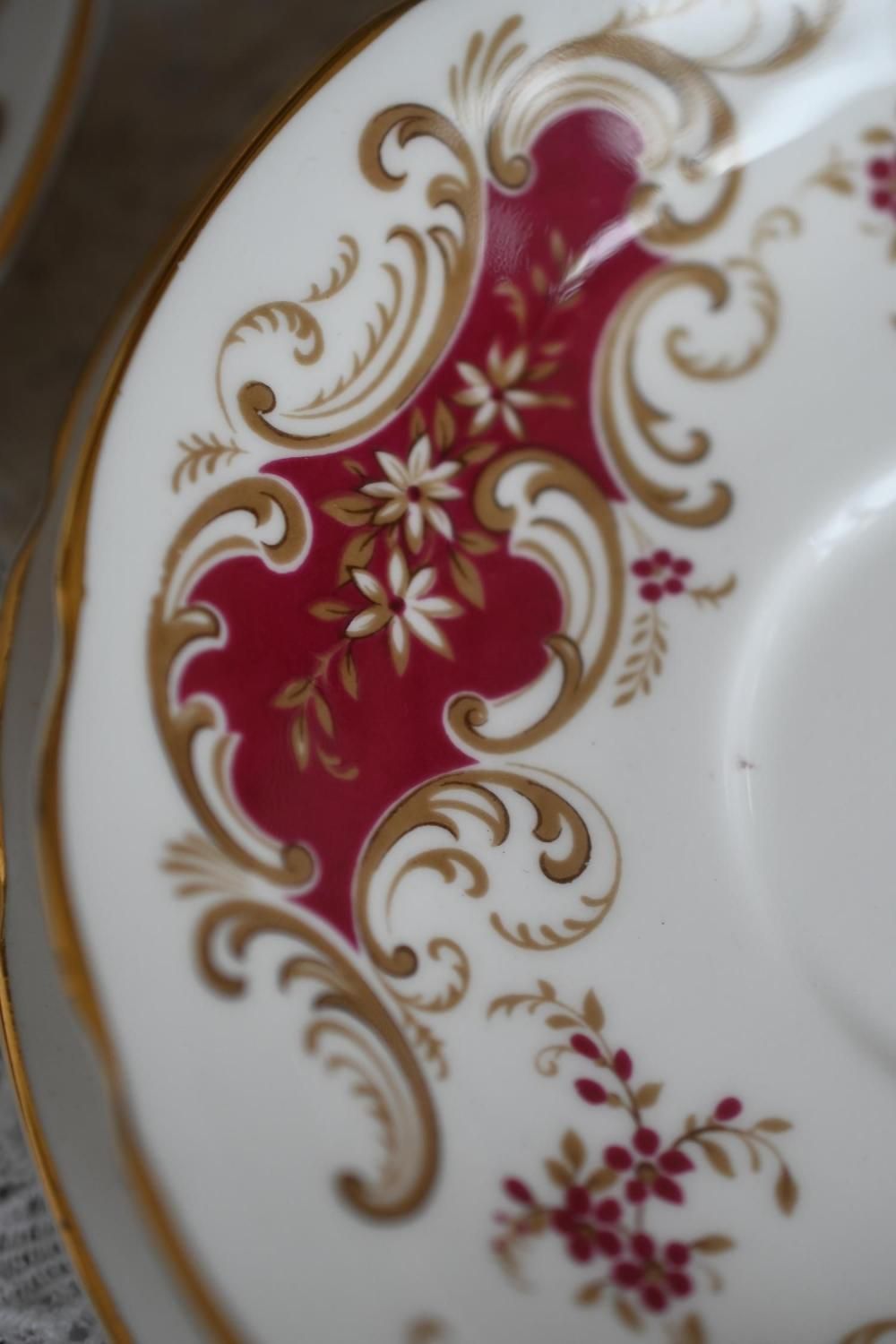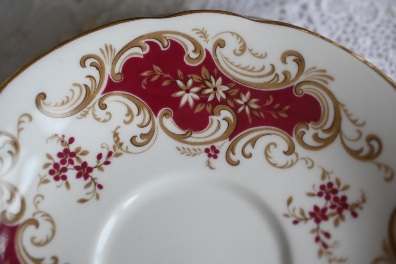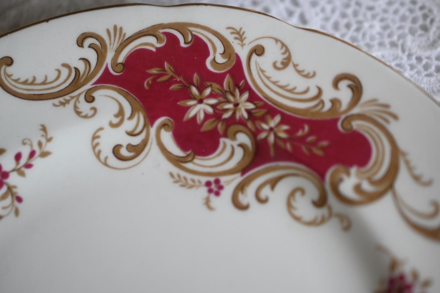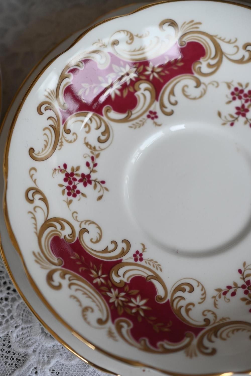 マルーン色と金彩で縁取られています。スクロール模様で囲まれたロココ調のフレームはブラウンカラーが用いられ、クラシックな雰囲気のお品です。お花たちがマルーン色で塗り込まれたフレームの中から外を眺めているようにも見えます。真っ白な磁とマルーン色のコントラストが美しく、パラゴンの気品あるお品です。