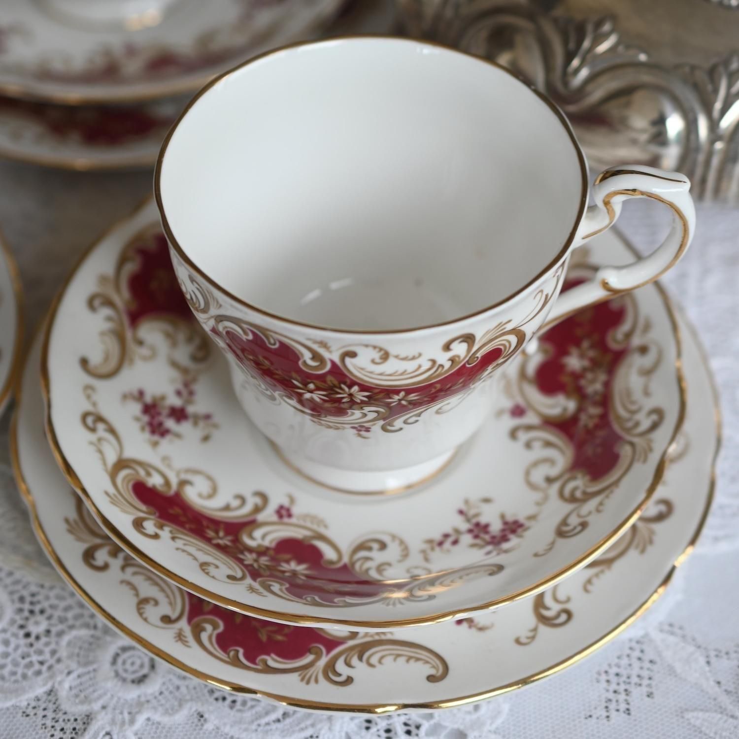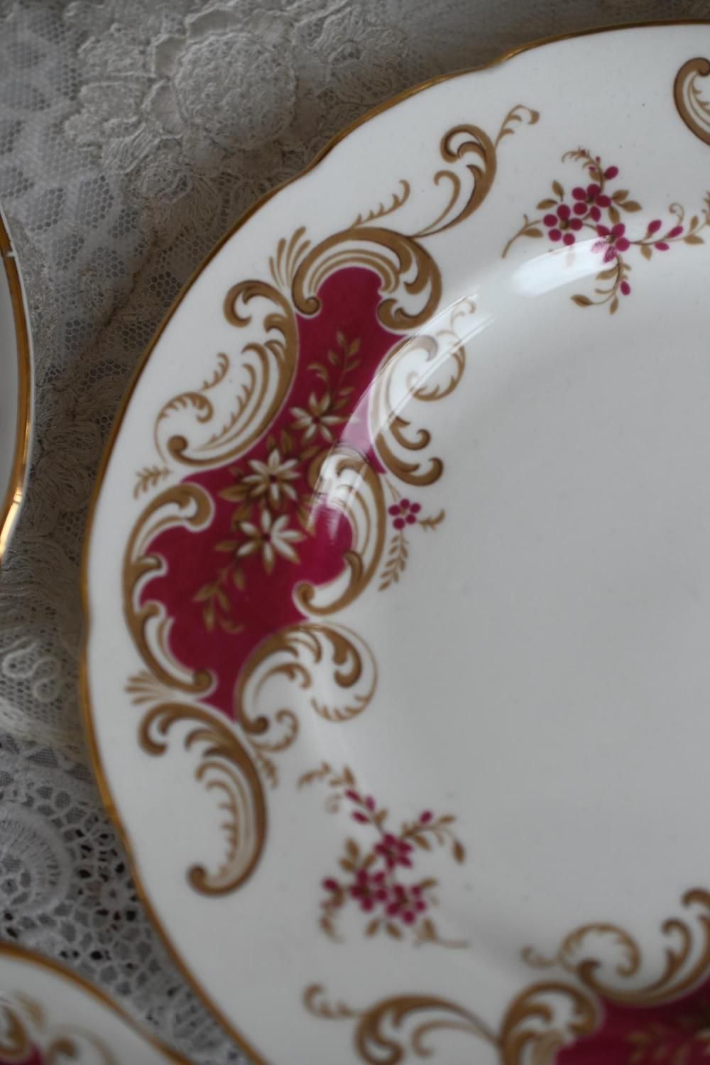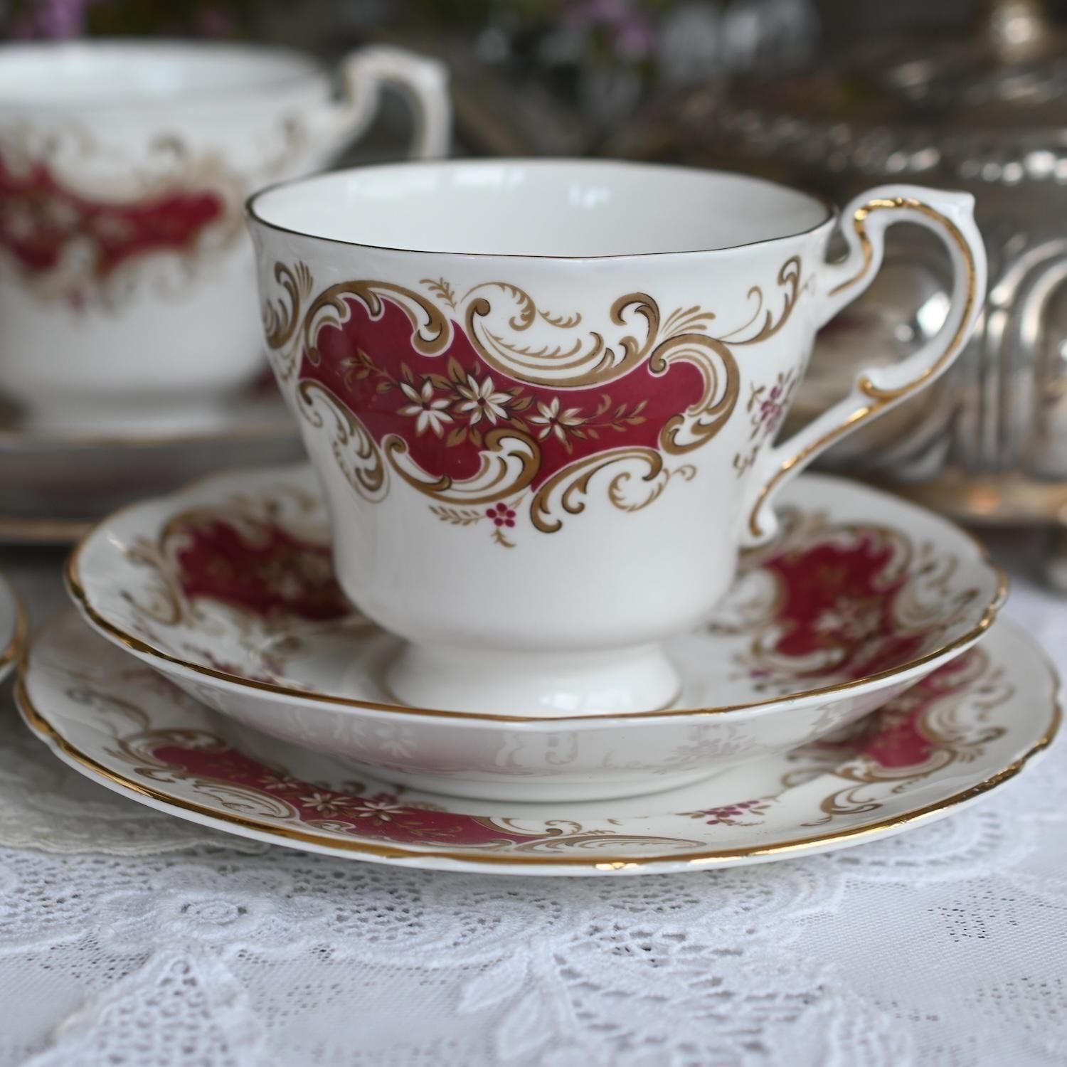 マルーン色と金彩で縁取られています。スクロール模様で囲まれたロココ調のフレームはブラウンカラーが用いられ、クラシックな雰囲気のお品です。お花たちがマルーン色で塗り込まれたフレームの中から外を眺めているようにも見えます。真っ白な磁とマルーン色のコントラストが美しく、パラゴンの気品あるお品です。