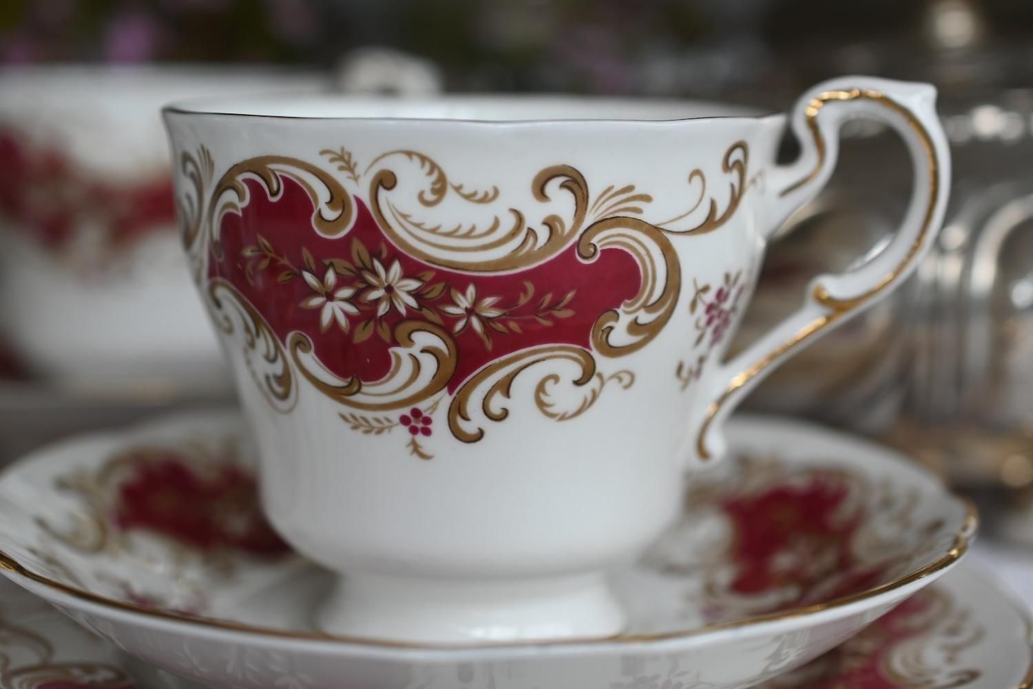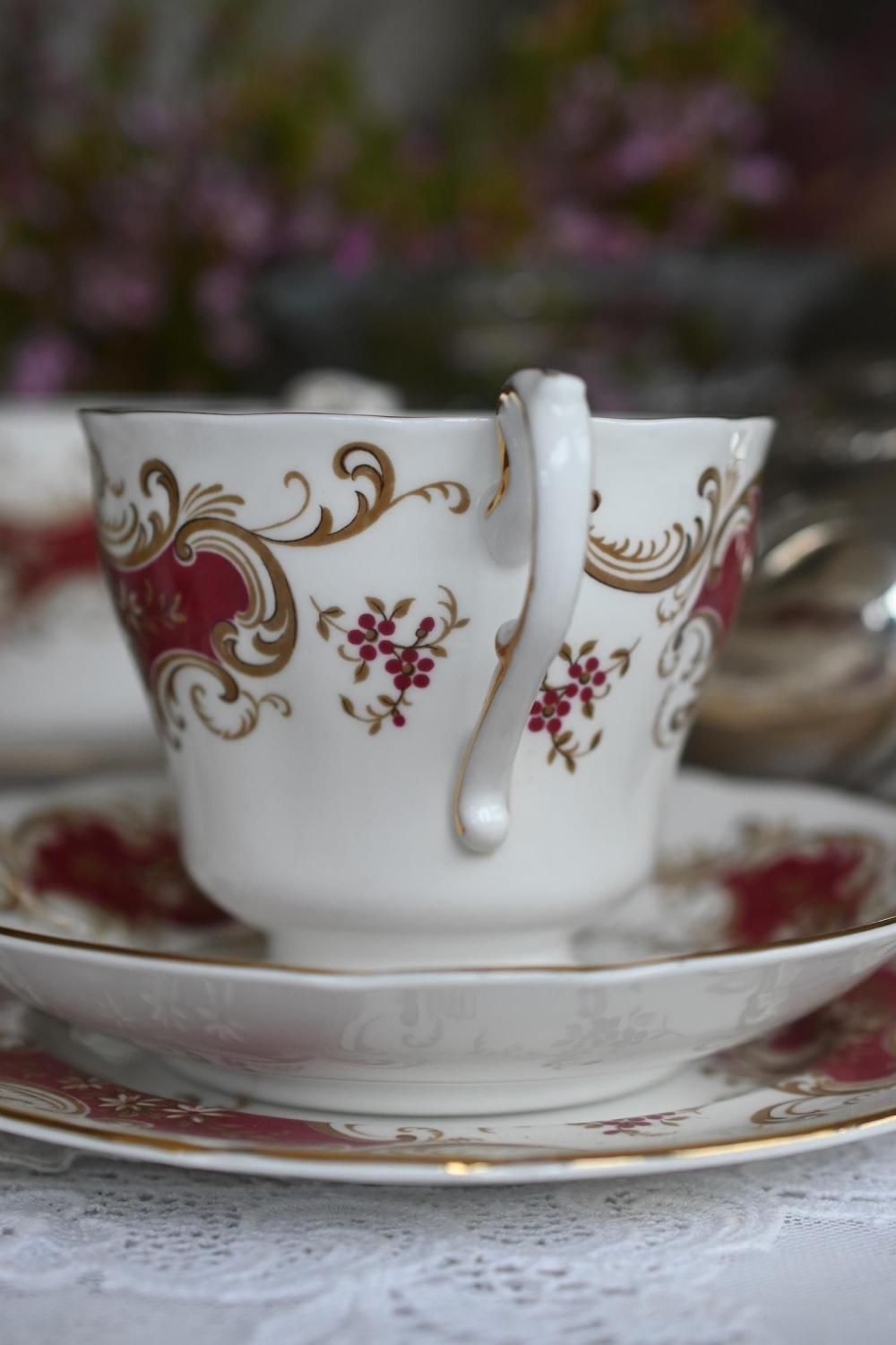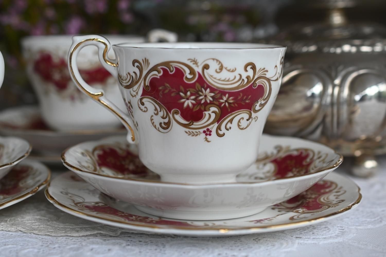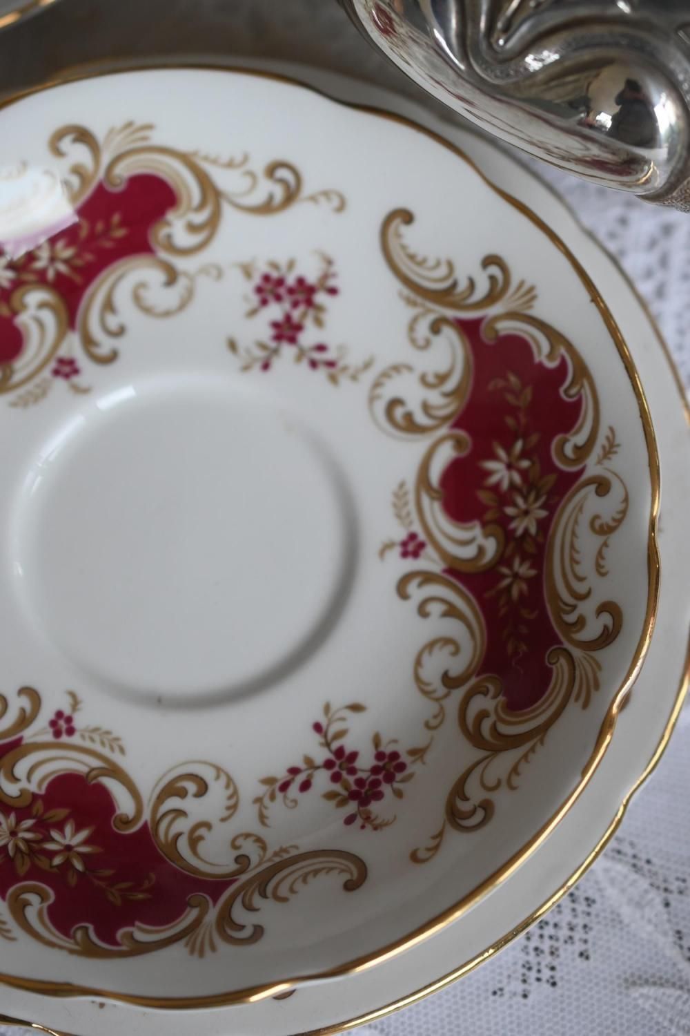 マルーン色と金彩で縁取られています。スクロール模様で囲まれたロココ調のフレームはブラウンカラーが用いられ、クラシックな雰囲気のお品です。お花たちがマルーン色で塗り込まれたフレームの中から外を眺めているようにも見えます。真っ白な磁とマルーン色のコントラストが美しく、パラゴンの気品あるお品です。