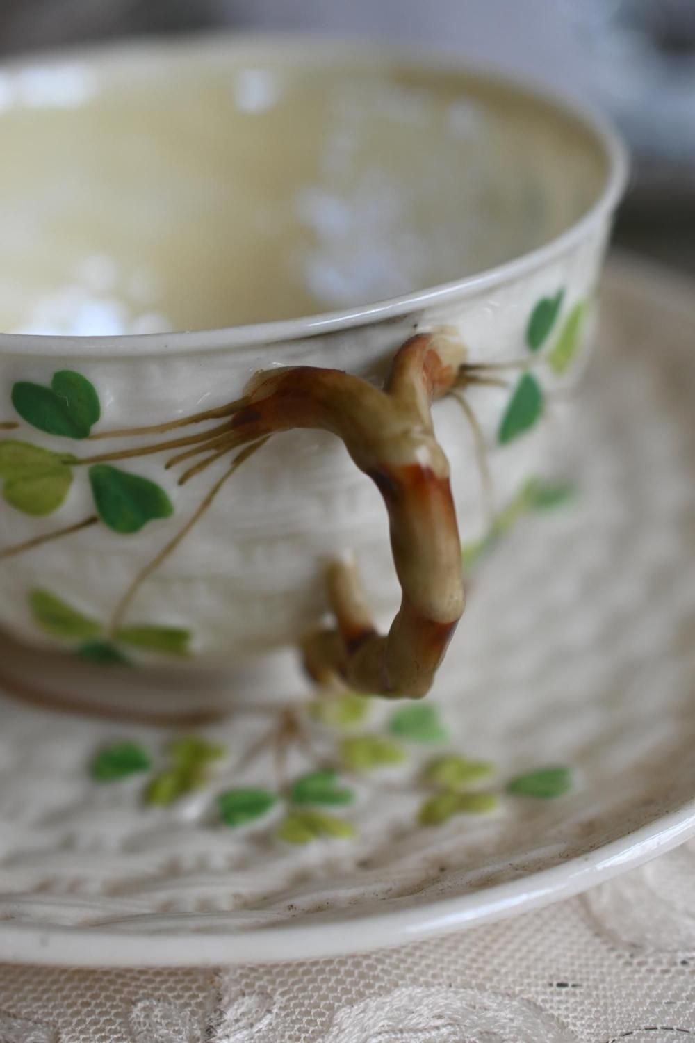 素地はバスケットのような模様が付いていて、カップのハンドルが茎のように作られています。そしてクローバーとハンドルの茎がつながっているように描かれています。