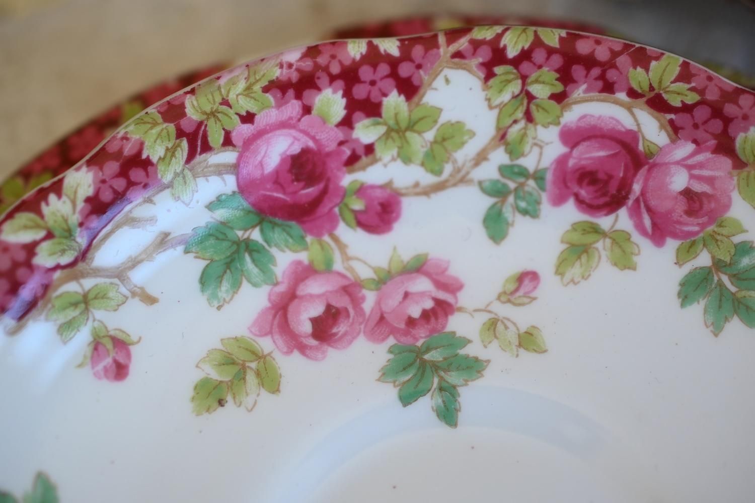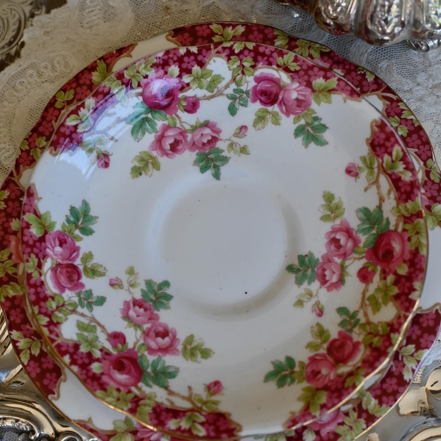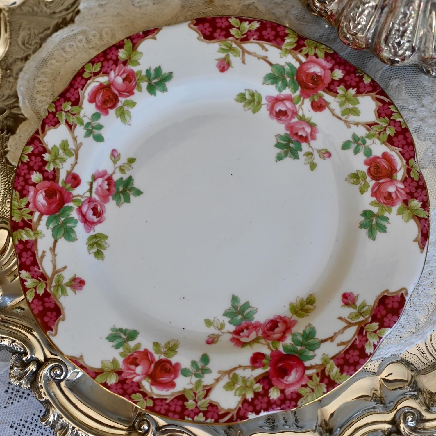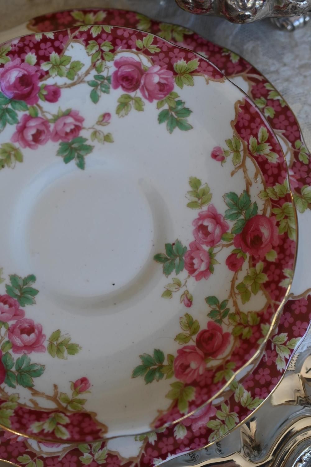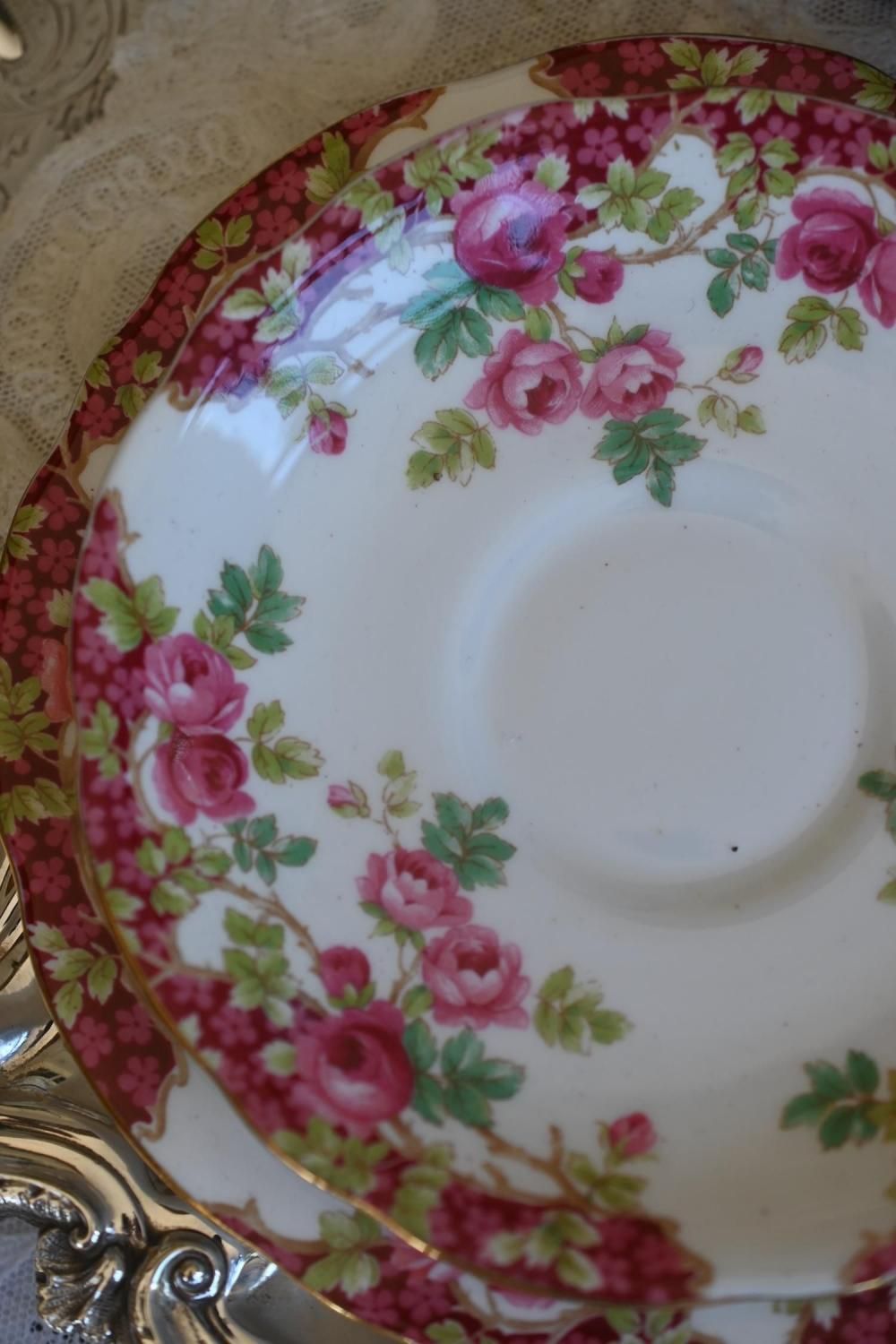 上品な濃いピンクを基調にして、伸びた枝から沢山のバラが咲いています。葉は2色のグリーンで色付けされ、生き生きとした感じの絵柄です。丁寧に作られており、質の高いヴィンテージのお品です。