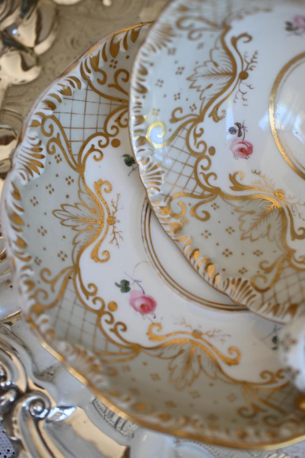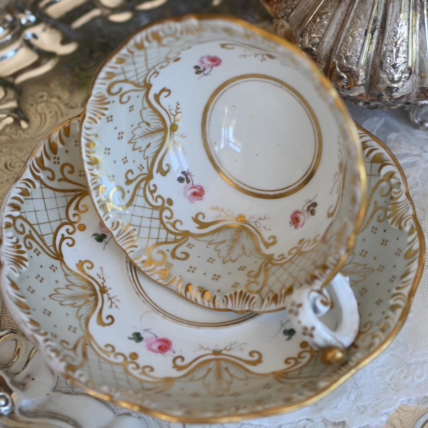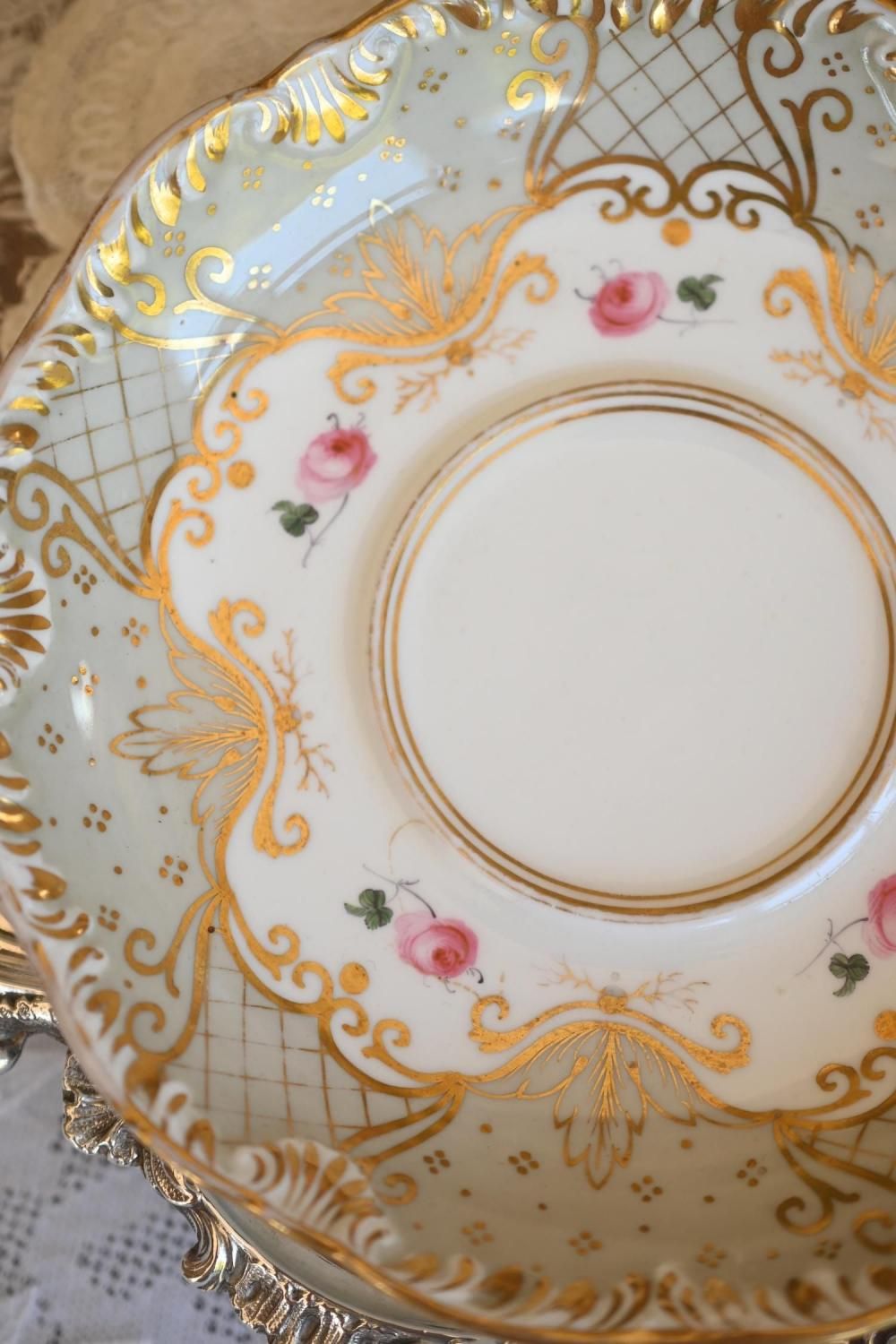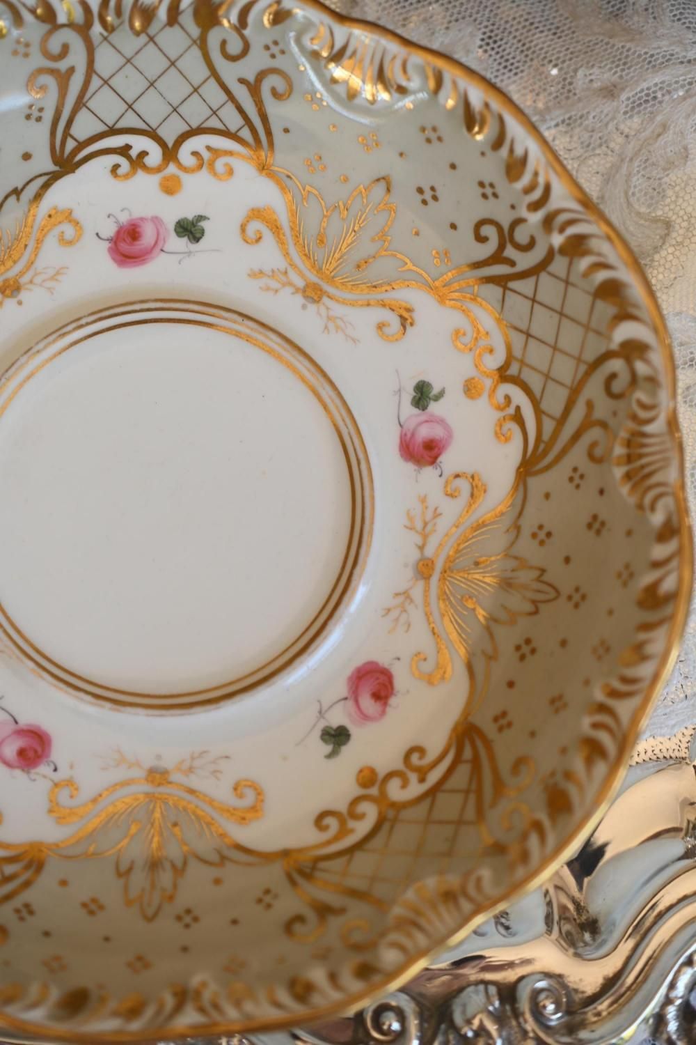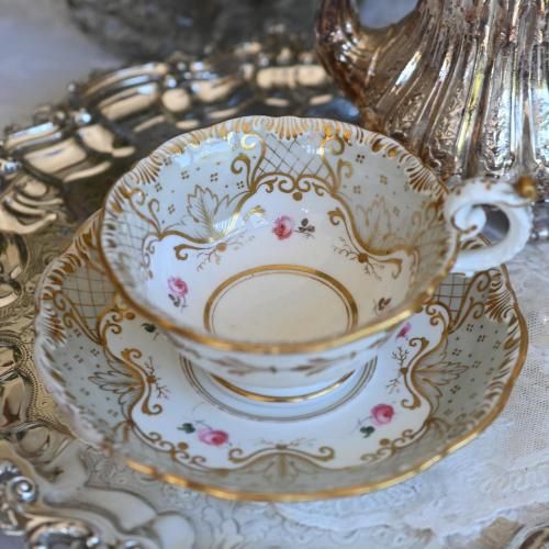 こちらのお品はロココリバイバルで、優しいグレー色にピンクの小さなバラが描かれています。カップのハンドルはひと目見てダベンポートとわかる特徴のある形をしています。美しく上品な雰囲気のティーセットです。