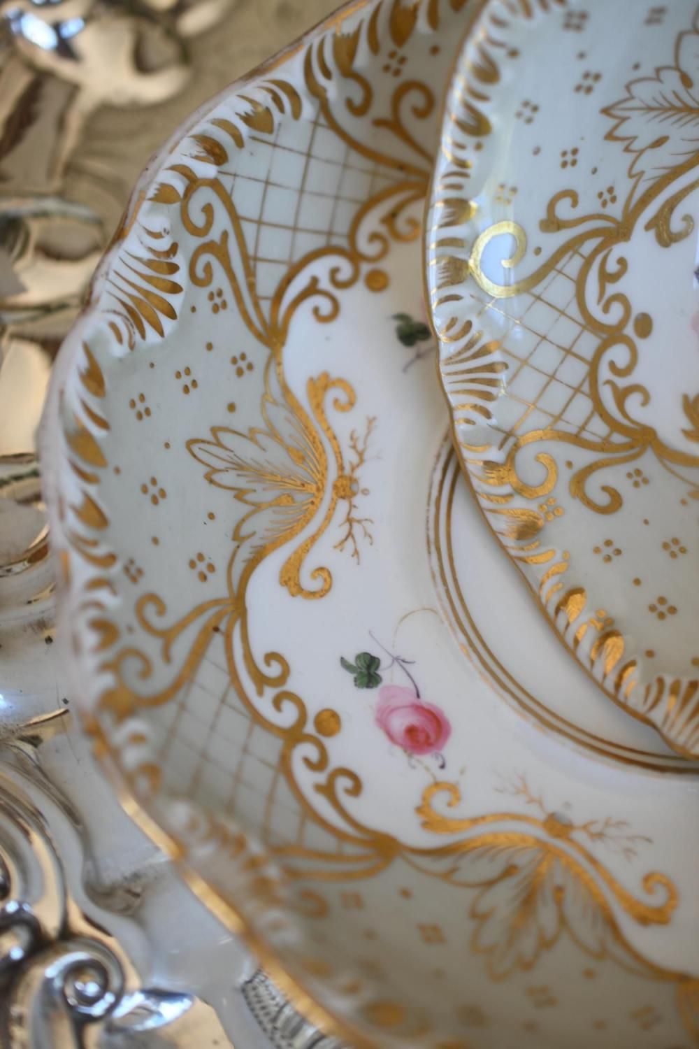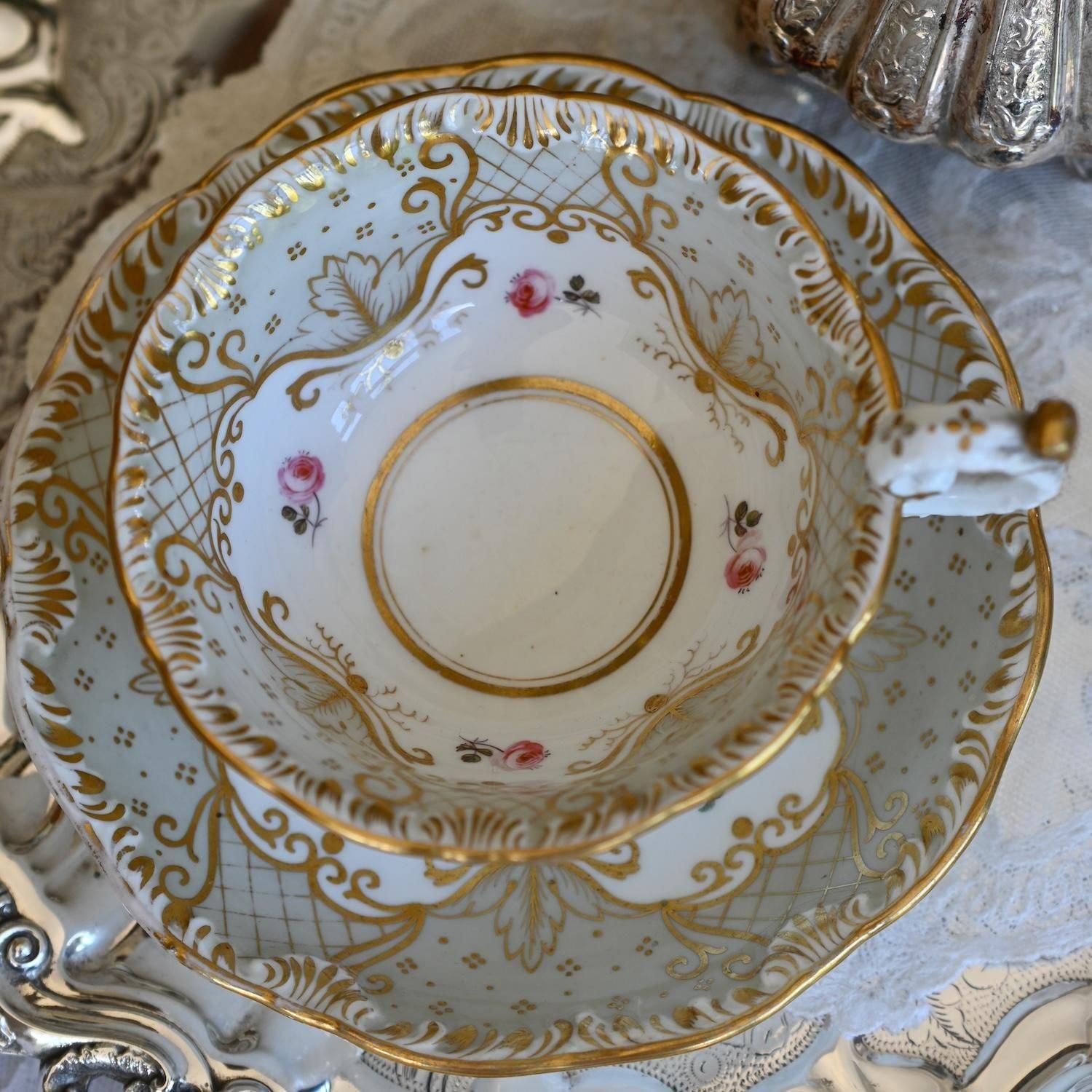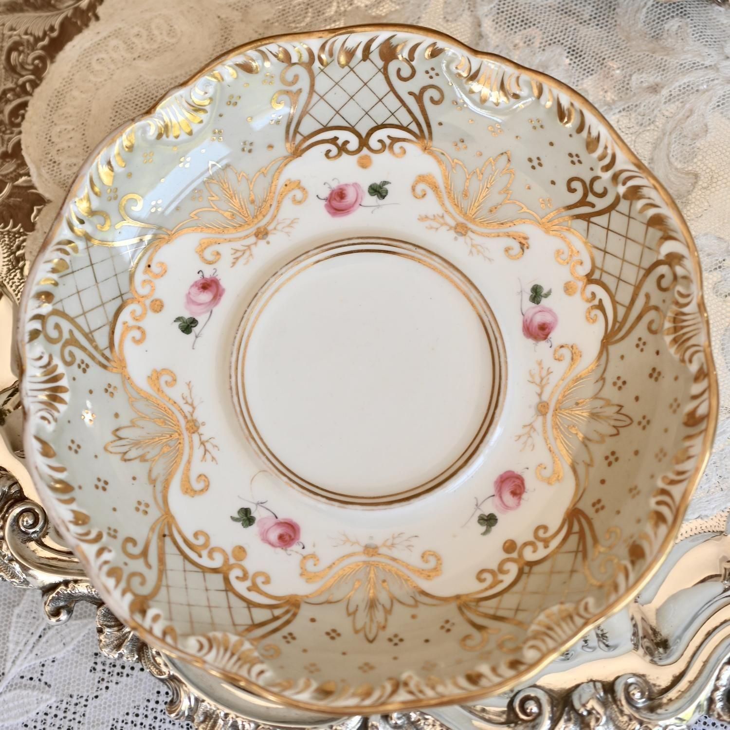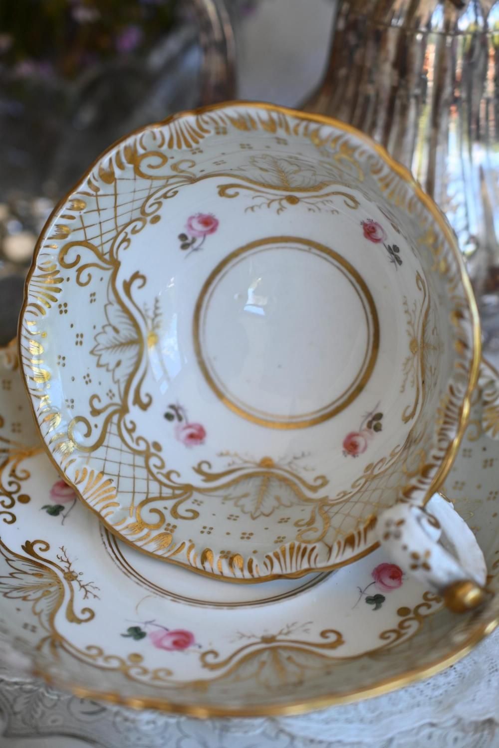 こちらのお品はロココリバイバルで、優しいグレー色にピンクの小さなバラが描かれています。カップのハンドルはひと目見てダベンポートとわかる特徴のある形をしています。美しく上品な雰囲気のティーセットです。