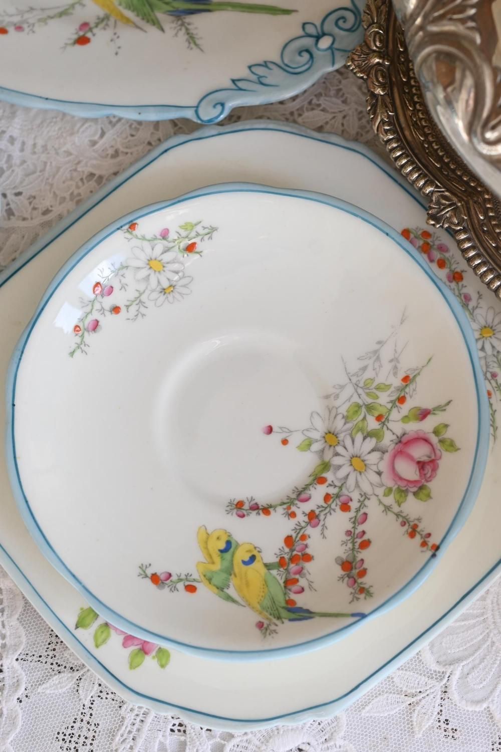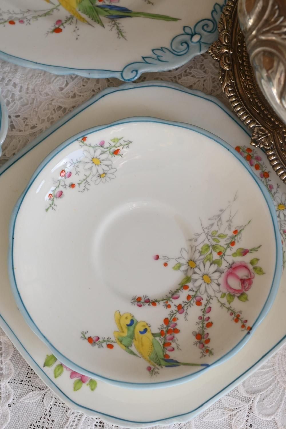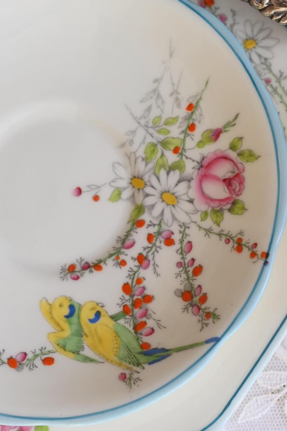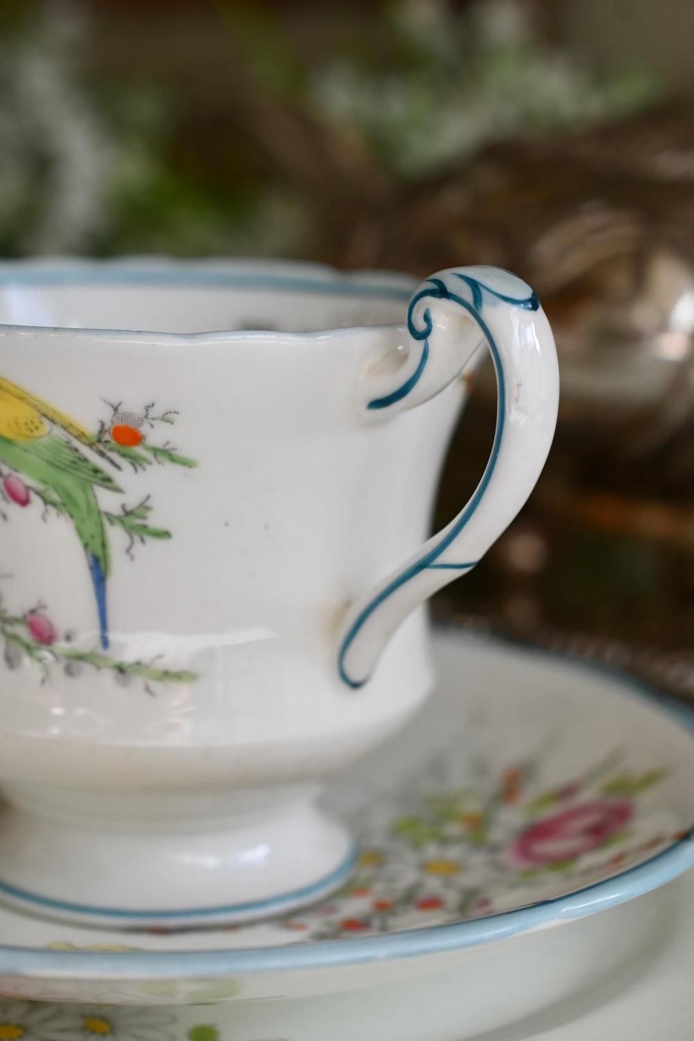 マーガレット王女のために作られたティーセットになります。とても可愛らしい黄色と黄緑色のインコがペアで描かれています。