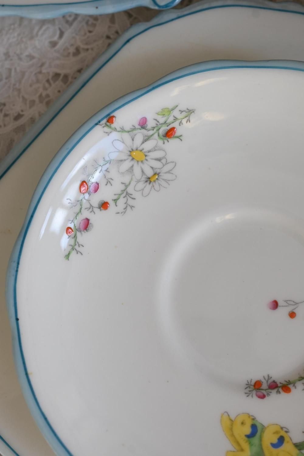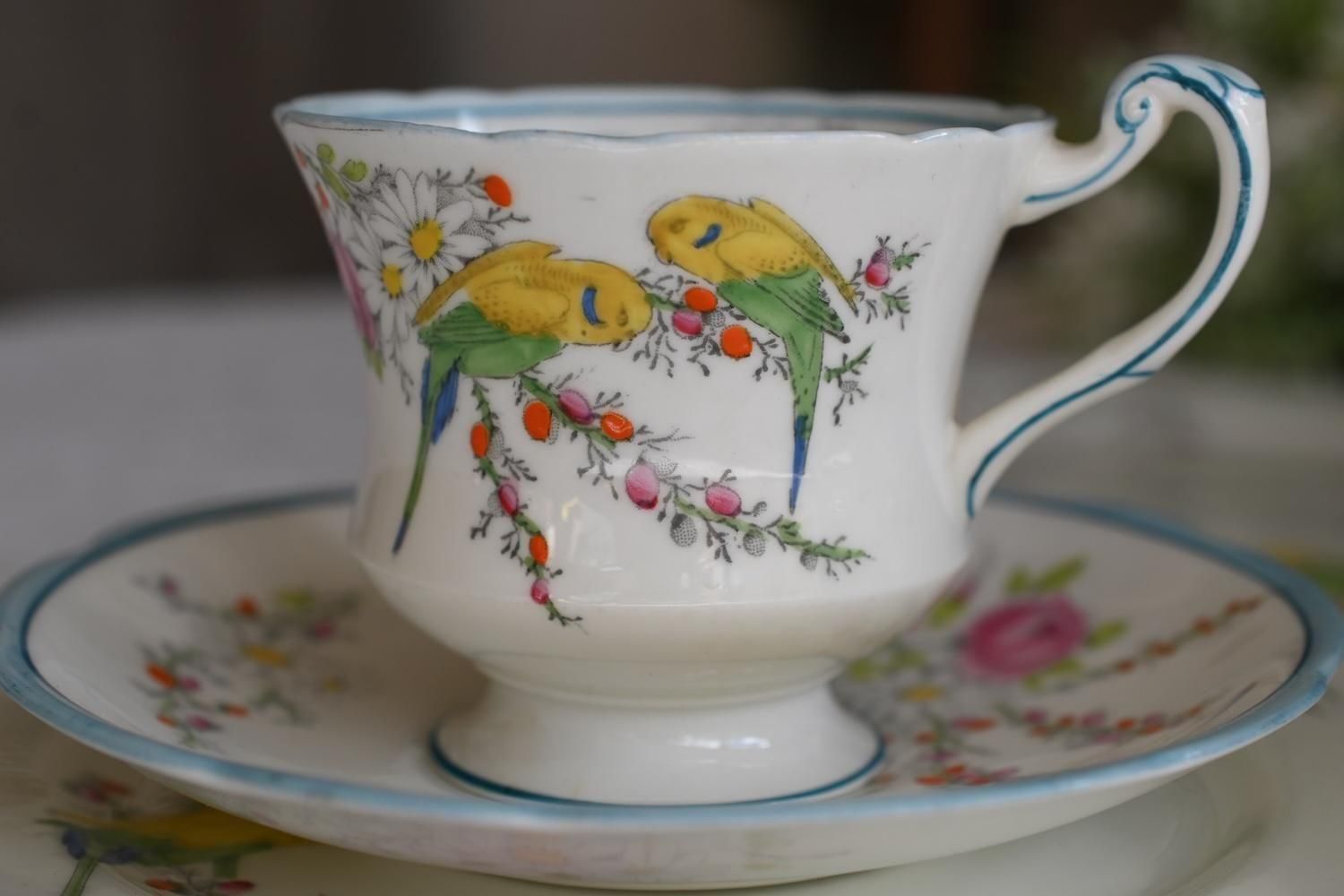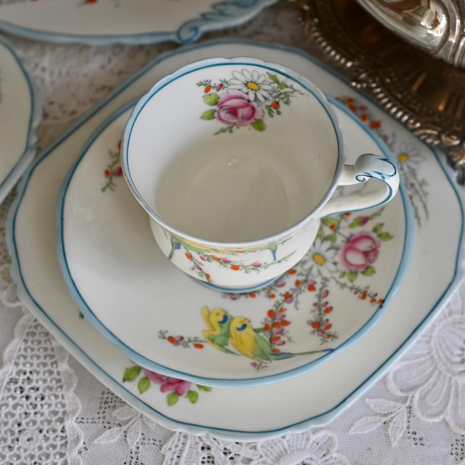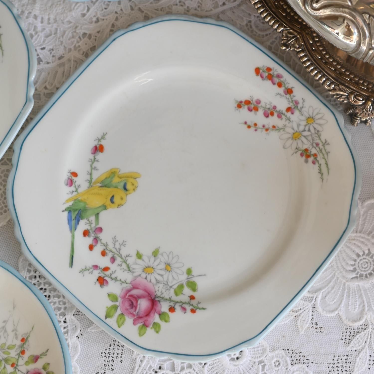 マーガレット王女のために作られたティーセットになります。とても可愛らしい黄色と黄緑色のインコがペアで描かれています。