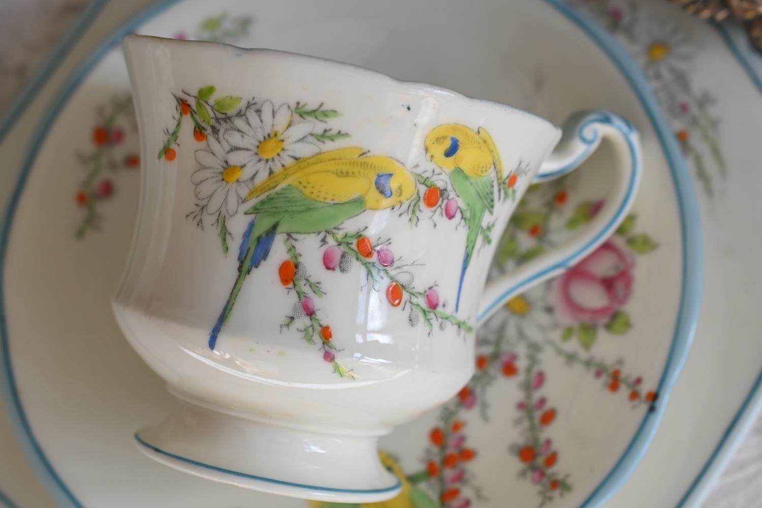 • <img class='new_mark_img1' src='https://img.shop-pro.jp/img/new/icons47.gif' style='border:none;display:inline;margin:0px;padding:0px;width:auto;' />1930年 パラゴン マーガレット王女のために作られた2羽のインコとバラの絵柄のティーカップトリオ 2客あり (送料込)