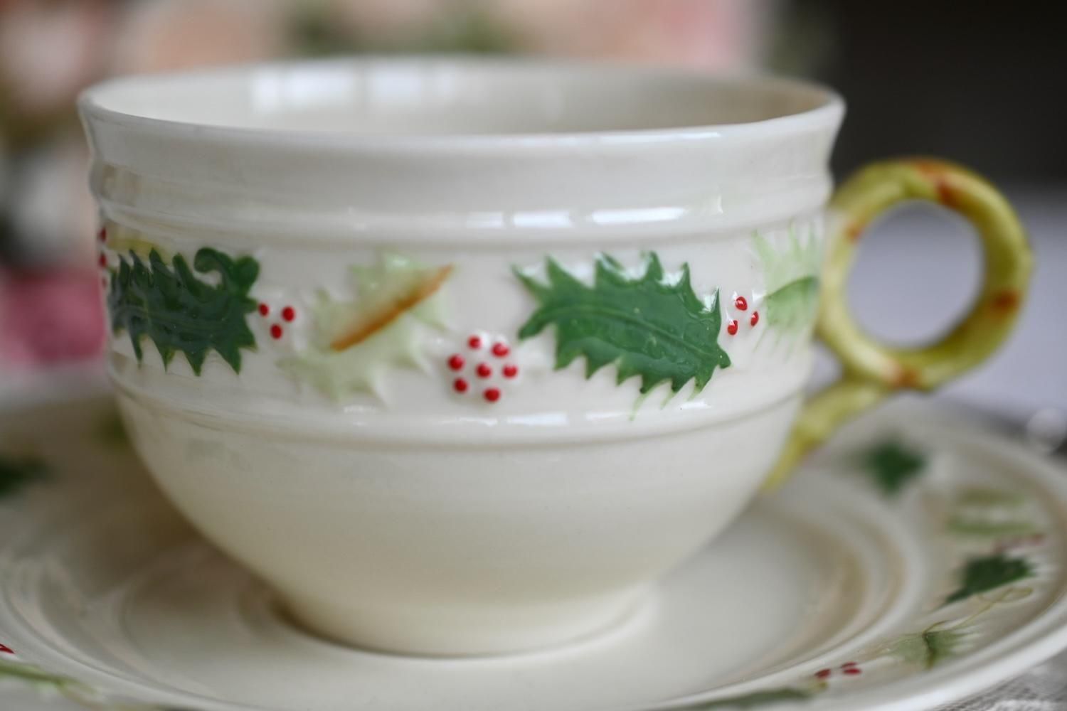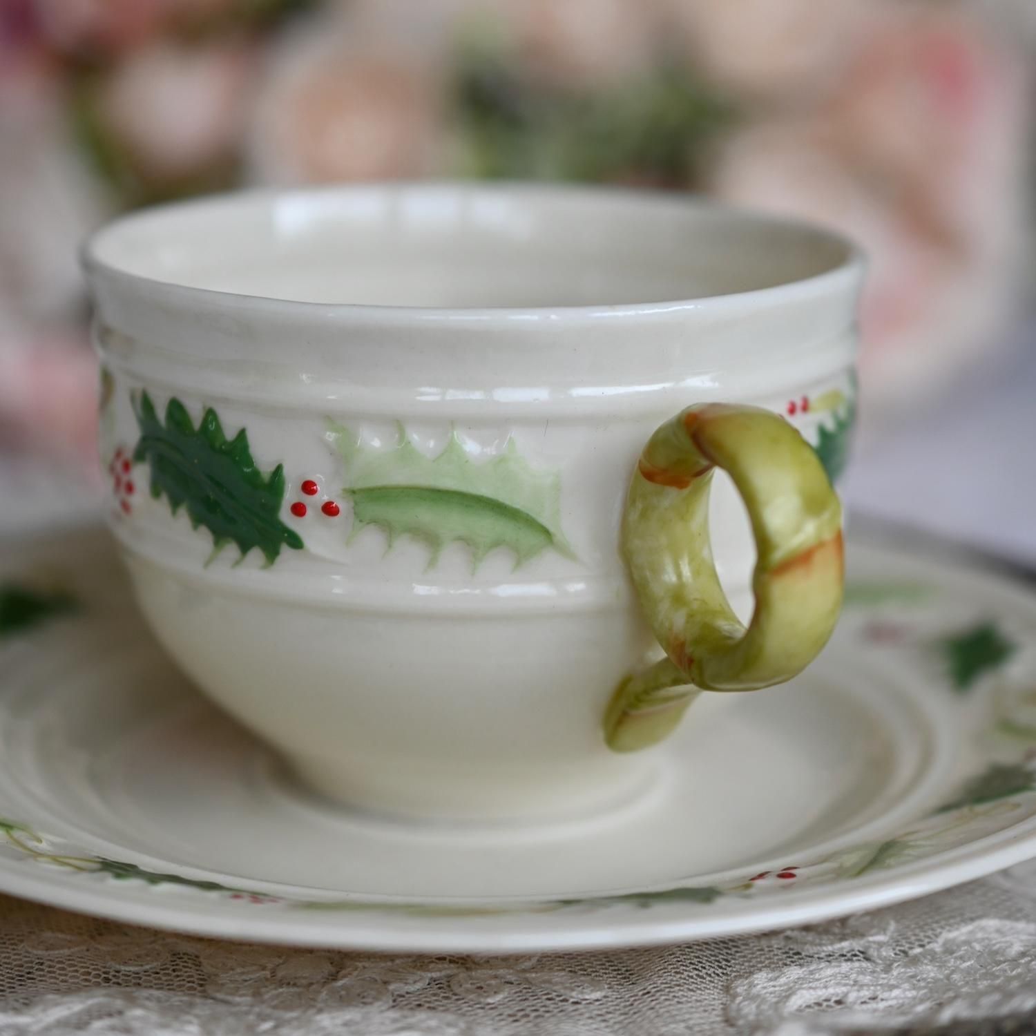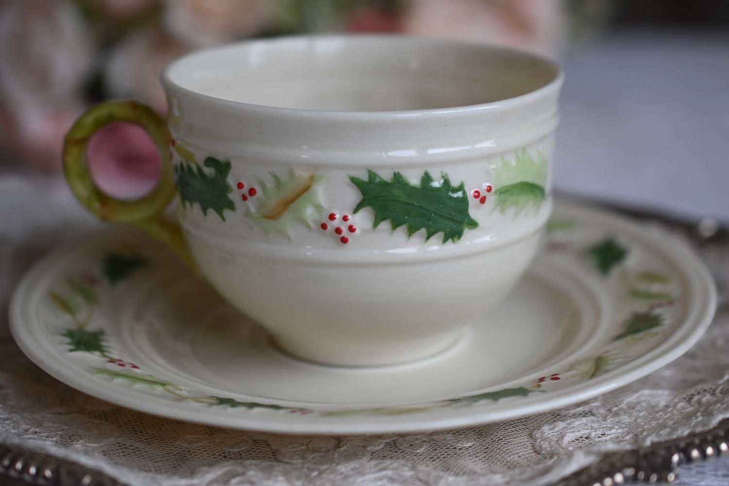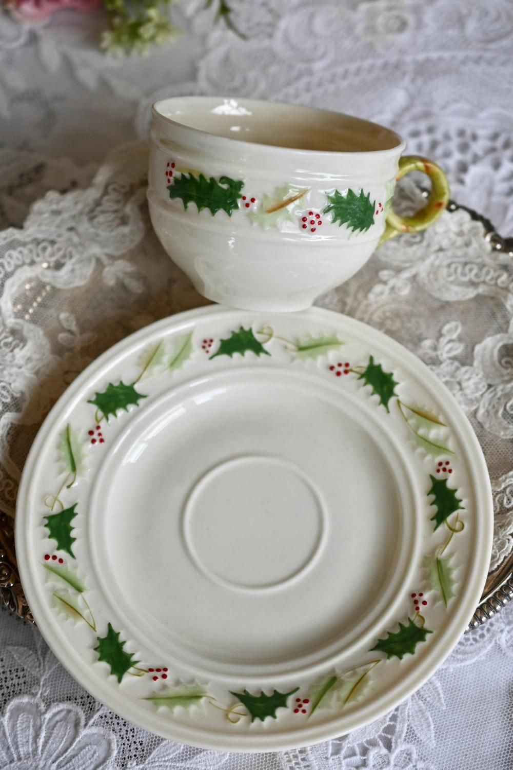 アイルランド・ベリーク社の、ヴィンテージのティーカップ&ソーサーです。クリスマスのホリーの葉と赤い実の模様が可愛らしいお品です。