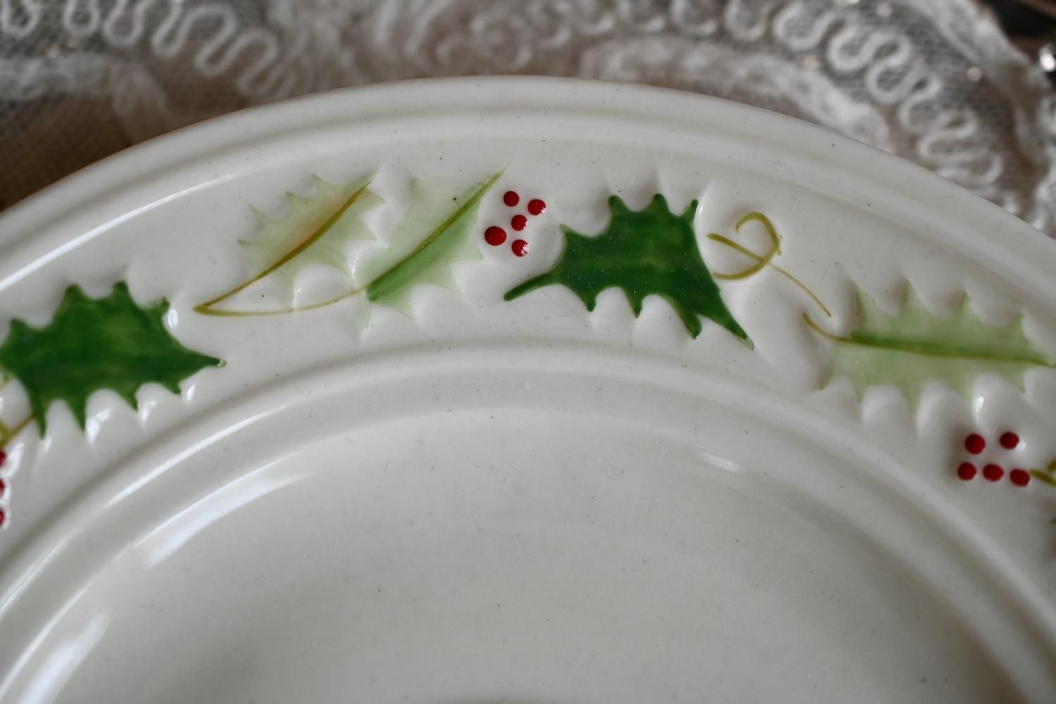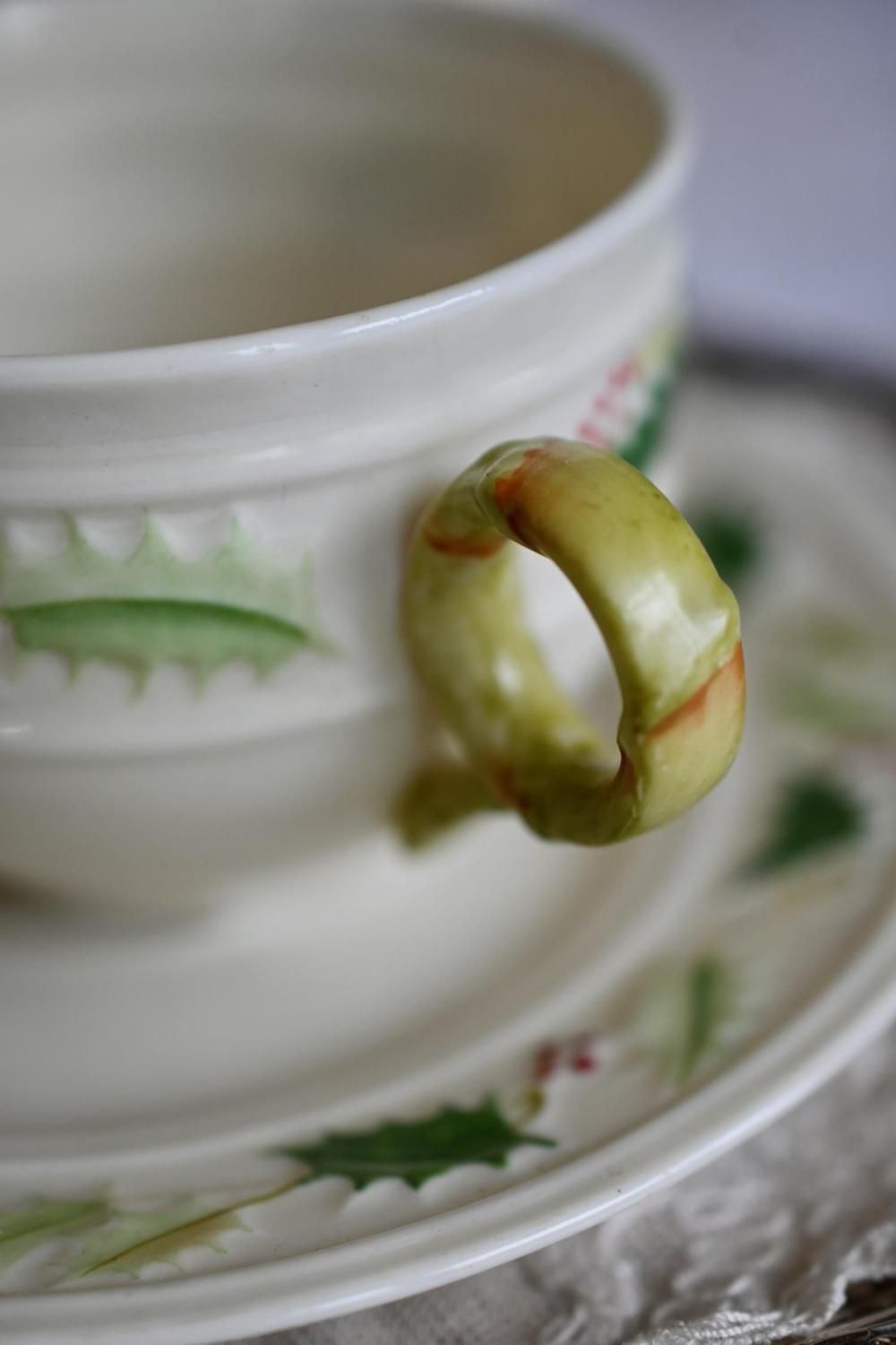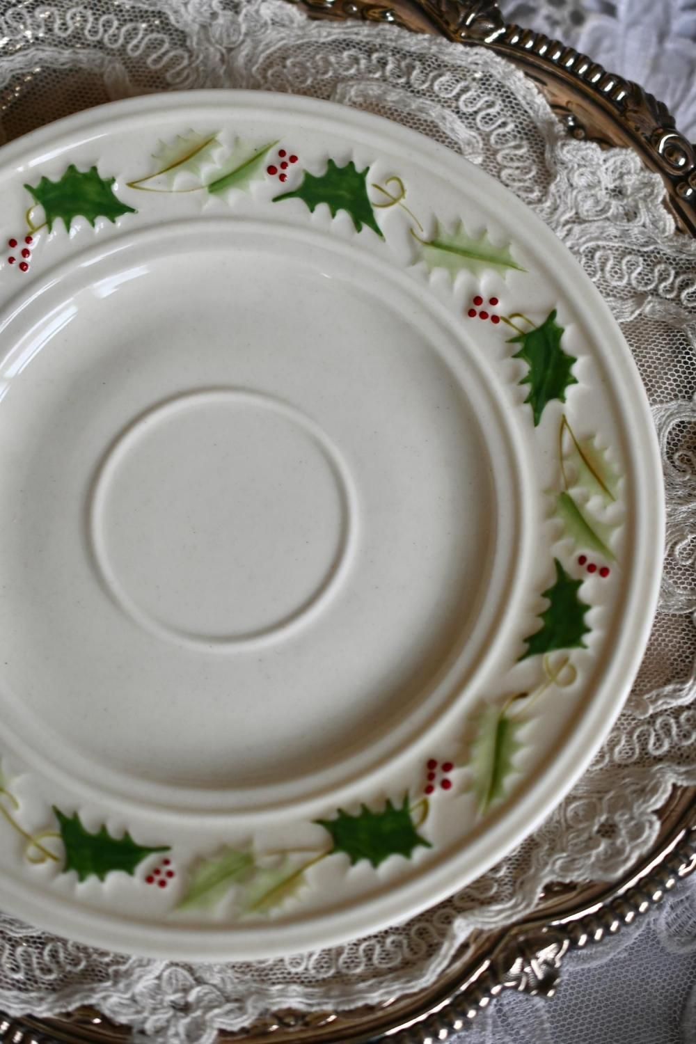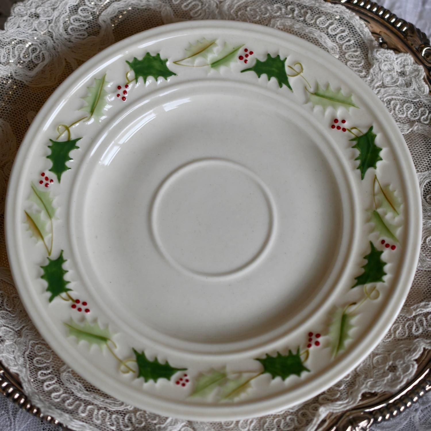 アイルランド・ベリーク社の、ヴィンテージのティーカップ&ソーサーです。クリスマスのホリーの葉と赤い実の模様が可愛らしいお品です。