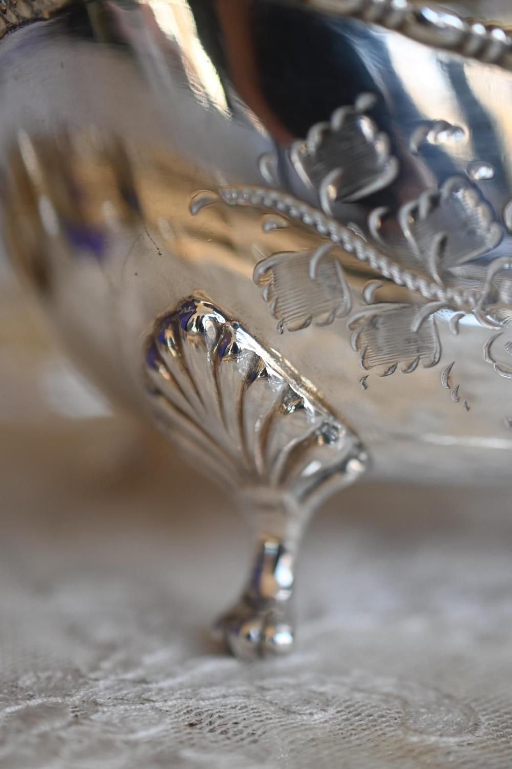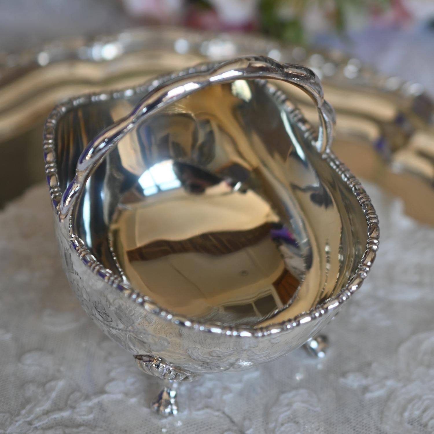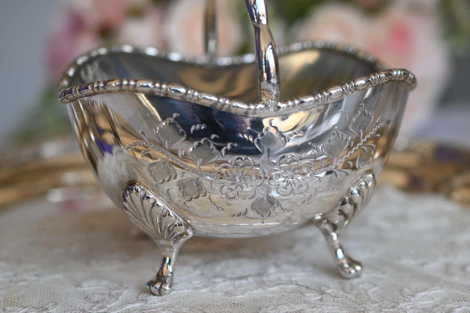 1900年初期に作られた、シルバープレート製の小ぶりのお花模様が可愛らしいバスケットです。