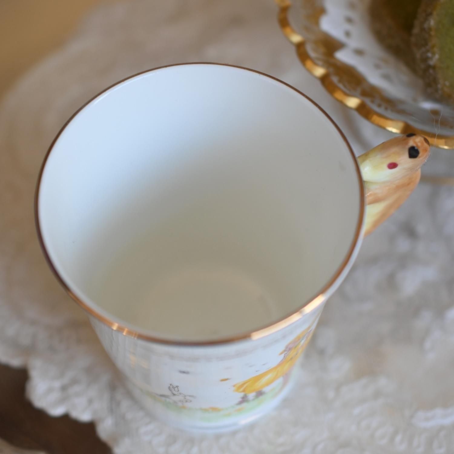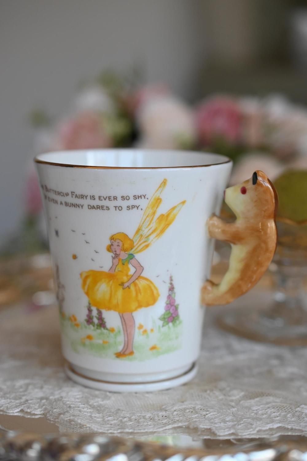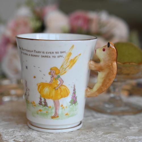 メーカー不明、小さな黄色い妖精ーバターカップの妖精が描かれていて、ハンドルはなんとも可愛らしいこぐまがかたどられています。
