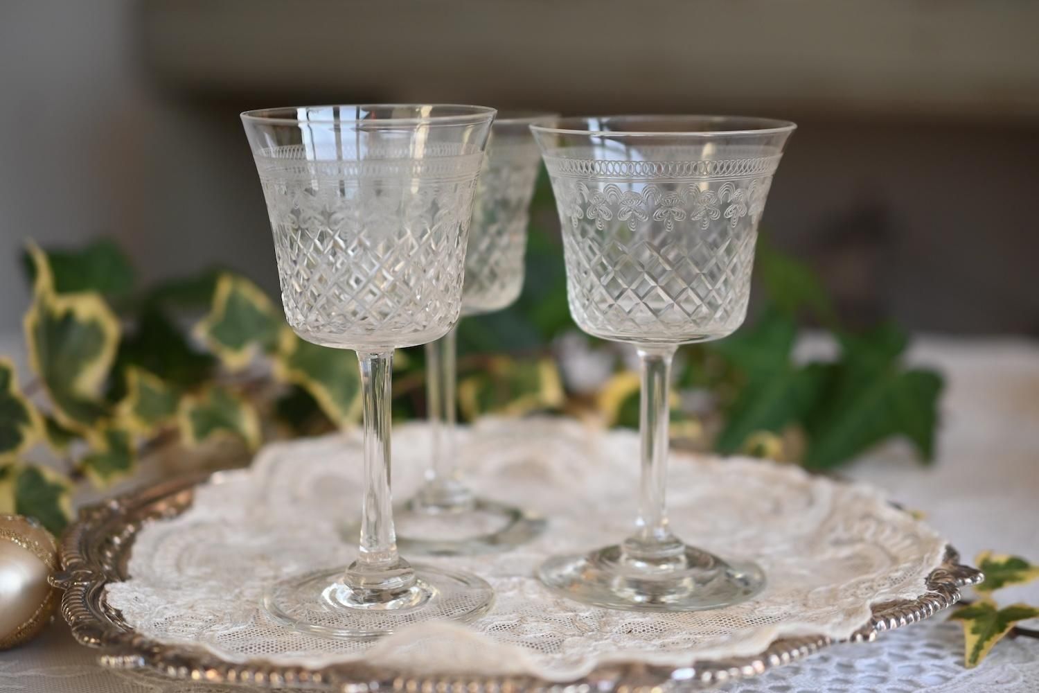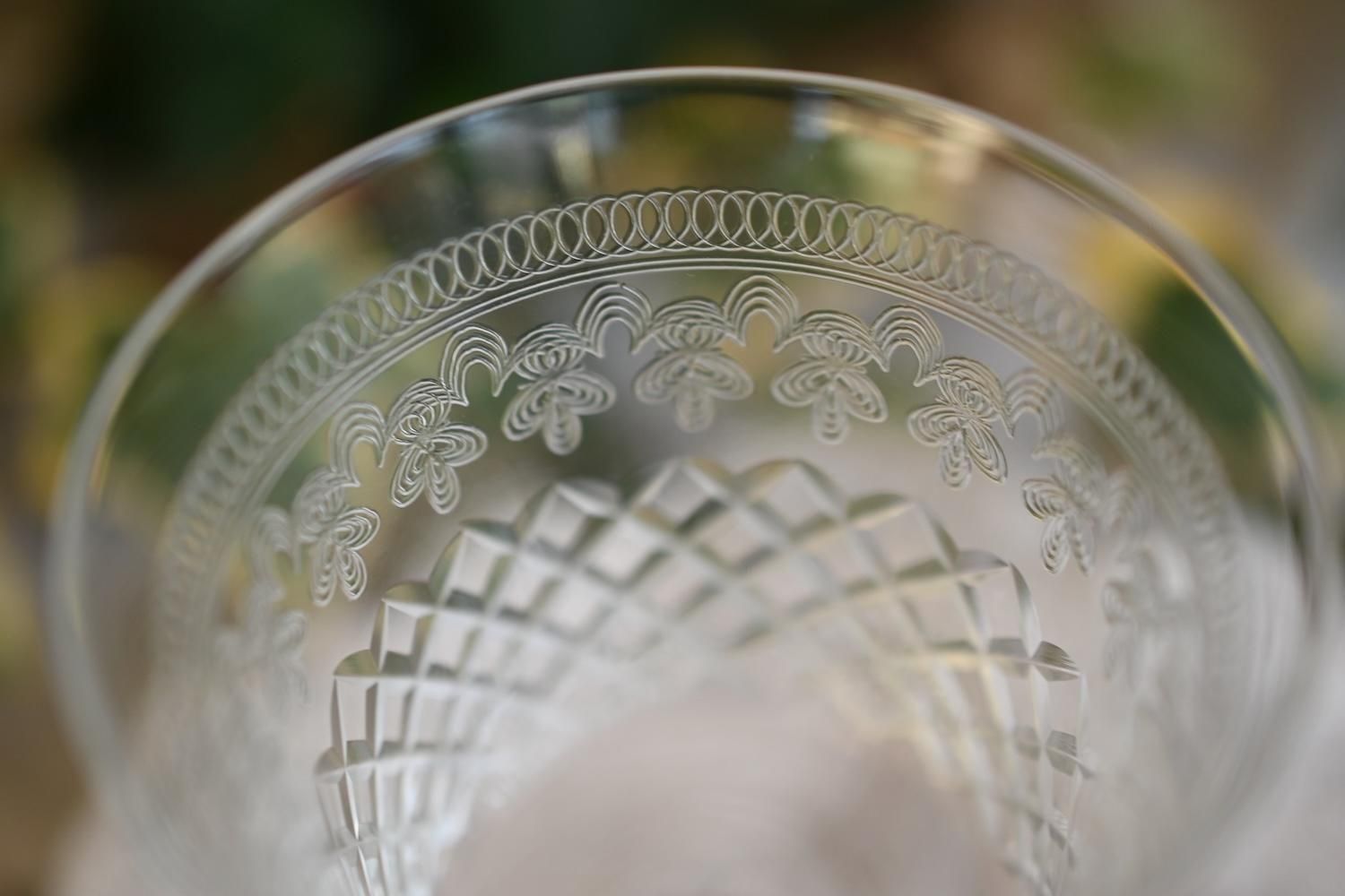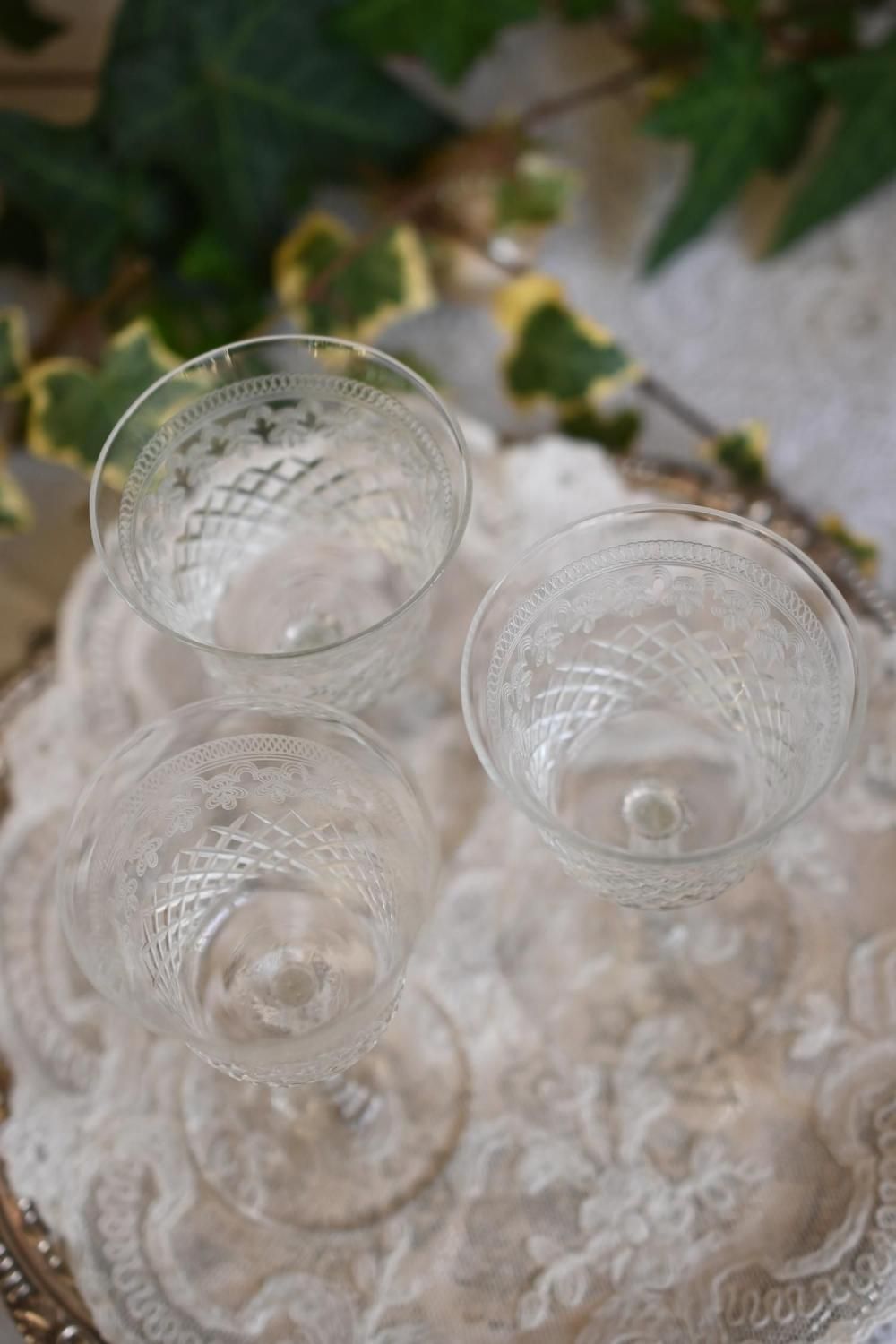 繊細な薄いガラスにエッチング模様がついている、可愛らしいシェリーグラスです。
