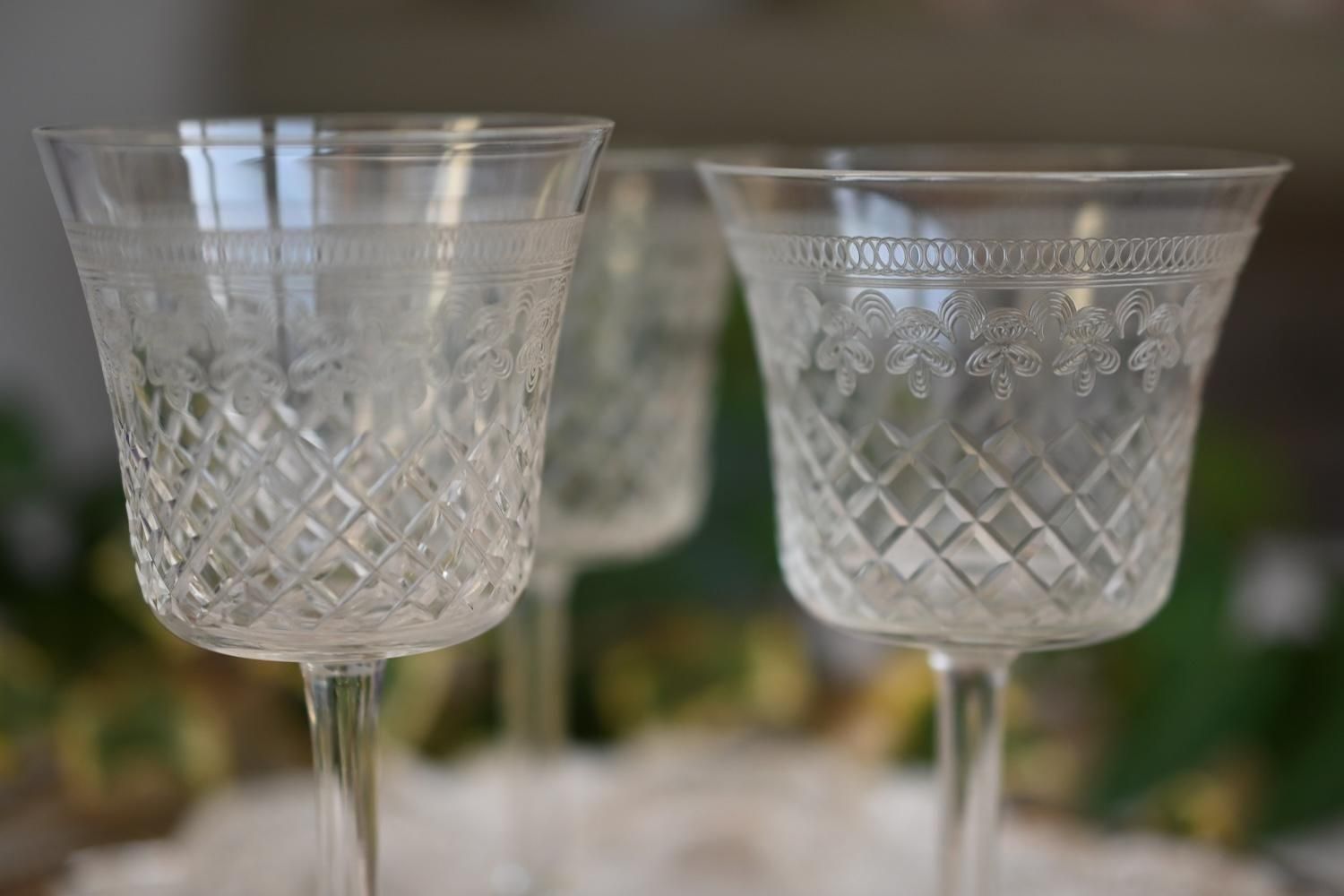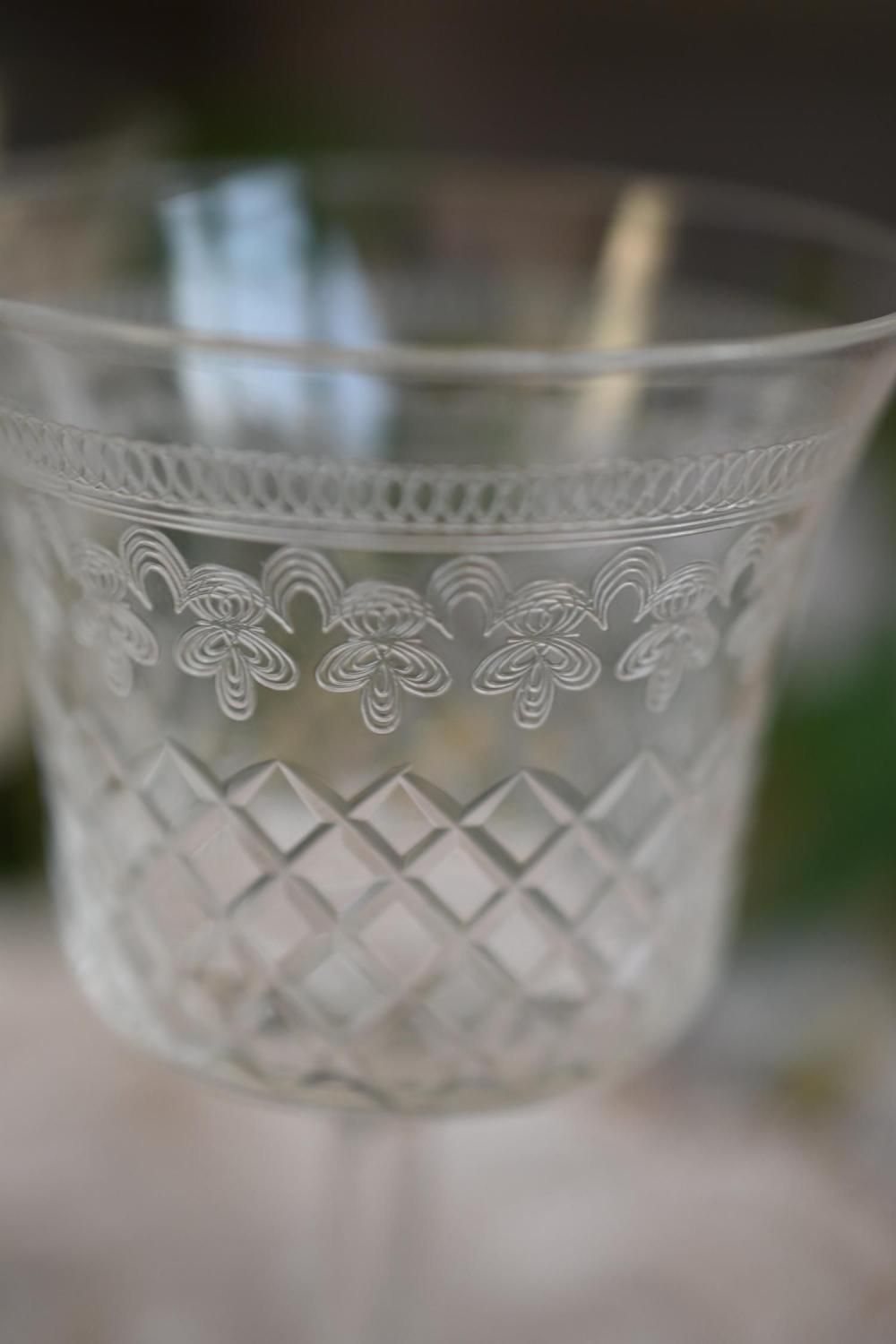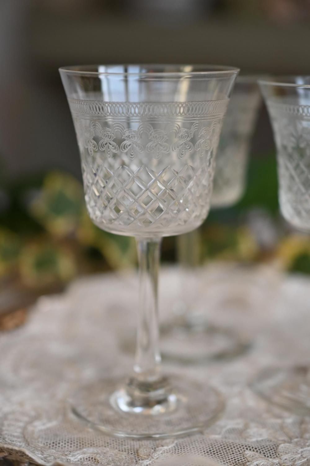 繊細な薄いガラスにエッチング模様がついている、可愛らしいシェリーグラスです。