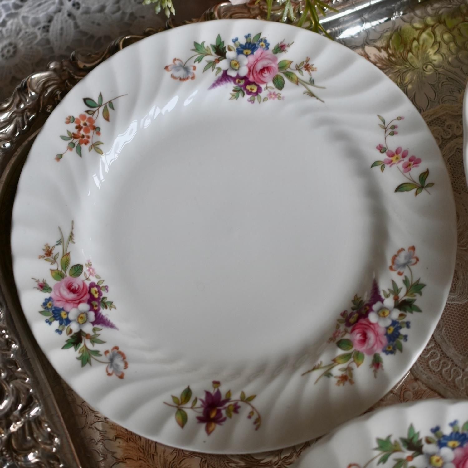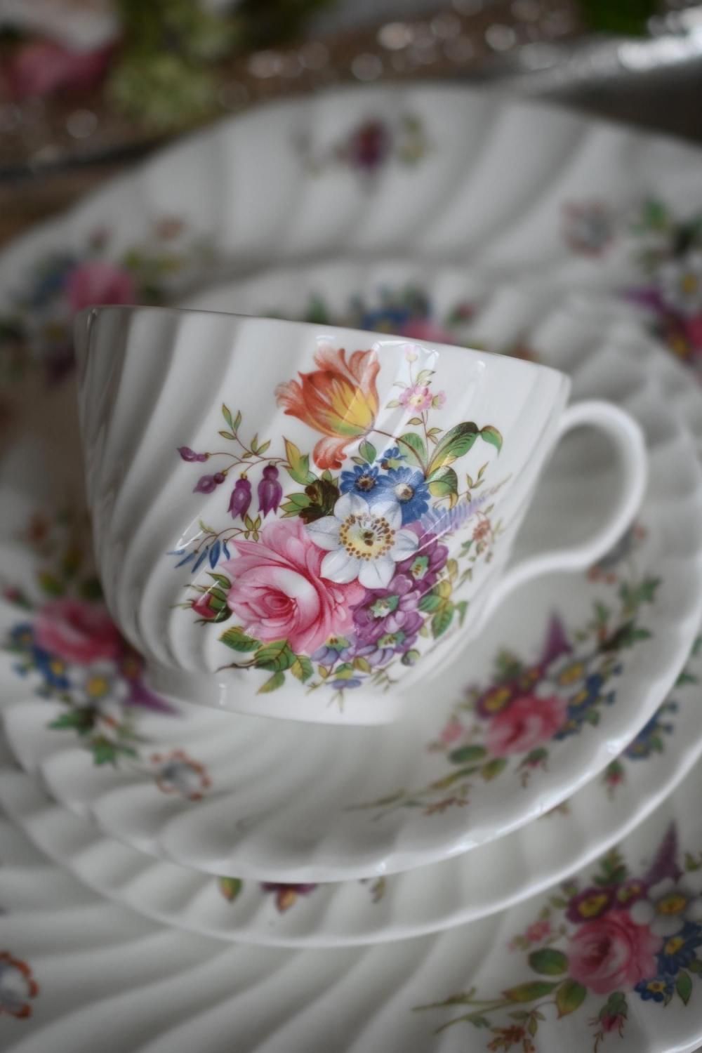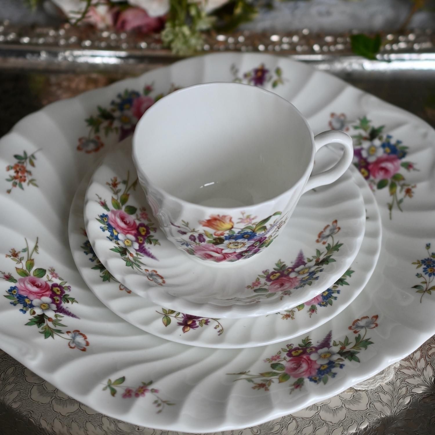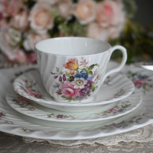 白磁でフルーテッドシェイプの磁器にカラフルなブーケ模様が描かれております。たいへんシンプルですが爽やかでスタイリッシュなトリオとなっております。