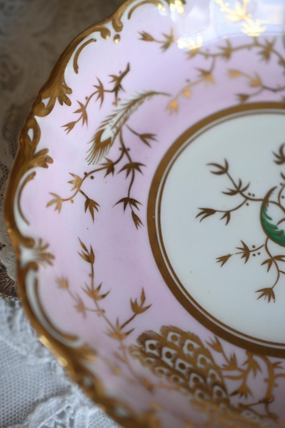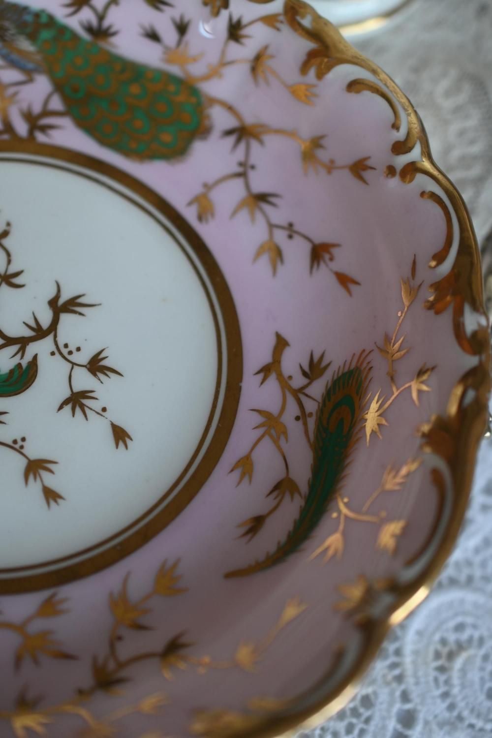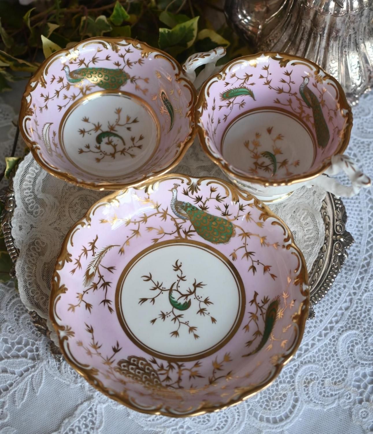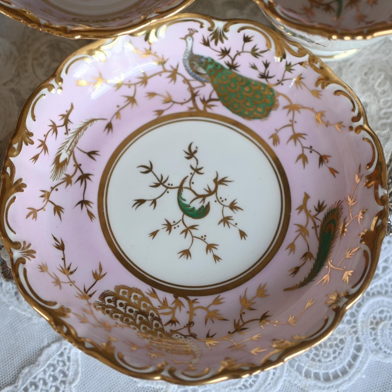 1840年代・ヒルディッチ 緑と金彩の孔雀とピンクのバックグラウンド トゥルートリオ (送料込)