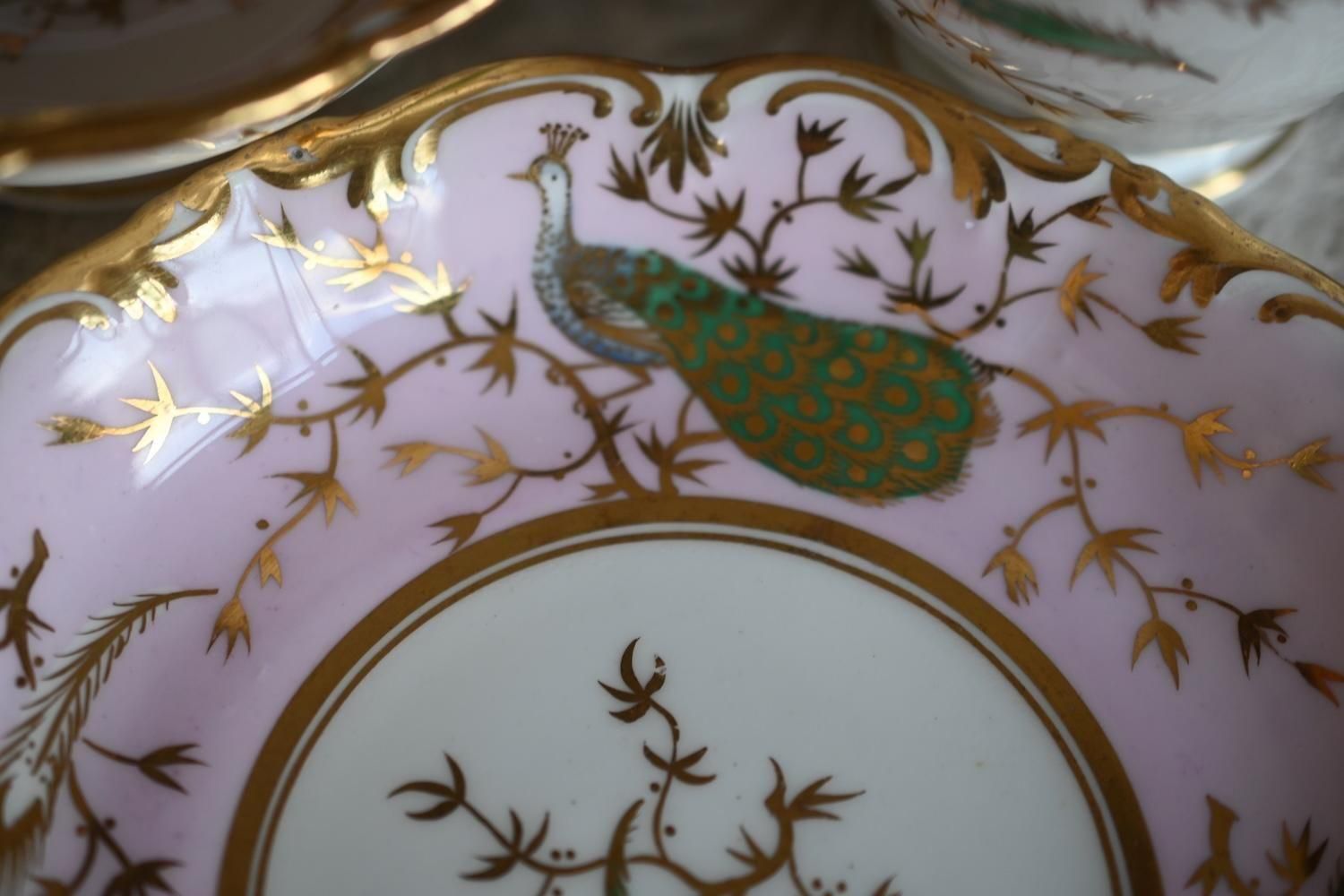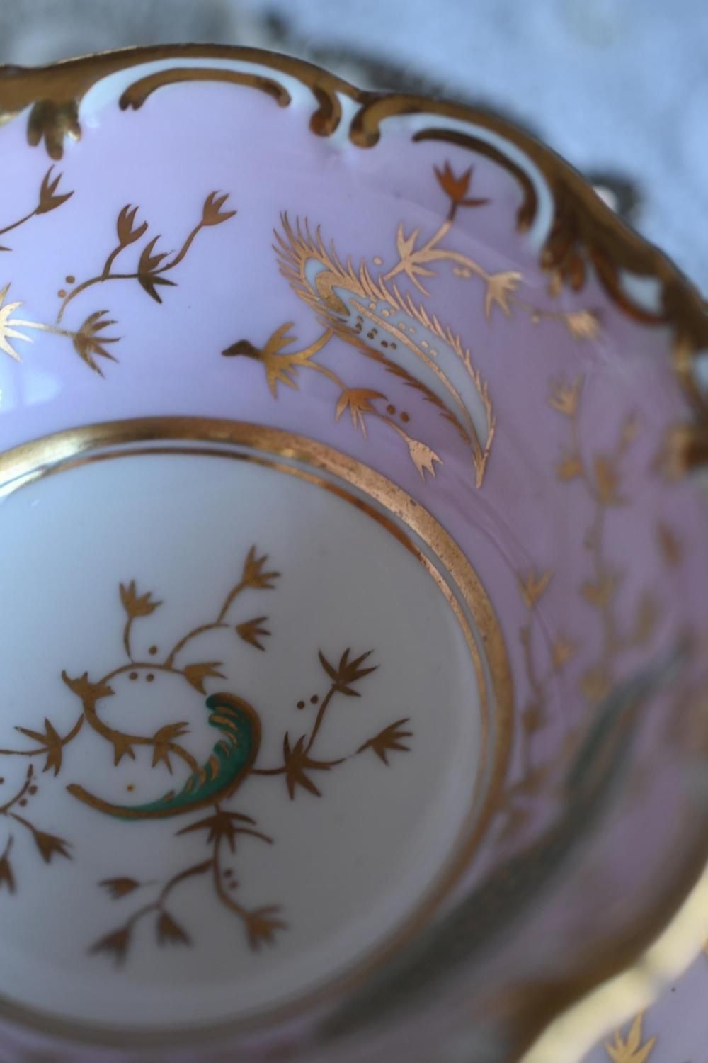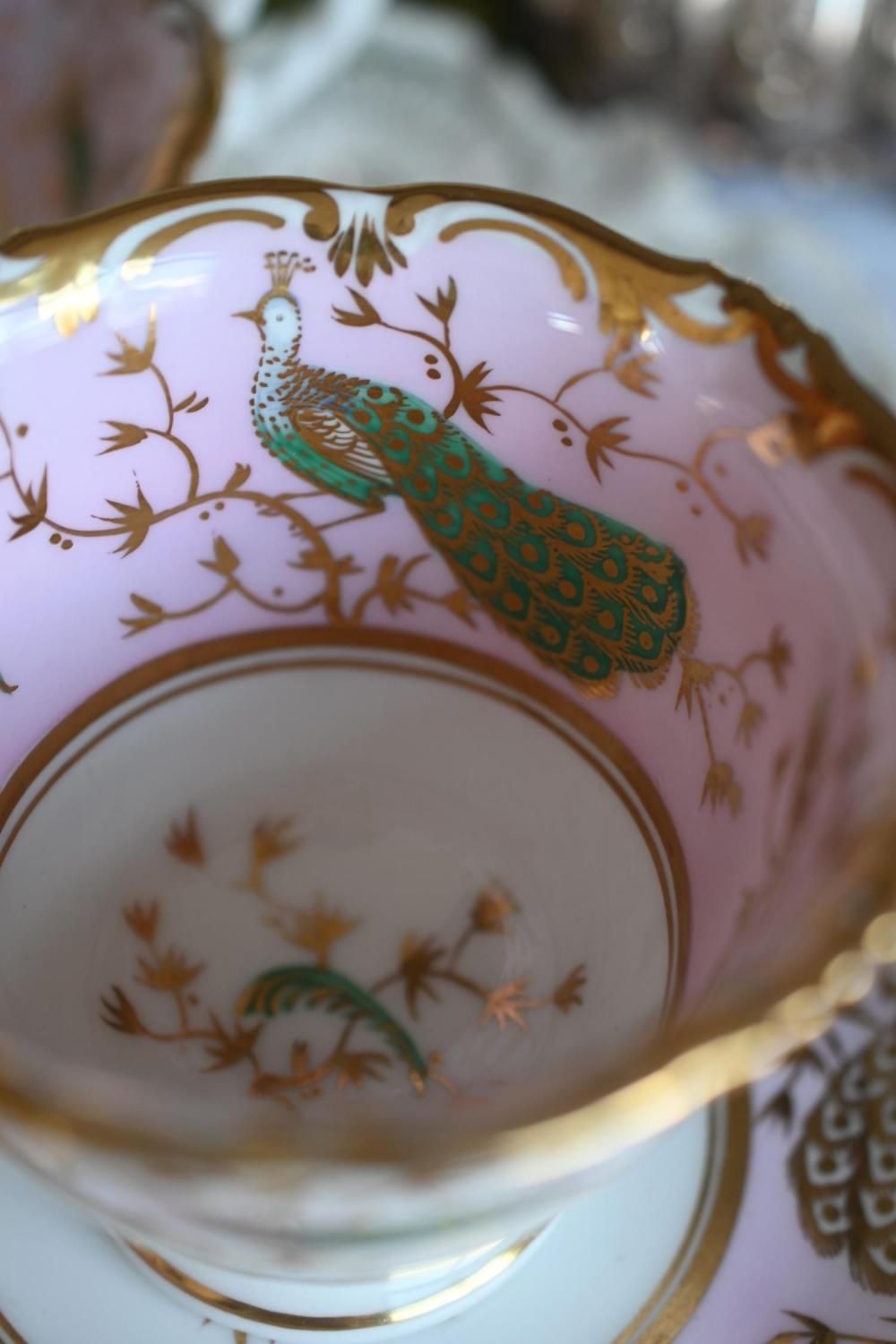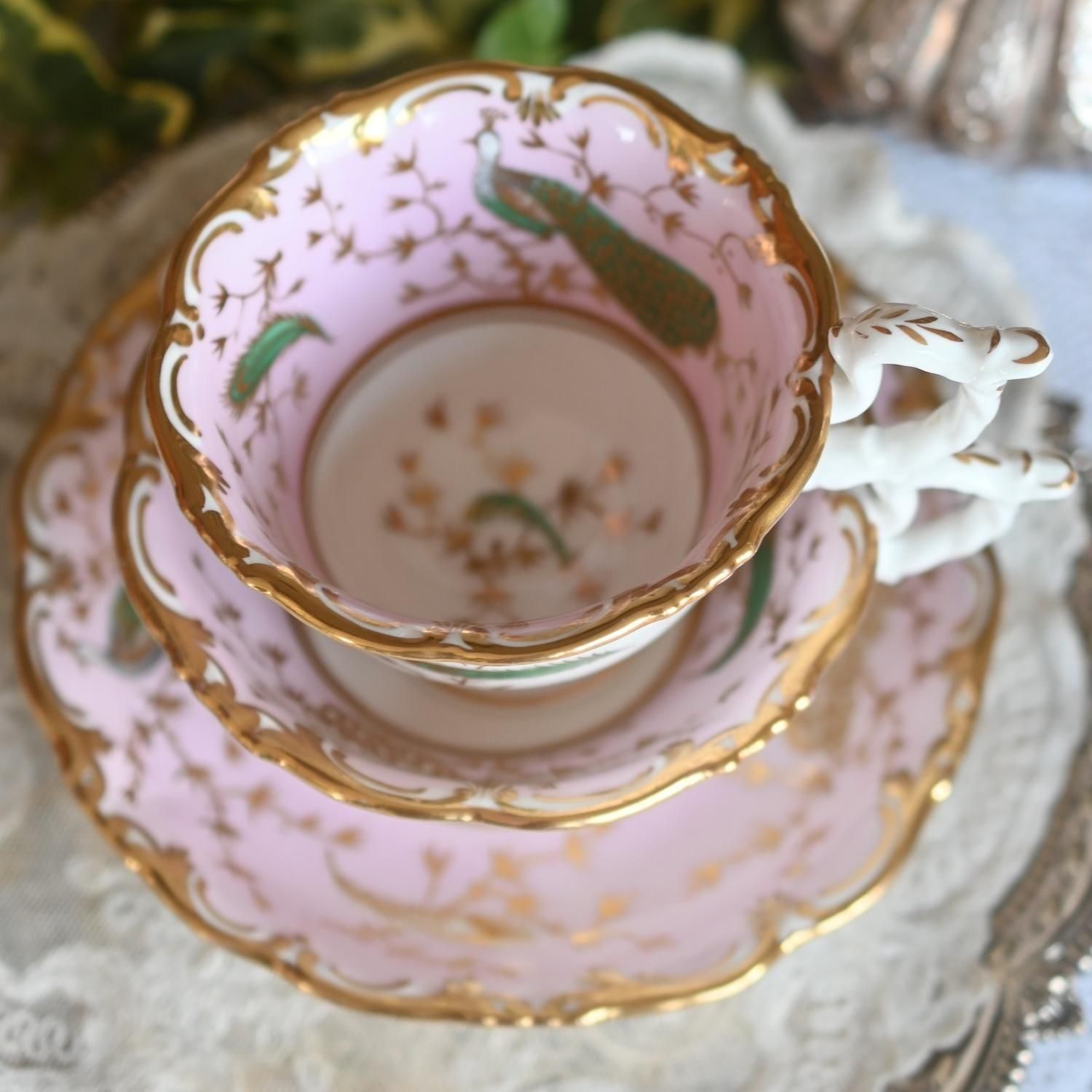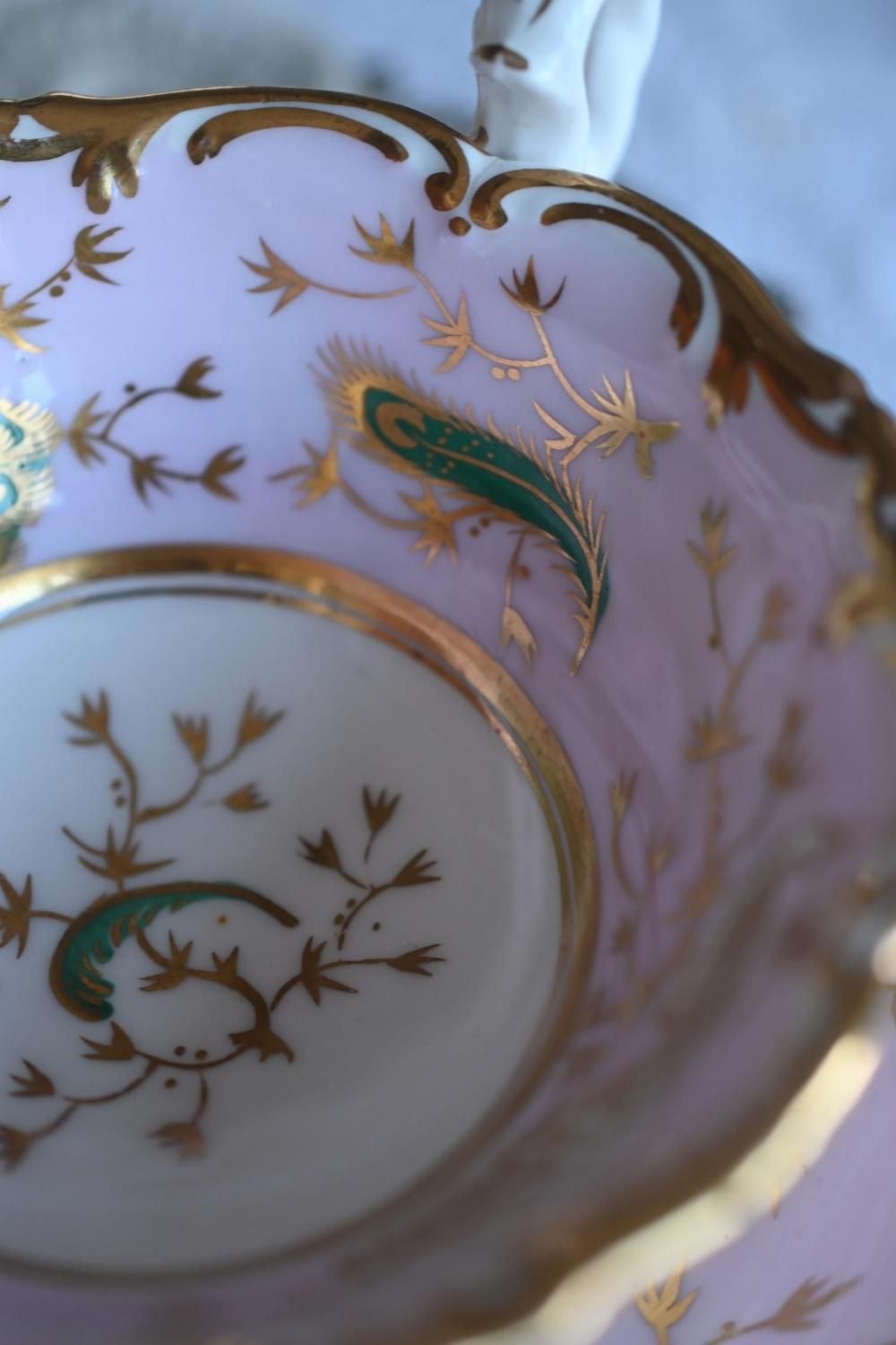 1840年代・ヒルディッチ 緑と金彩の孔雀とピンクのバックグラウンド トゥルートリオ (送料込)