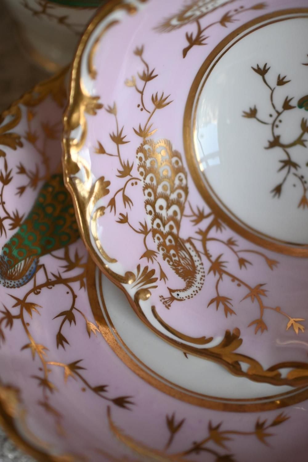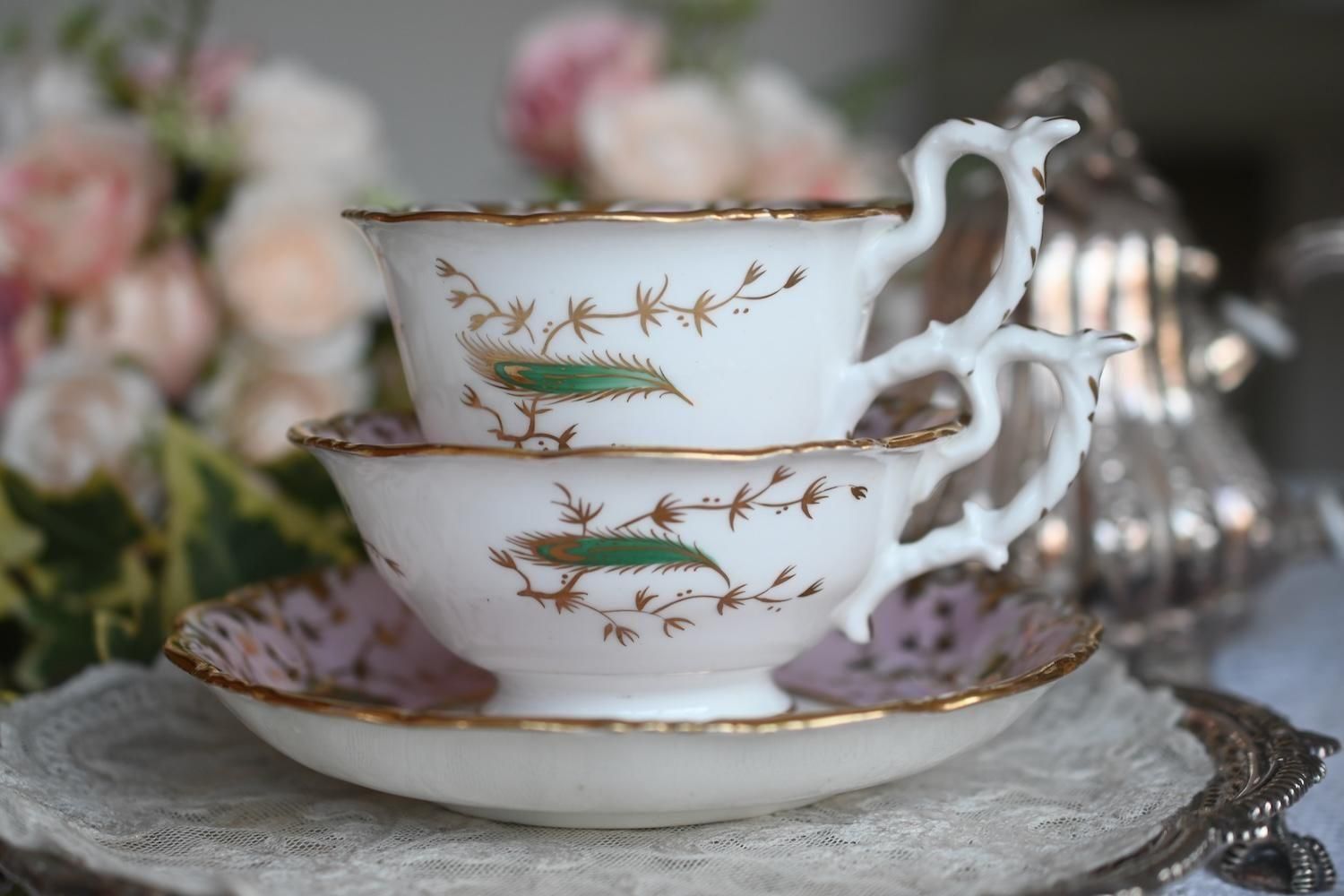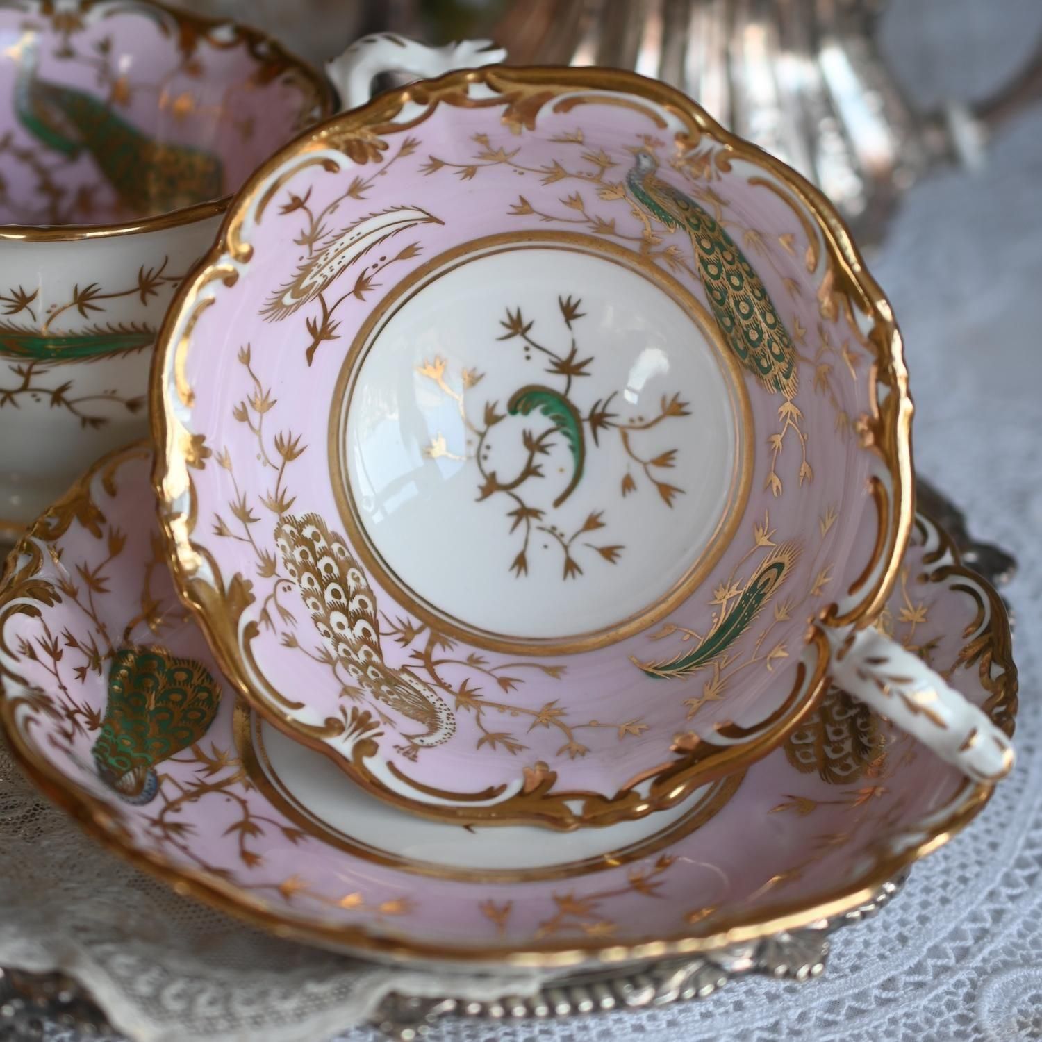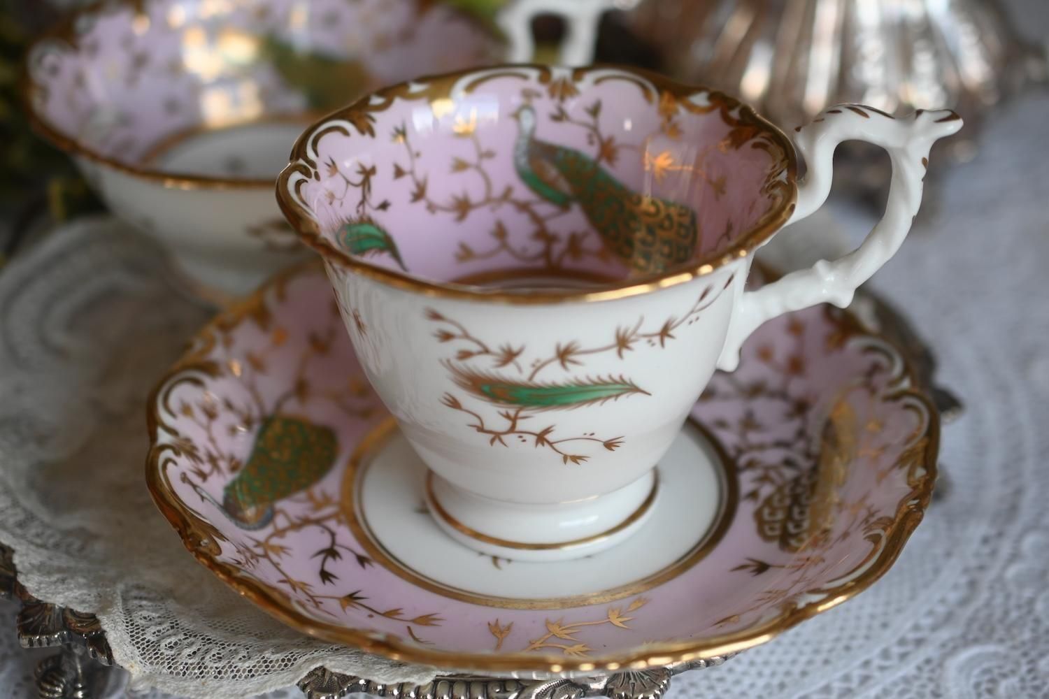 1840年代・ヒルディッチ 緑と金彩の孔雀とピンクのバックグラウンド トゥルートリオ (送料込)