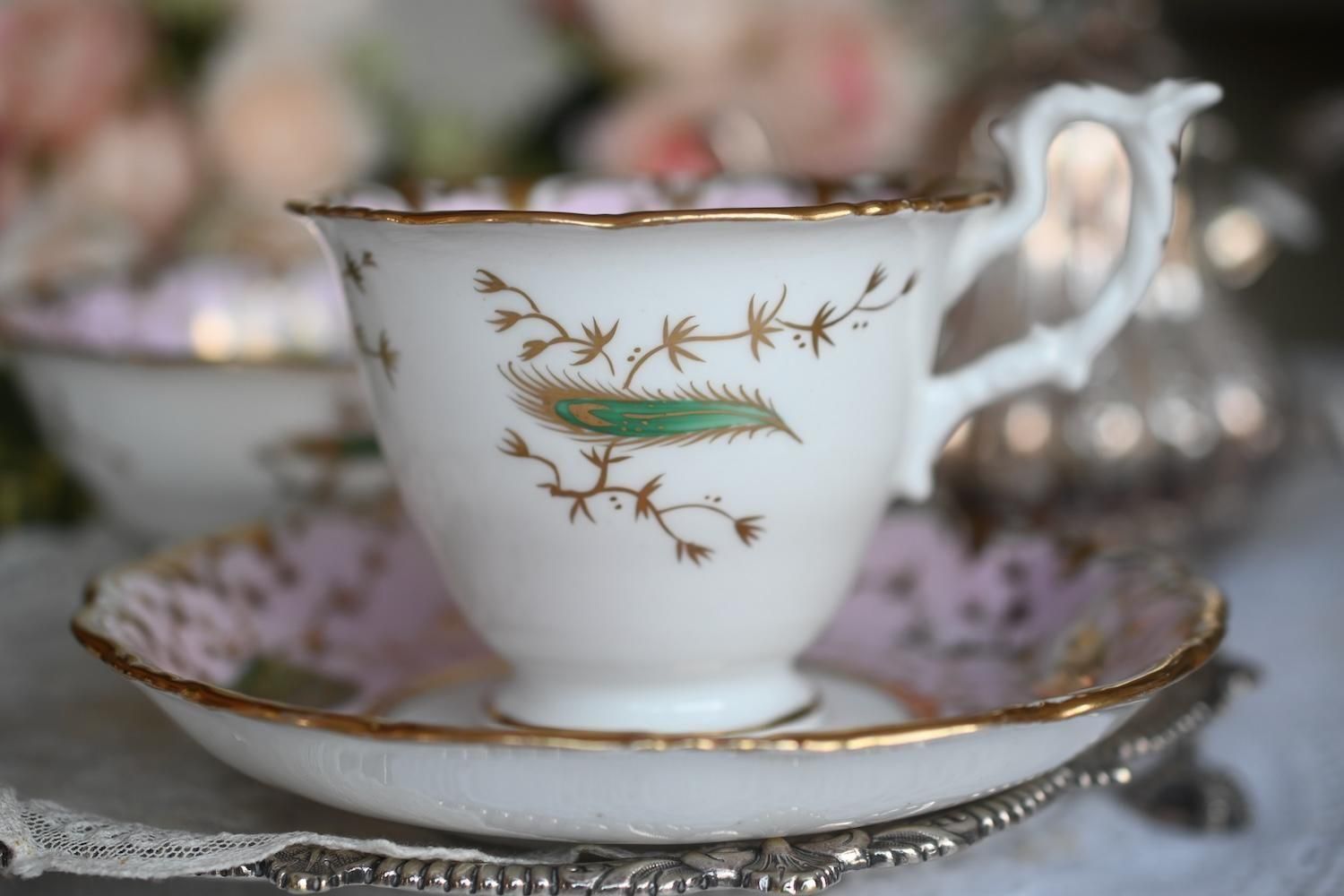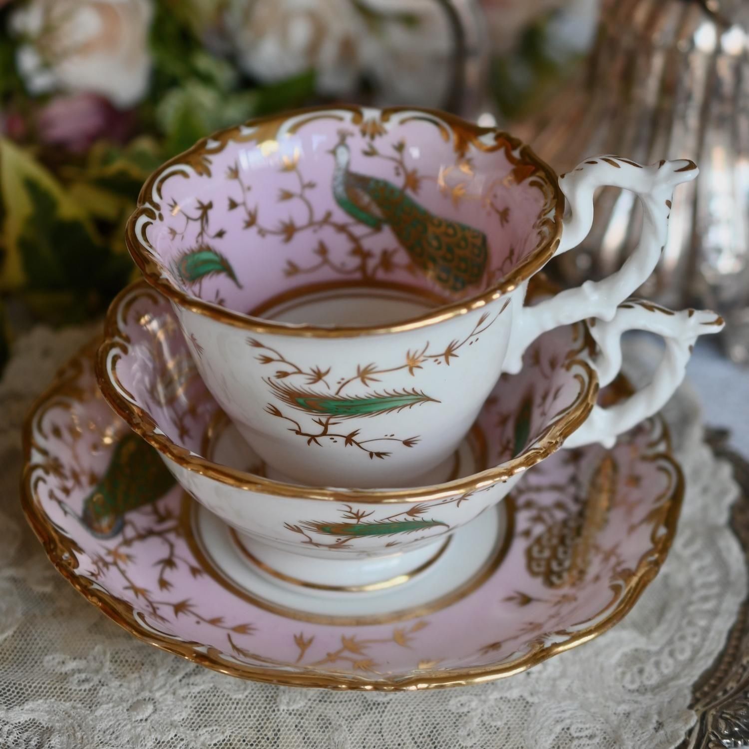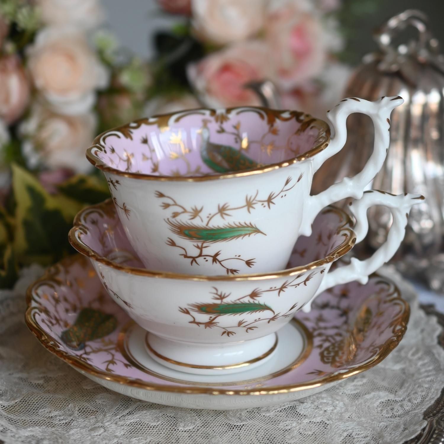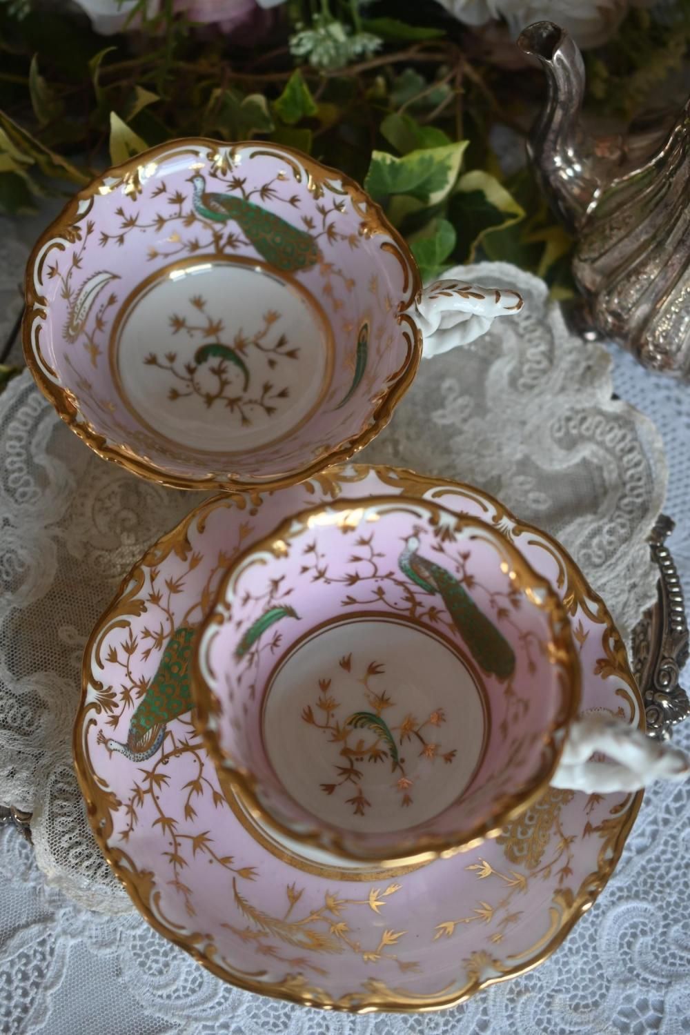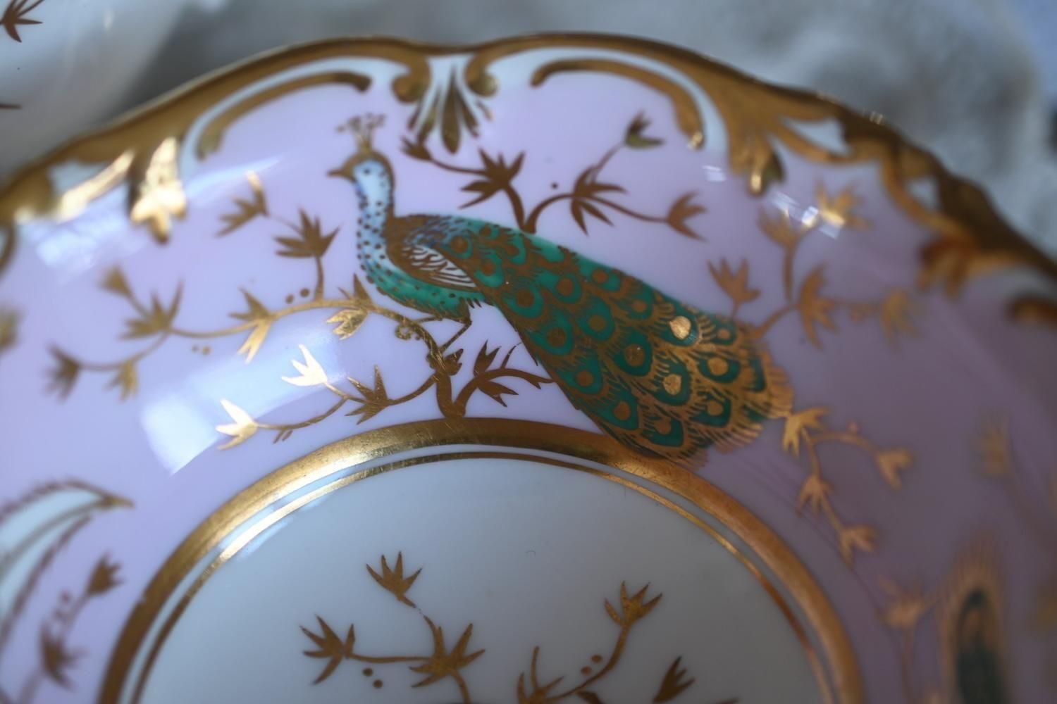 1840年代・ヒルディッチ 緑と金彩の孔雀とピンクのバックグラウンド トゥルートリオ (送料込)