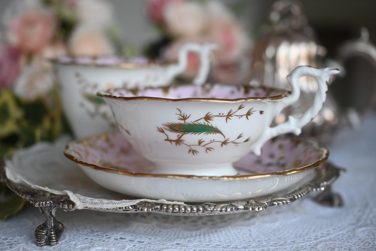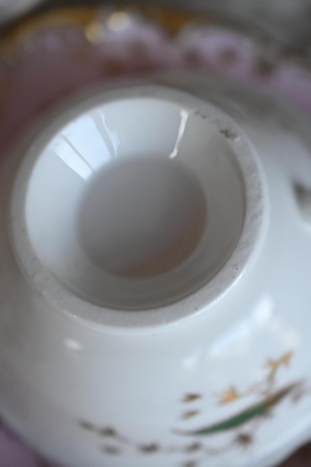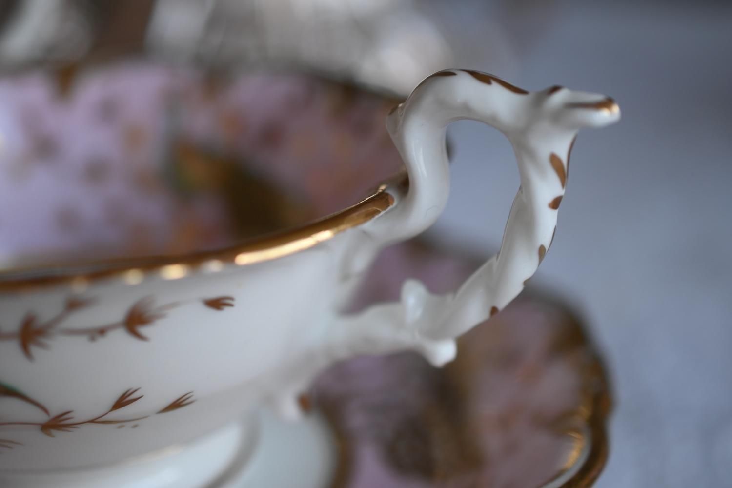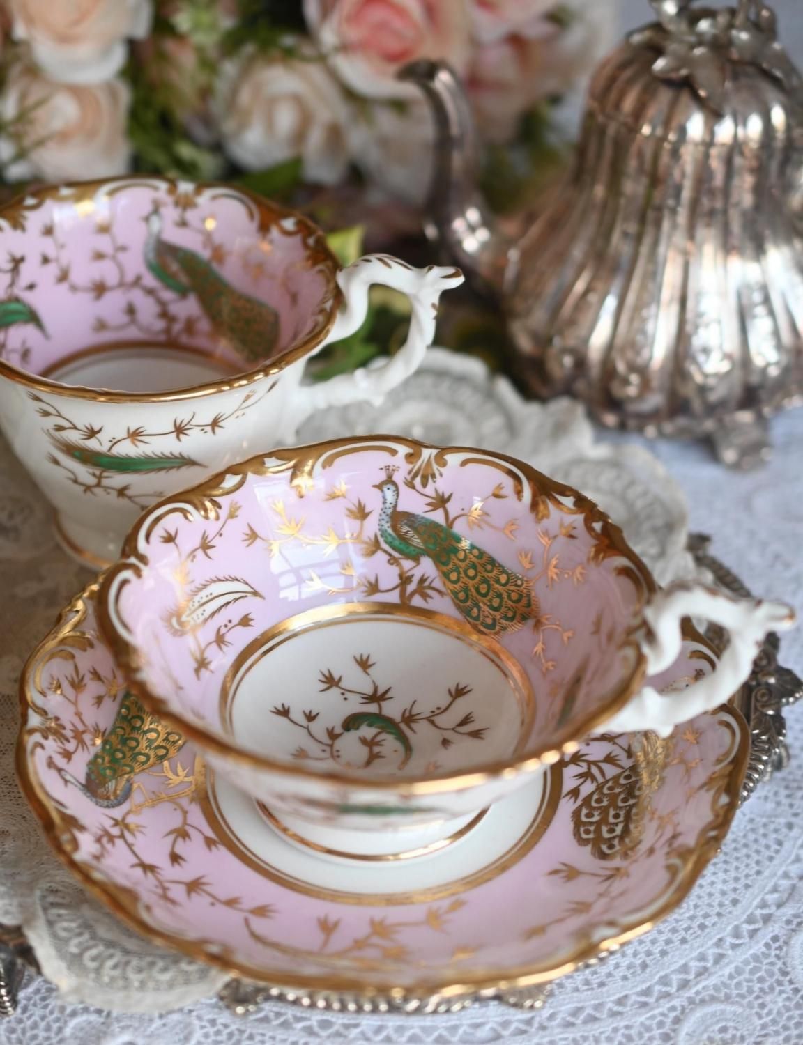 1840年代・ヒルディッチ 緑と金彩の孔雀とピンクのバックグラウンド トゥルートリオ (送料込)