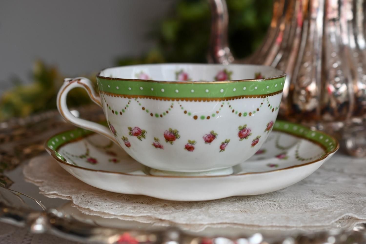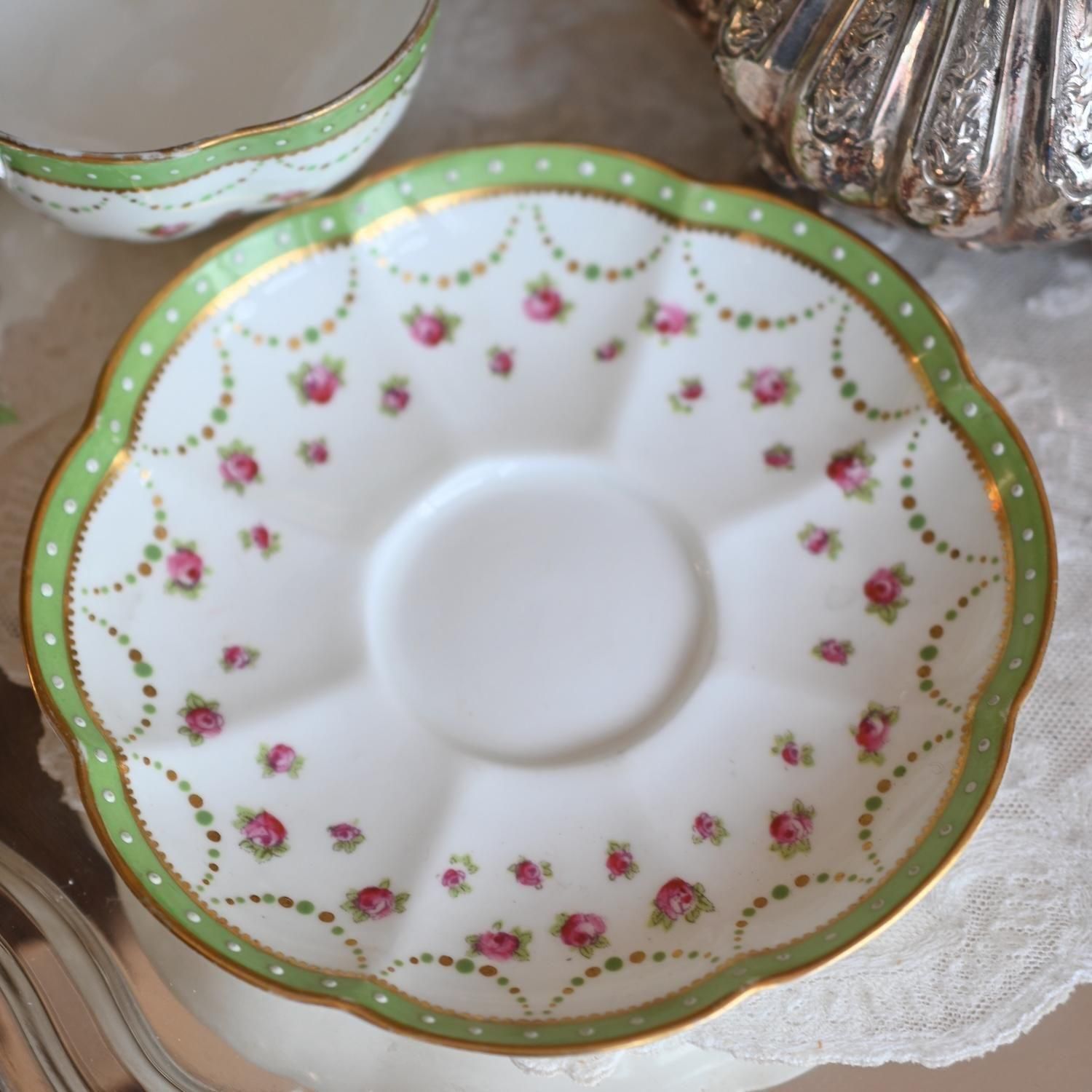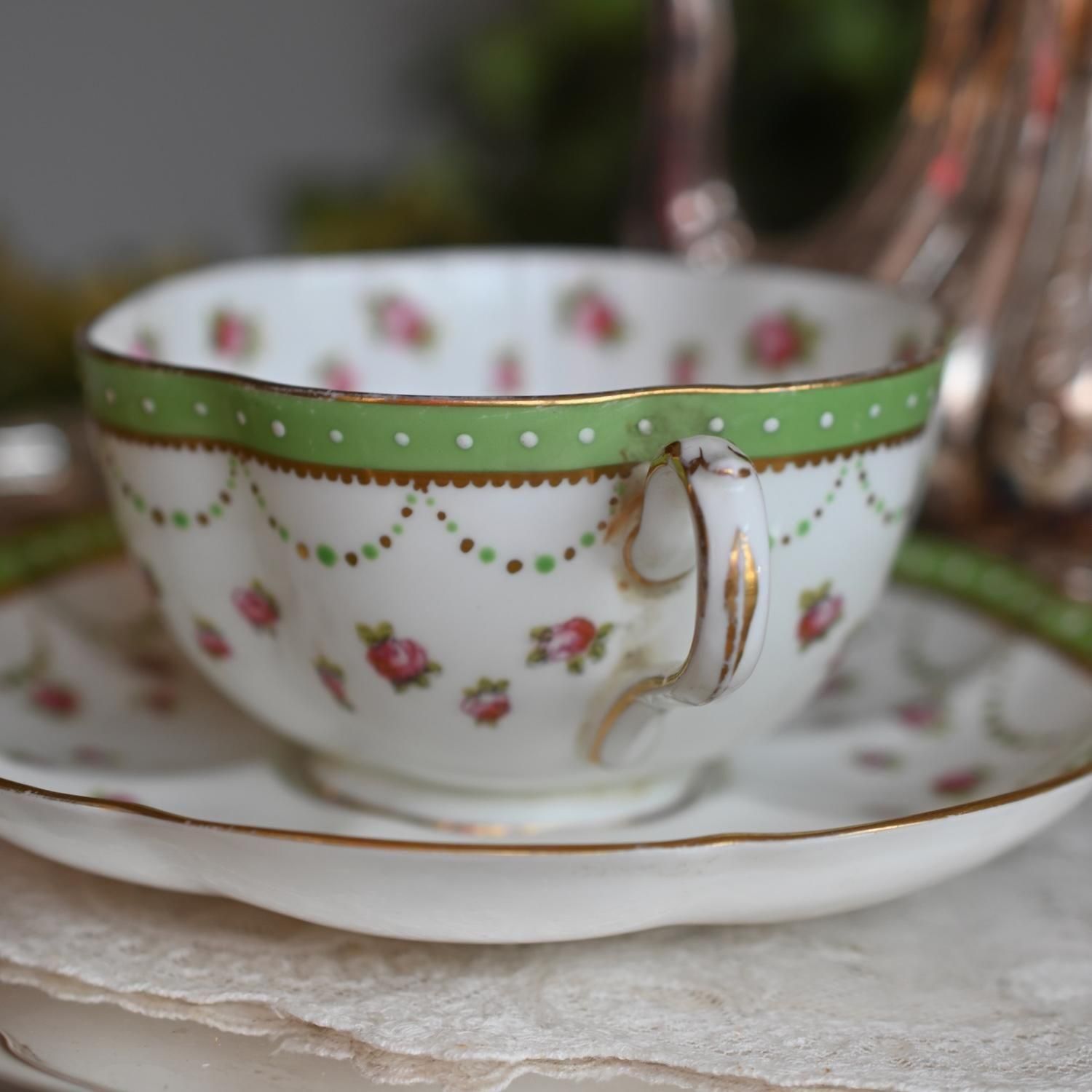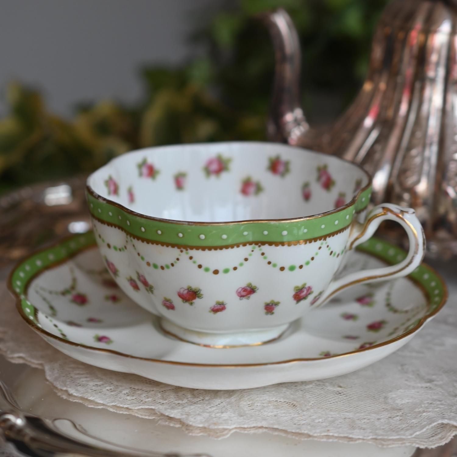ジョージジョーンズ・クレッセント 黄緑色の小さな水玉模様のスワッグ模様が可愛らしいティーカップ&ソーサー (送料込)