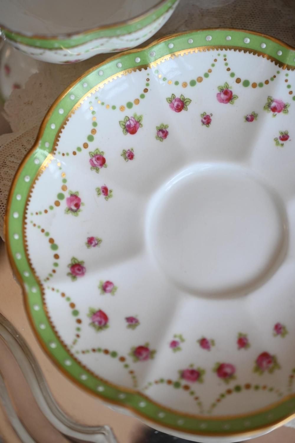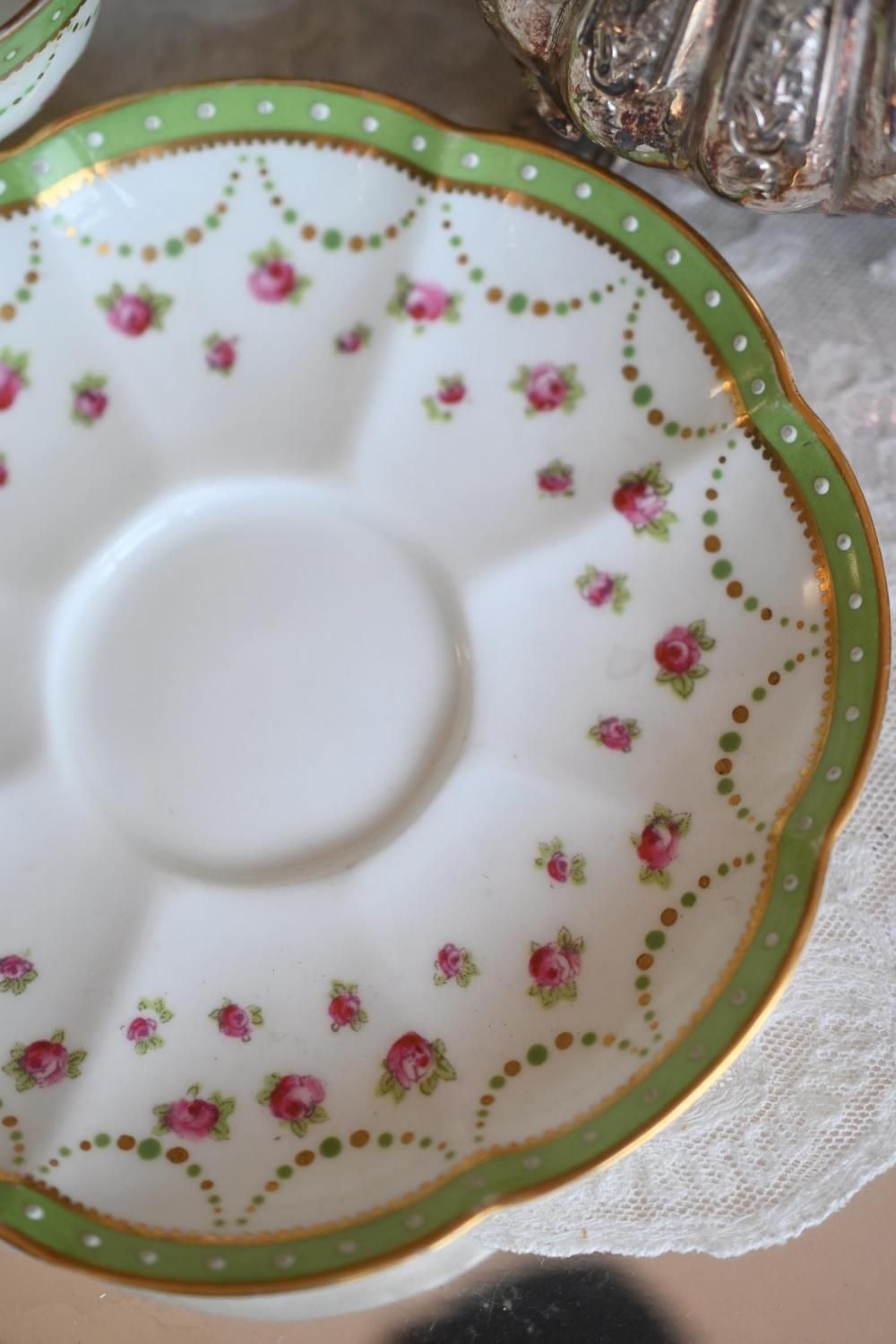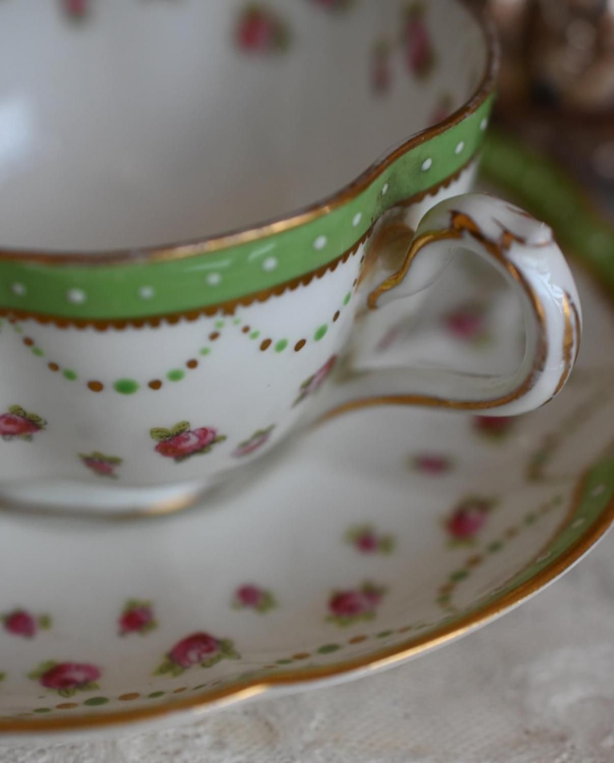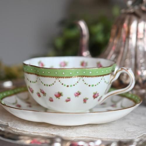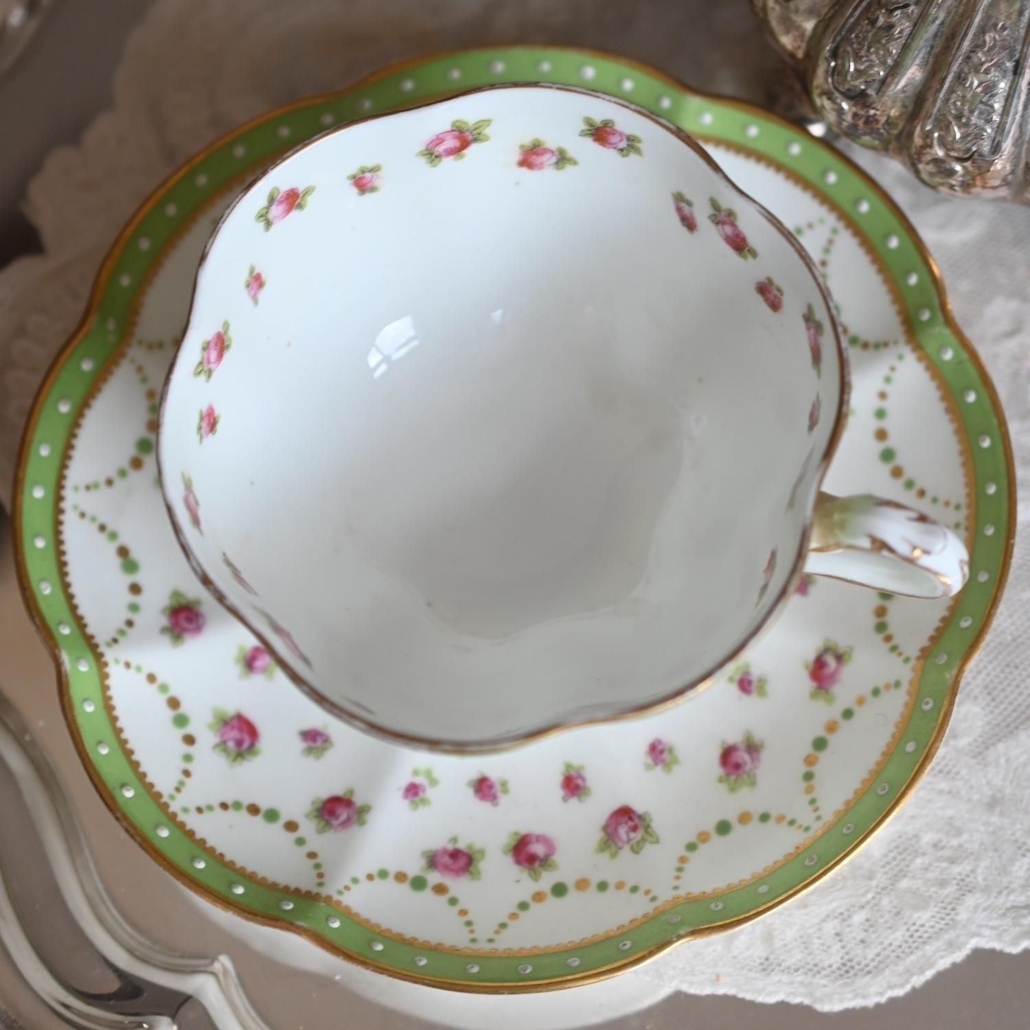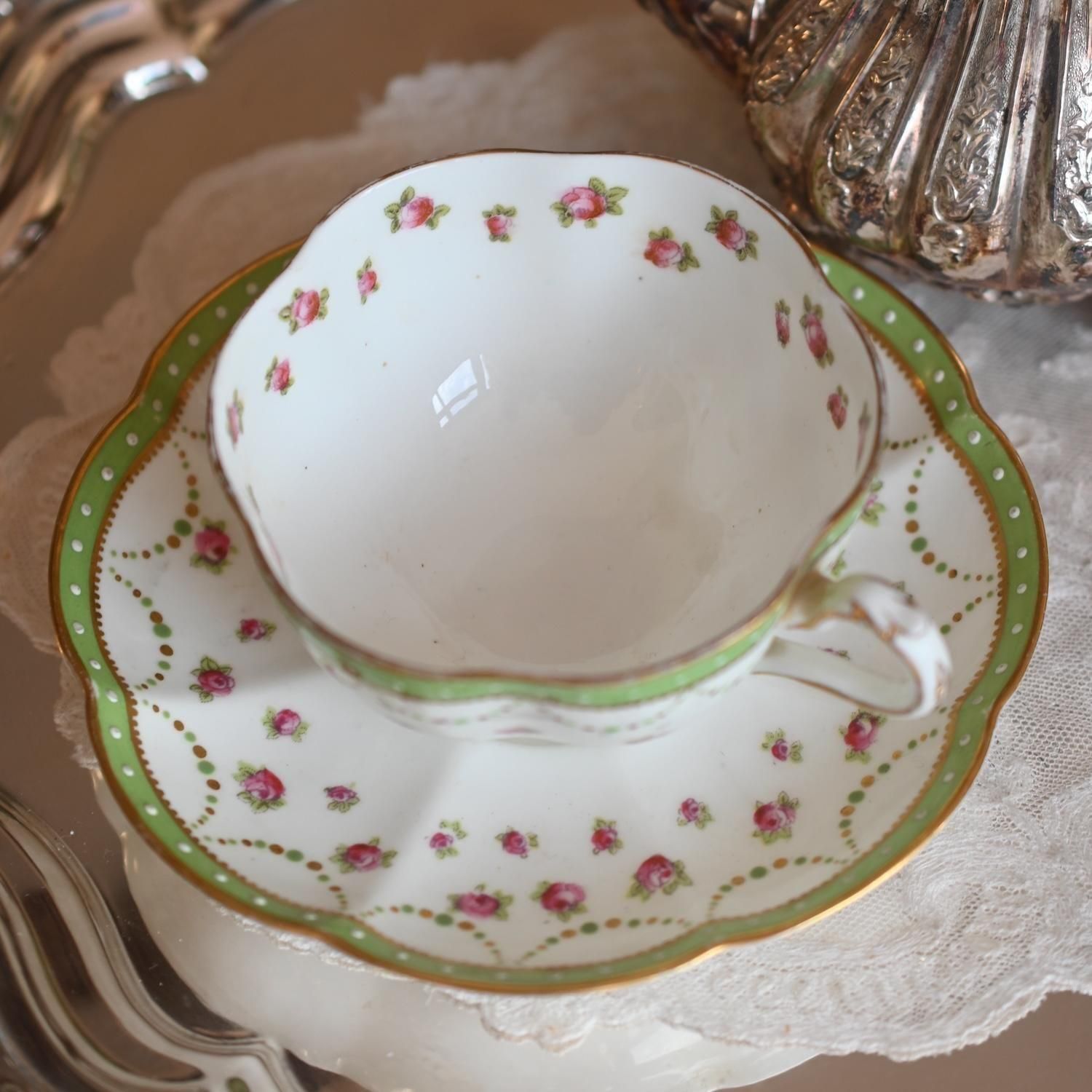 ジョージジョーンズ・クレッセント 黄緑色の小さな水玉模様のスワッグ模様が可愛らしいティーカップ&ソーサー (送料込)
