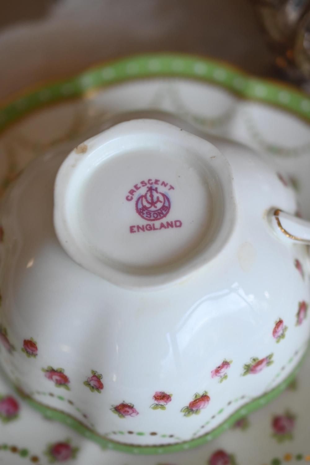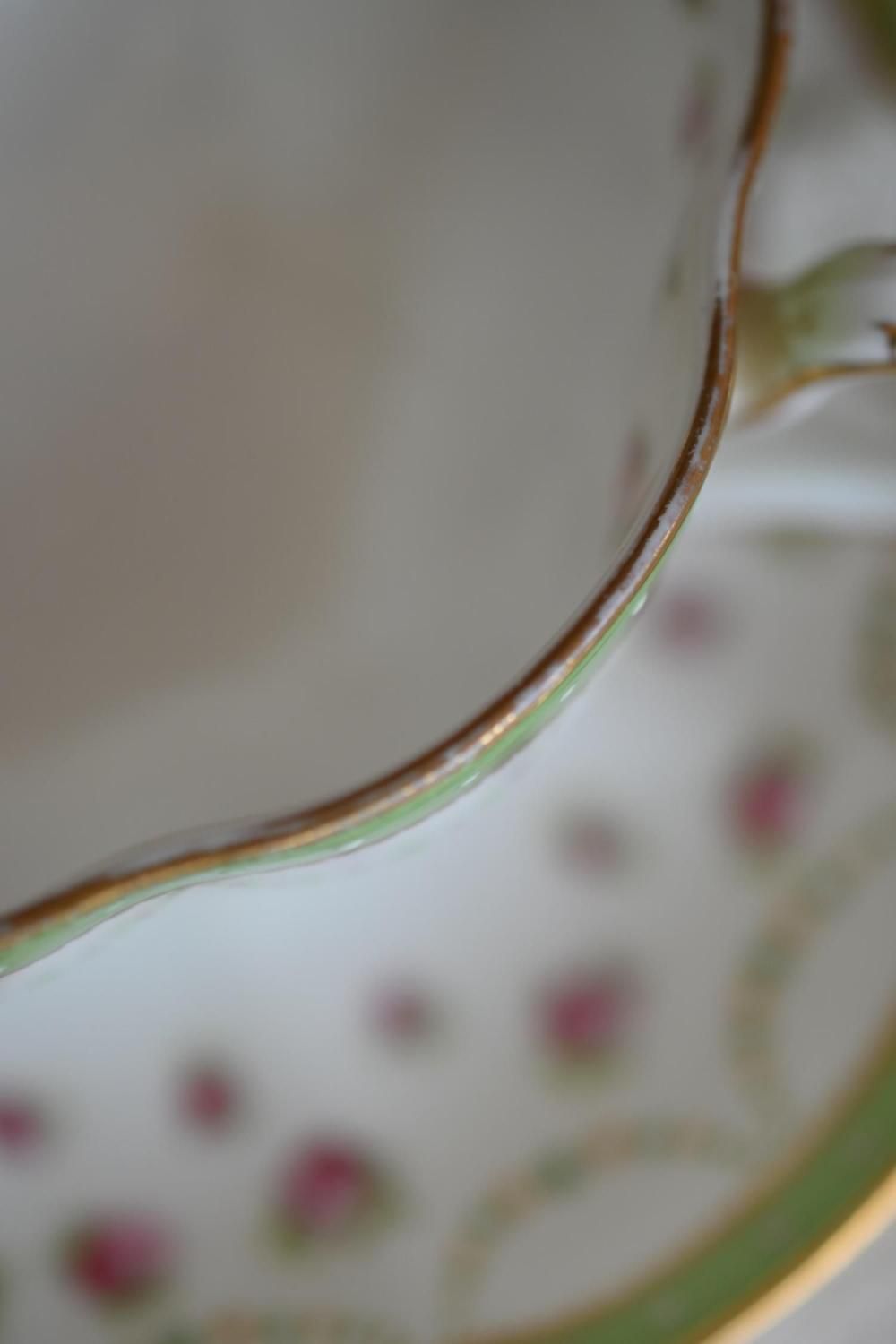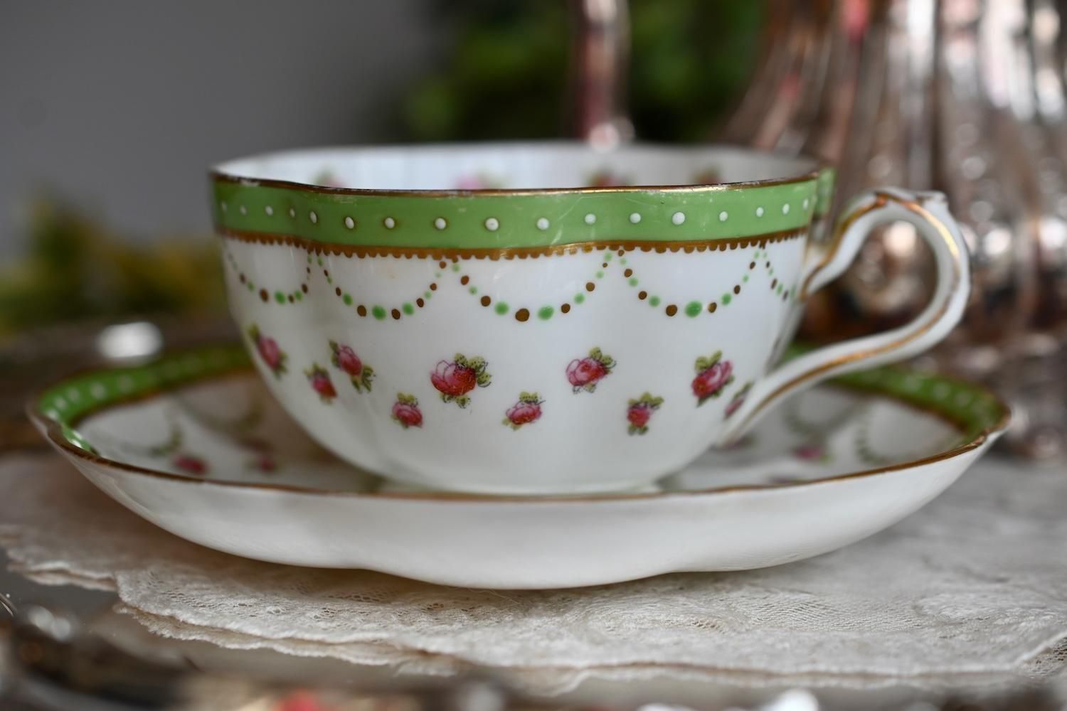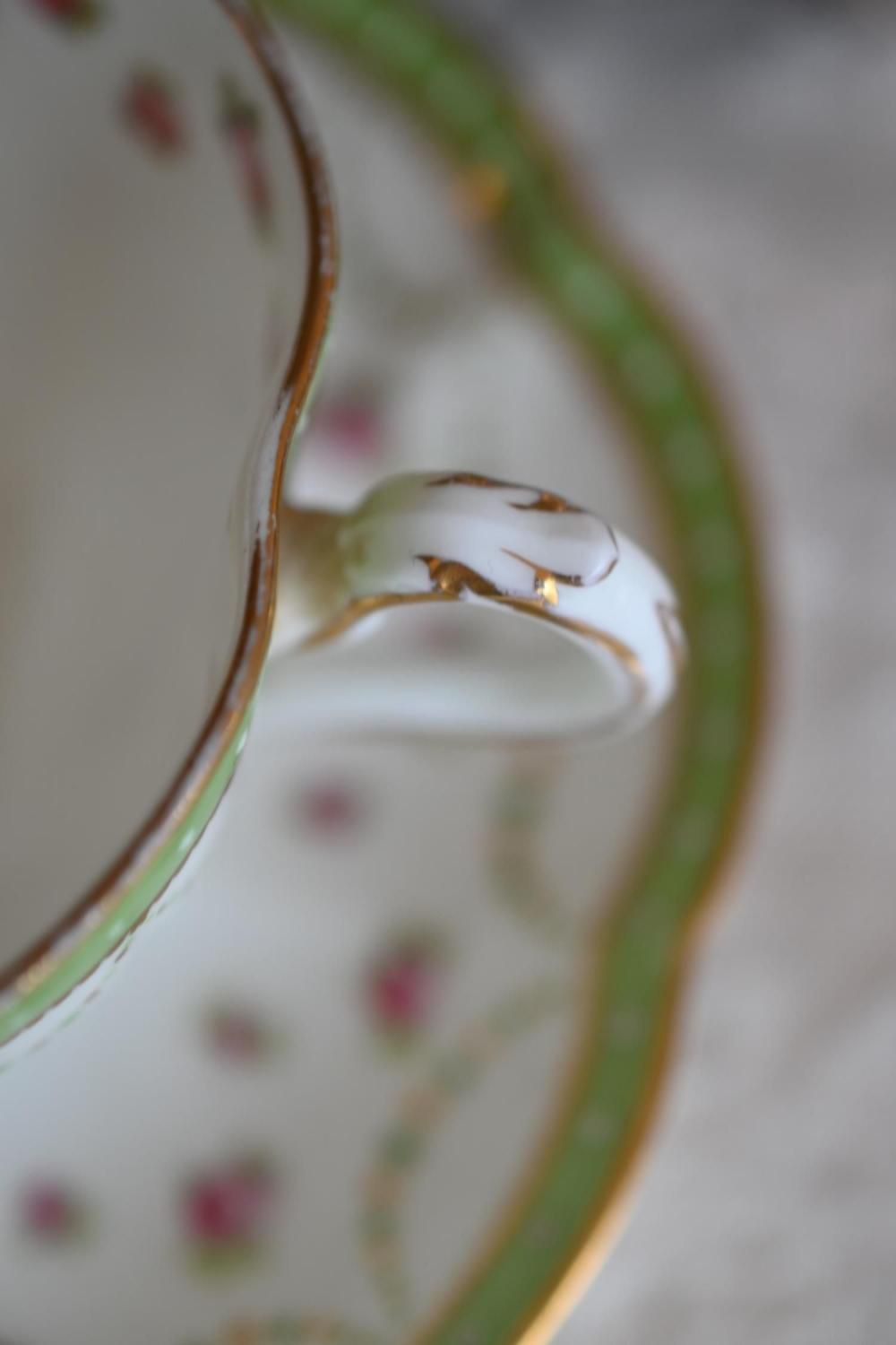 ジョージジョーンズ・クレッセント 黄緑色の小さな水玉模様のスワッグ模様が可愛らしいティーカップ&ソーサー (送料込)