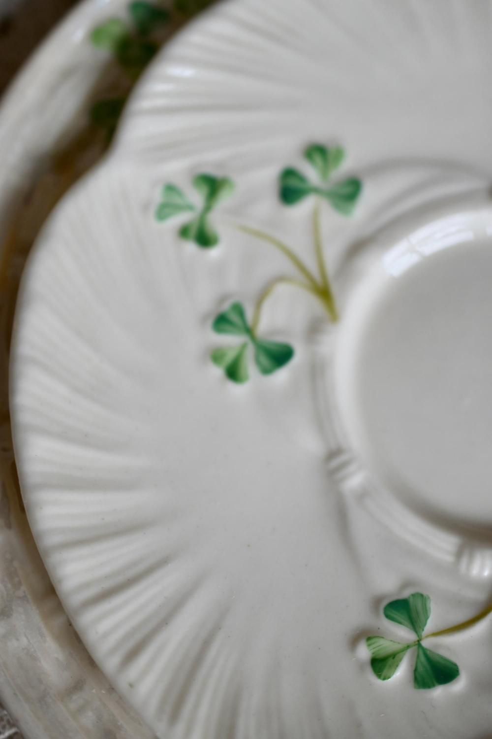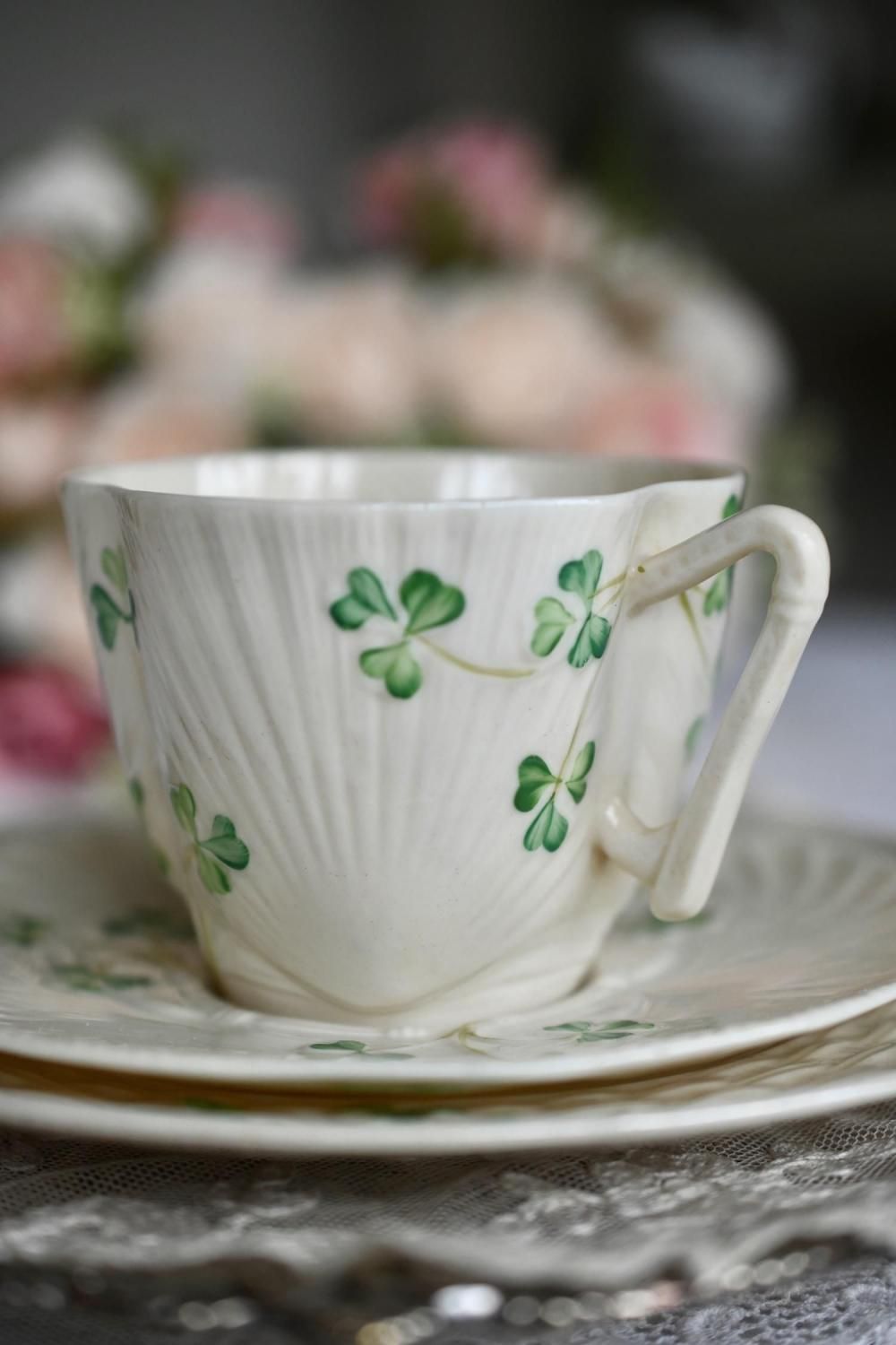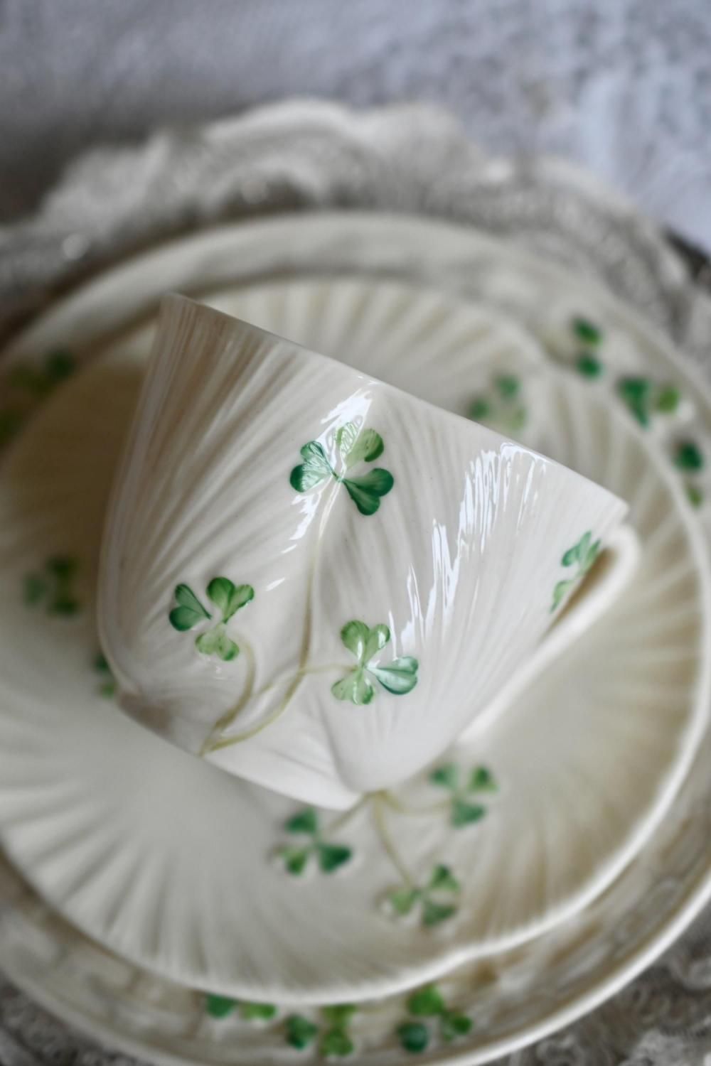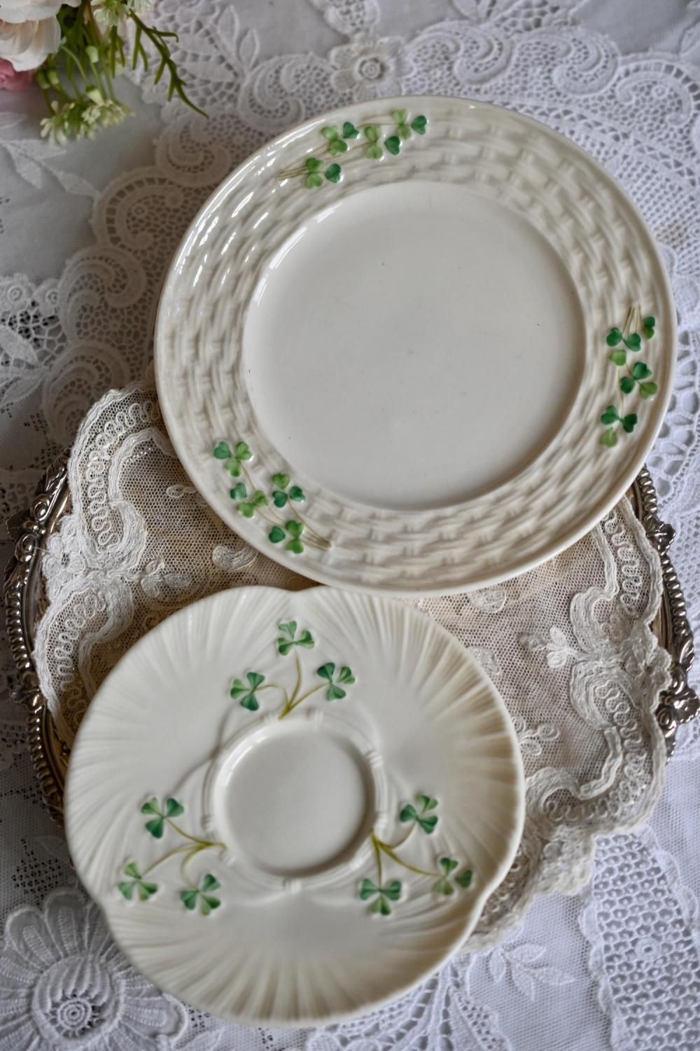 1960年代 ベリーク シャムロックのカップ&ソーサーとバスケット模様のケーキプレートのトリオ(送料込)