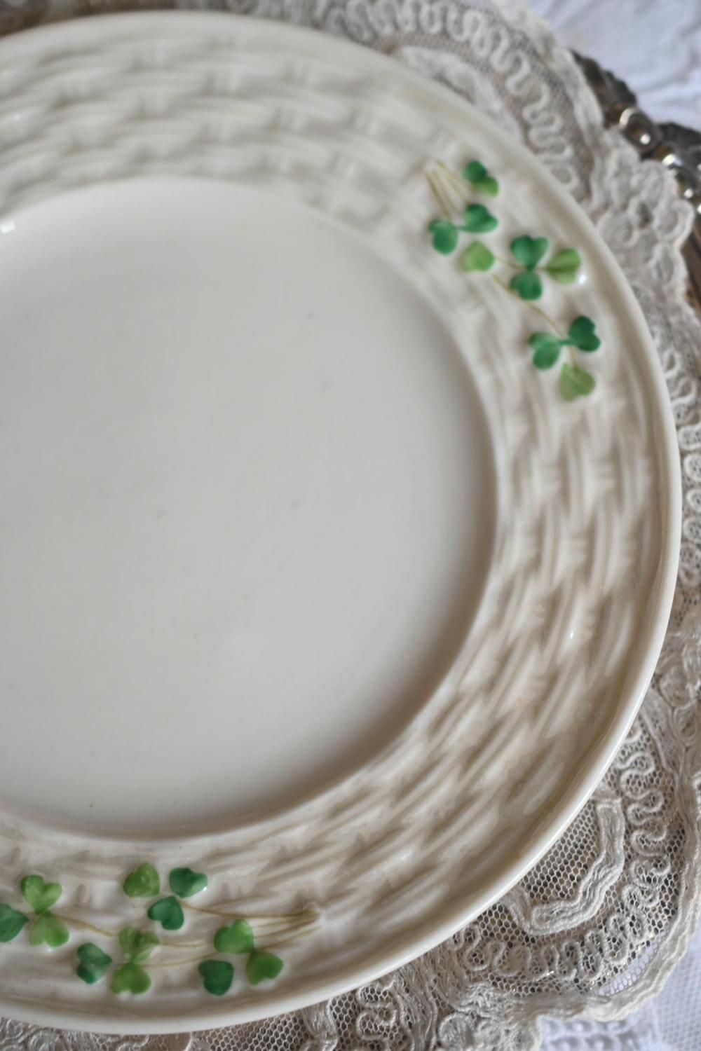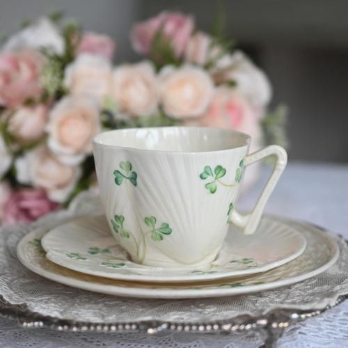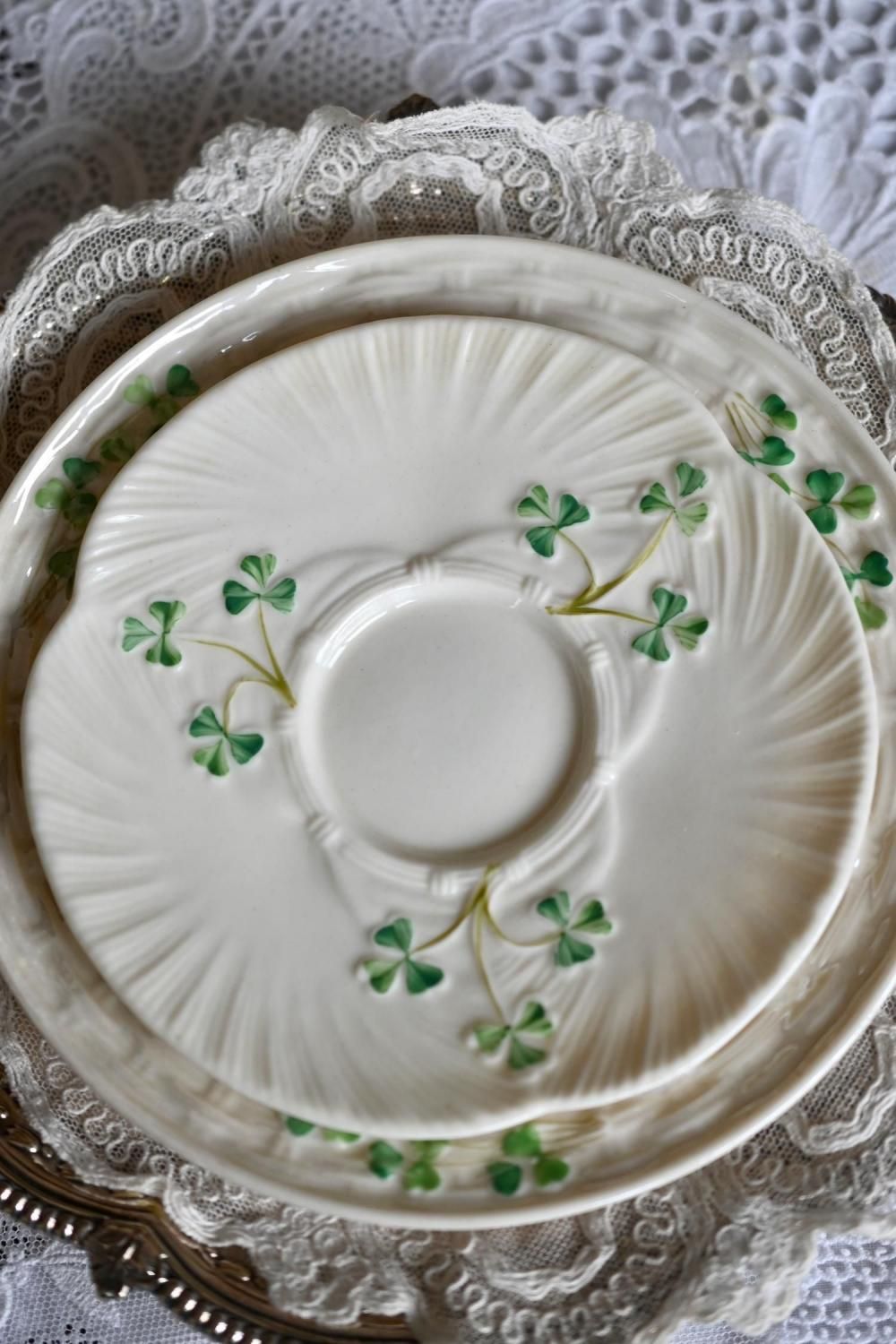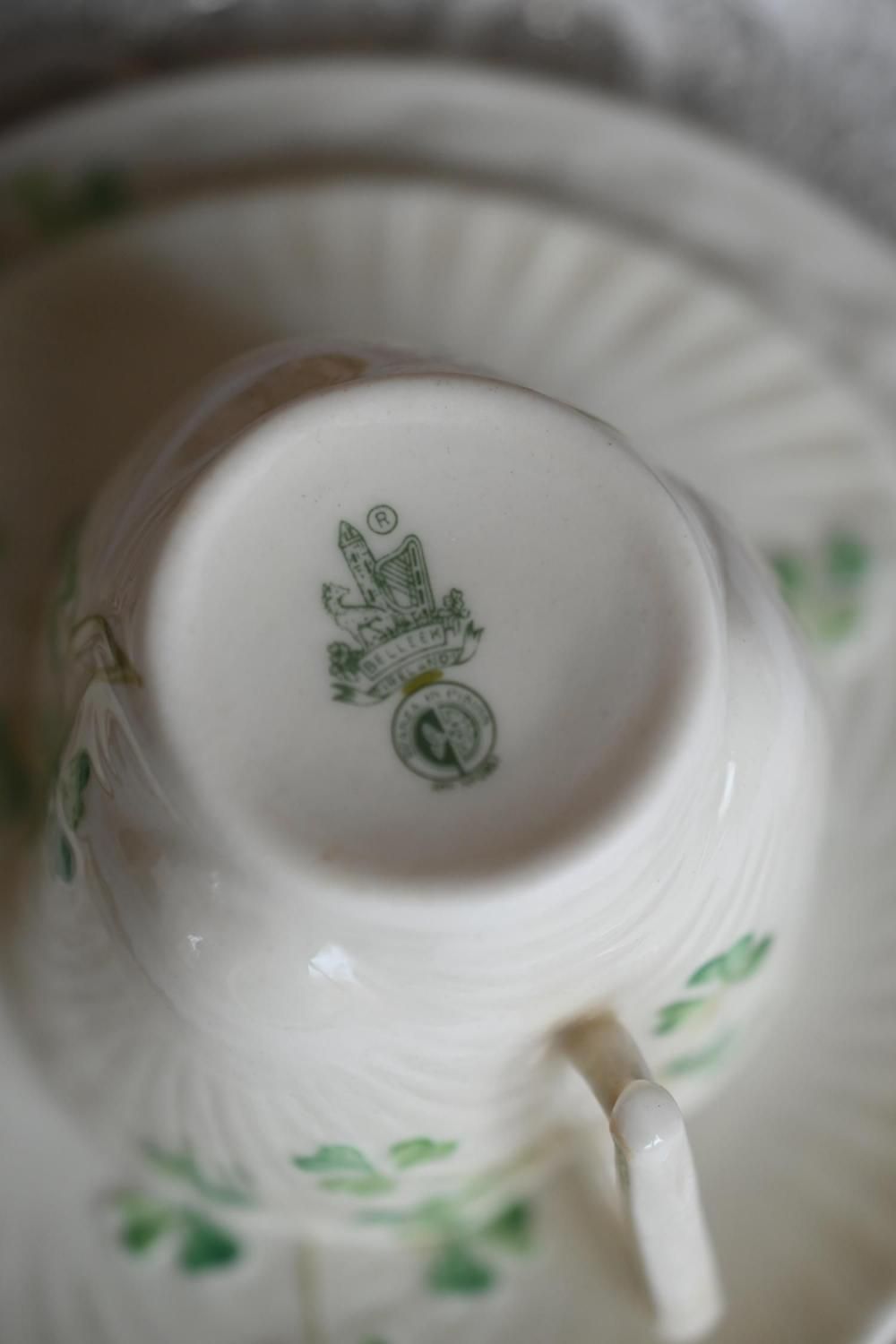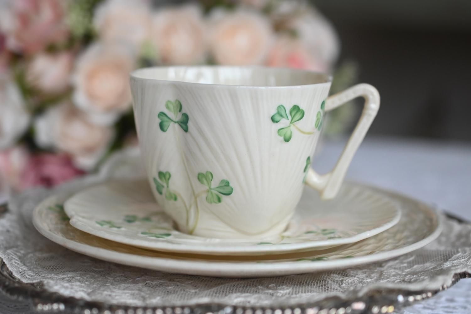1960年代 ベリーク シャムロックのカップ&ソーサーとバスケット模様のケーキプレートのトリオ(送料込)