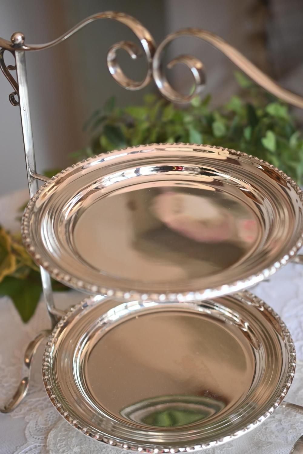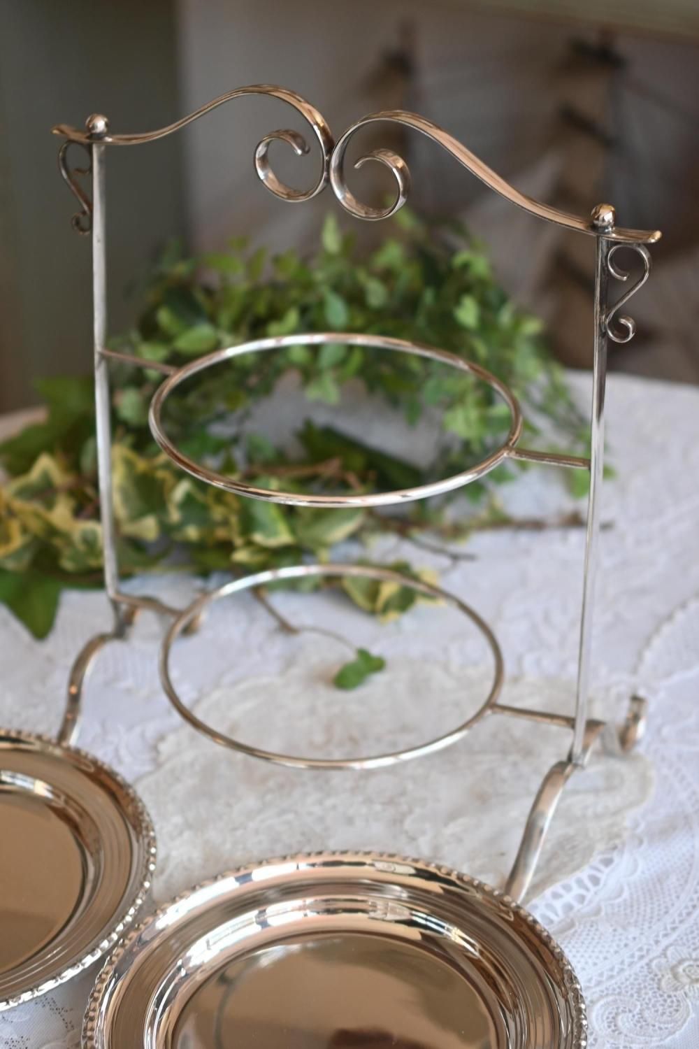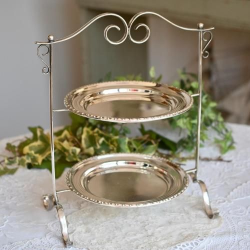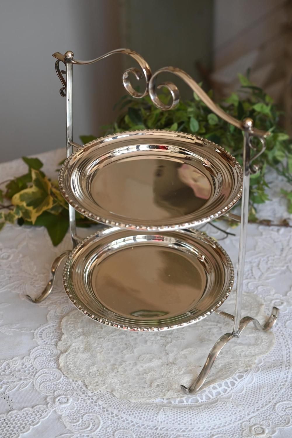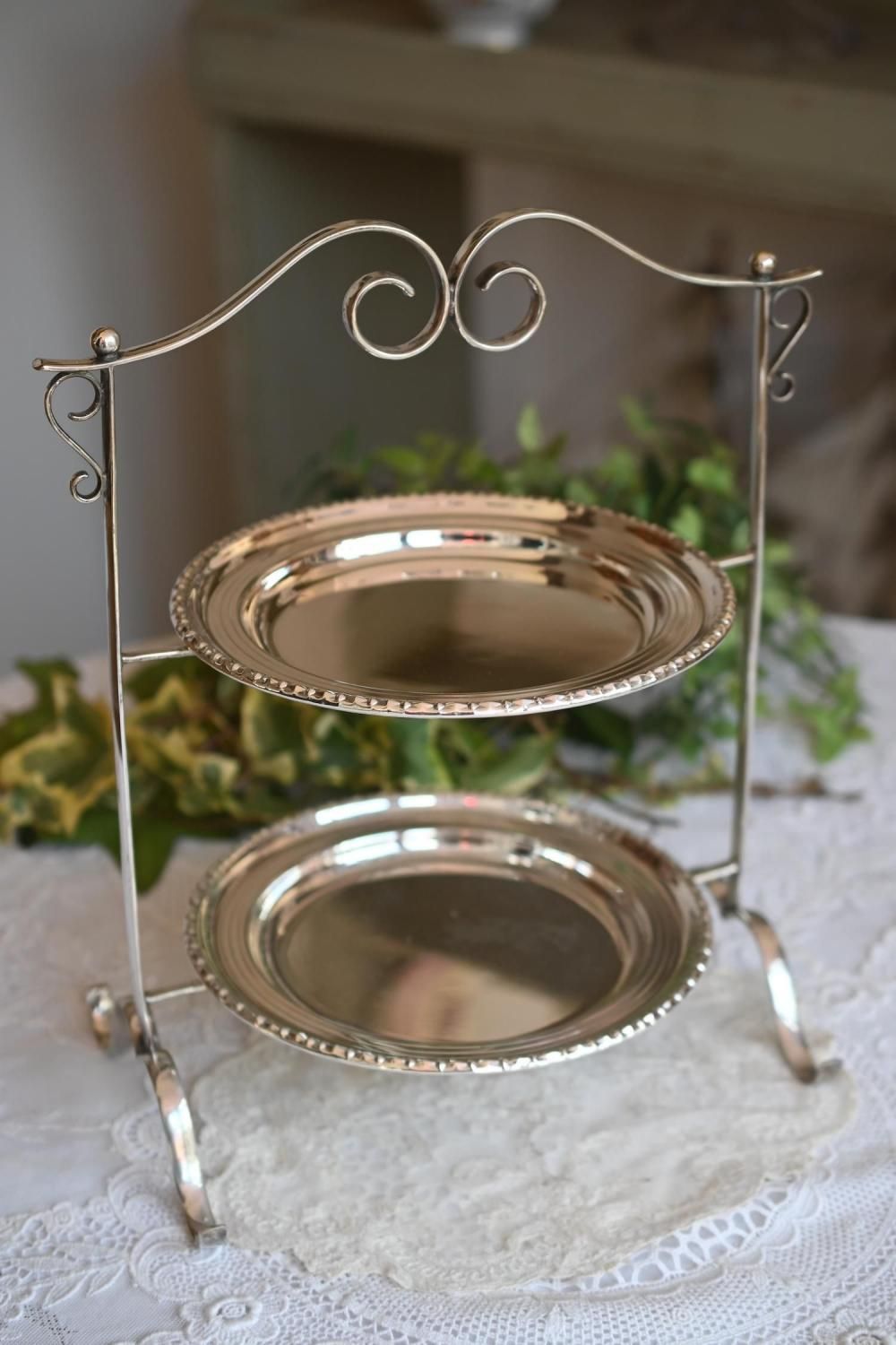 シルバープレート製の、シルバープレートのお皿もついている2段アフタヌーンティースタンドになります。