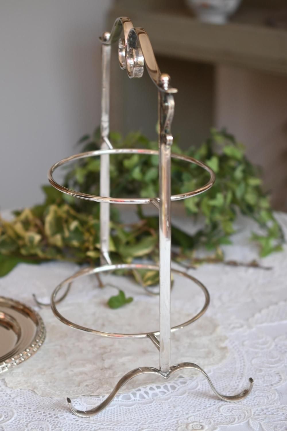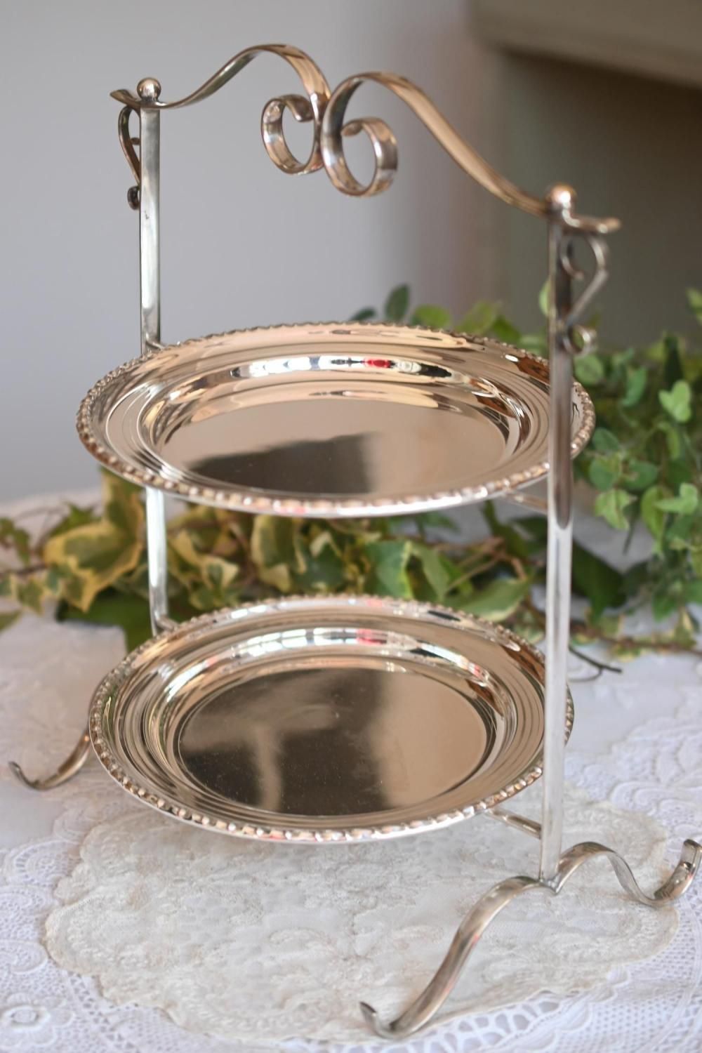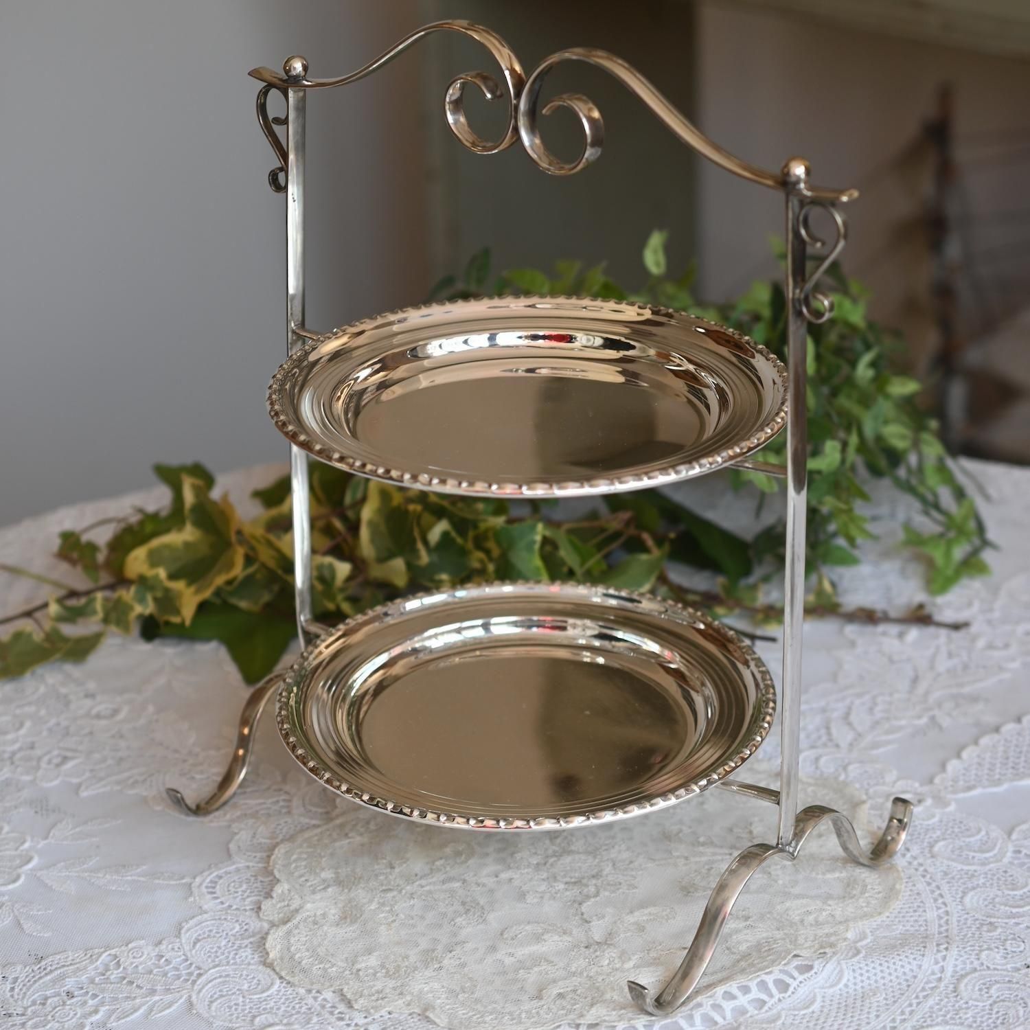 シルバープレート製 クルンとしたハンドルが可愛らしい 2段アフタヌーンティースタンド シルバープレートのお皿付き (送料込)