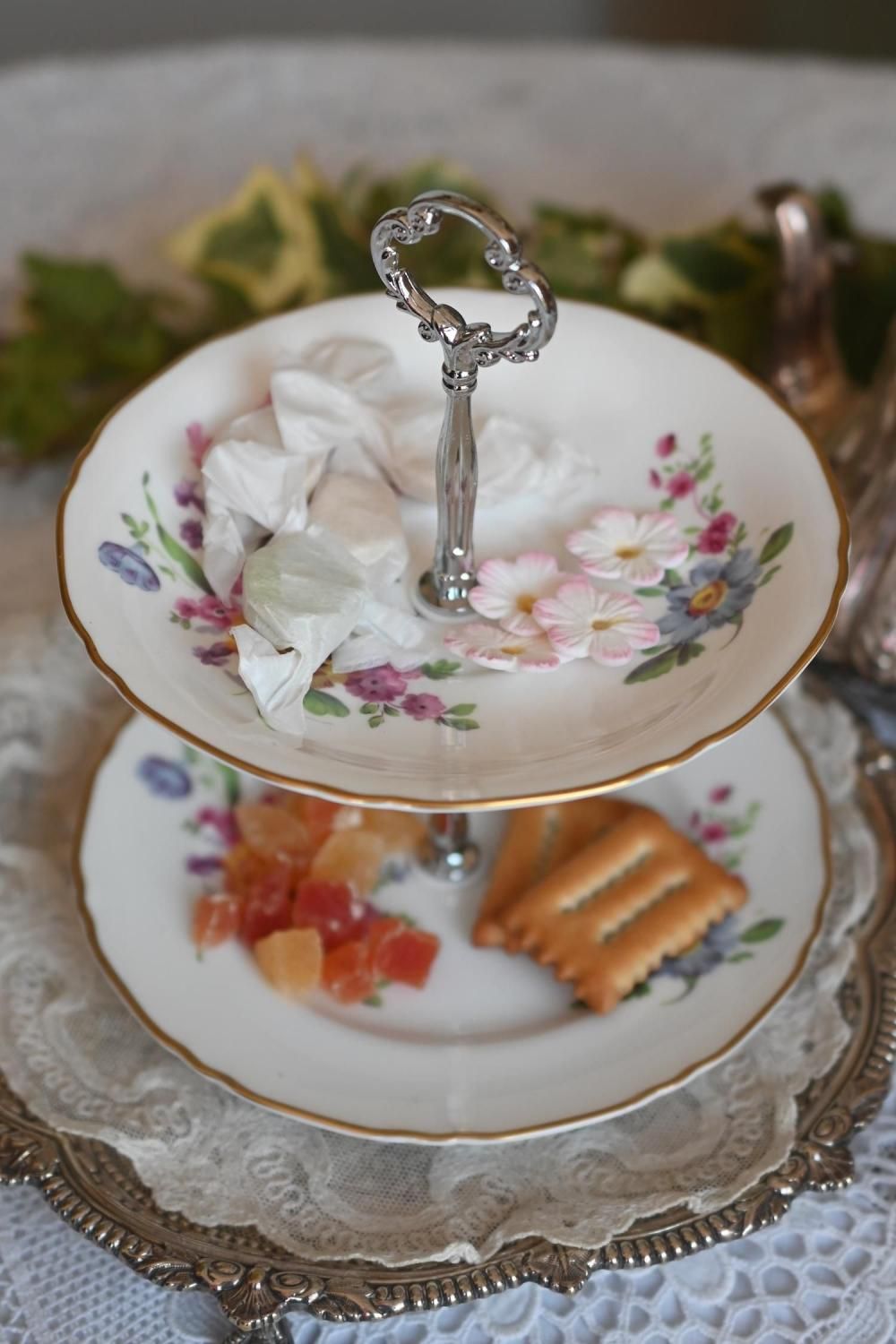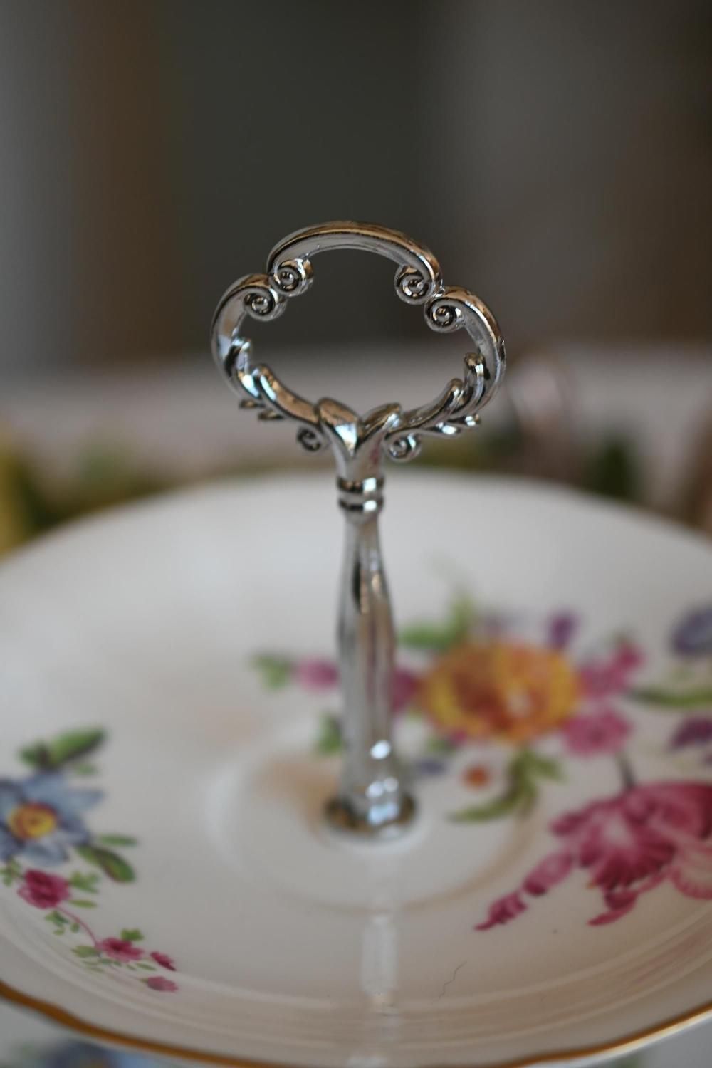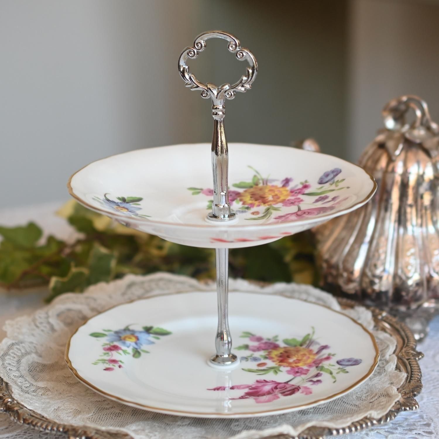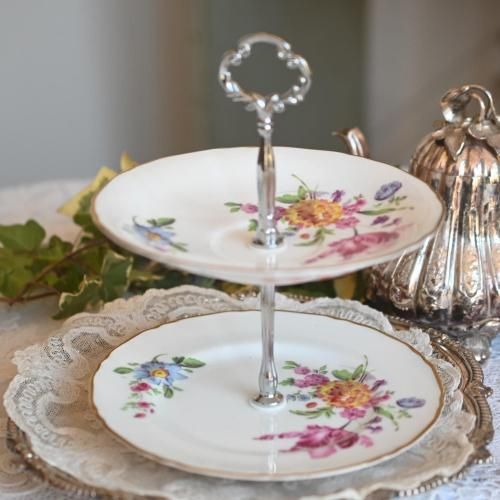 ドロワーオリジナル お花模様のお皿が可愛らしい2段アフタヌーンティースタンド (シルバーハンドル) (送料込)