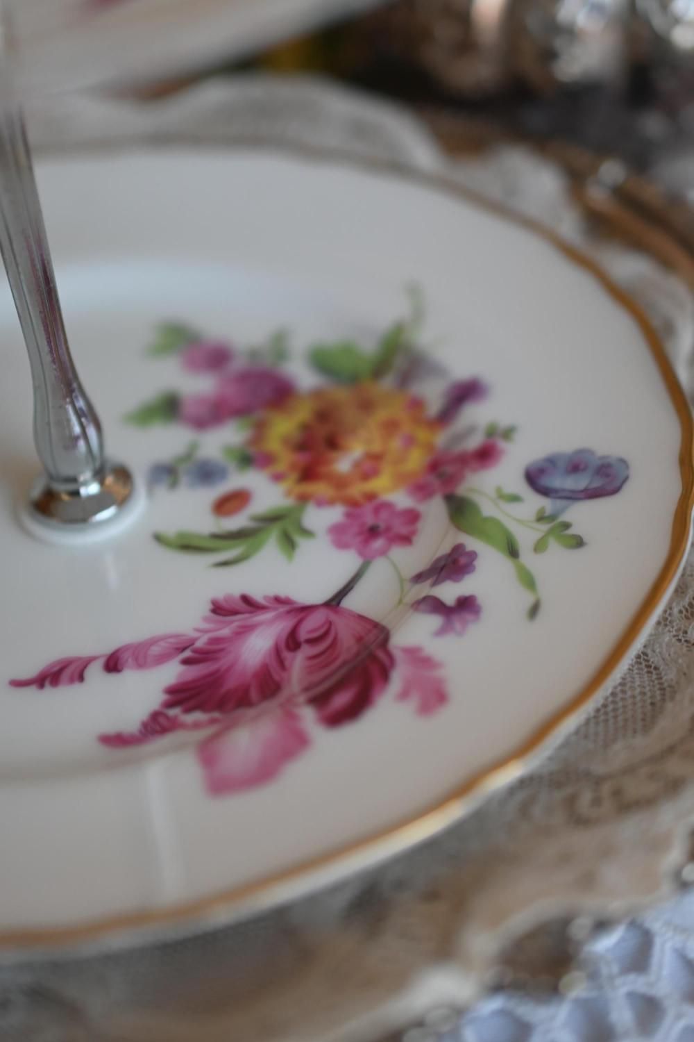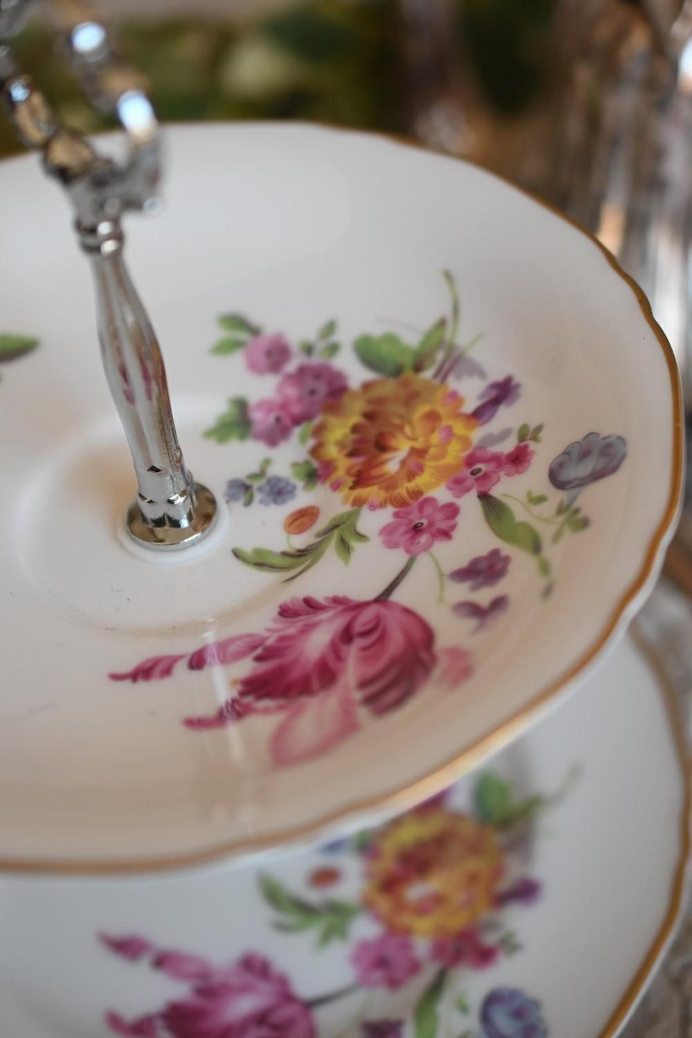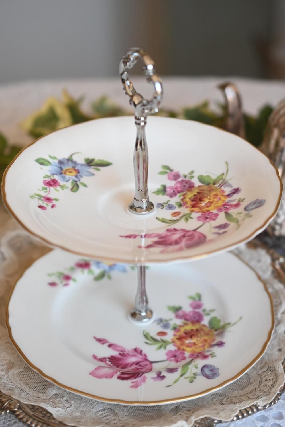 ドロワーオリジナル お花模様のお皿が可愛らしい2段アフタヌーンティースタンド (シルバーハンドル) (送料込)